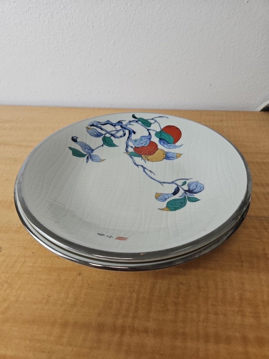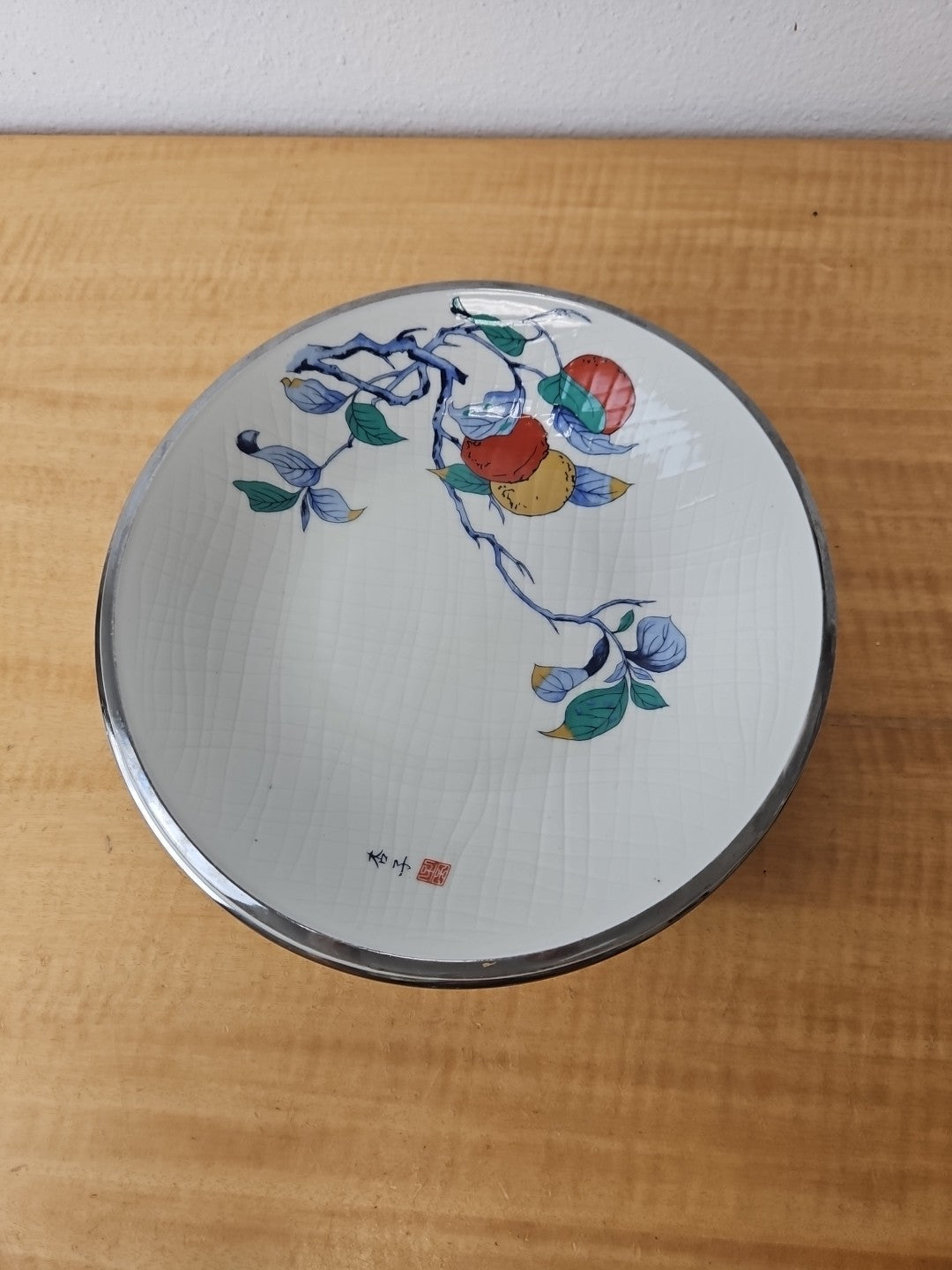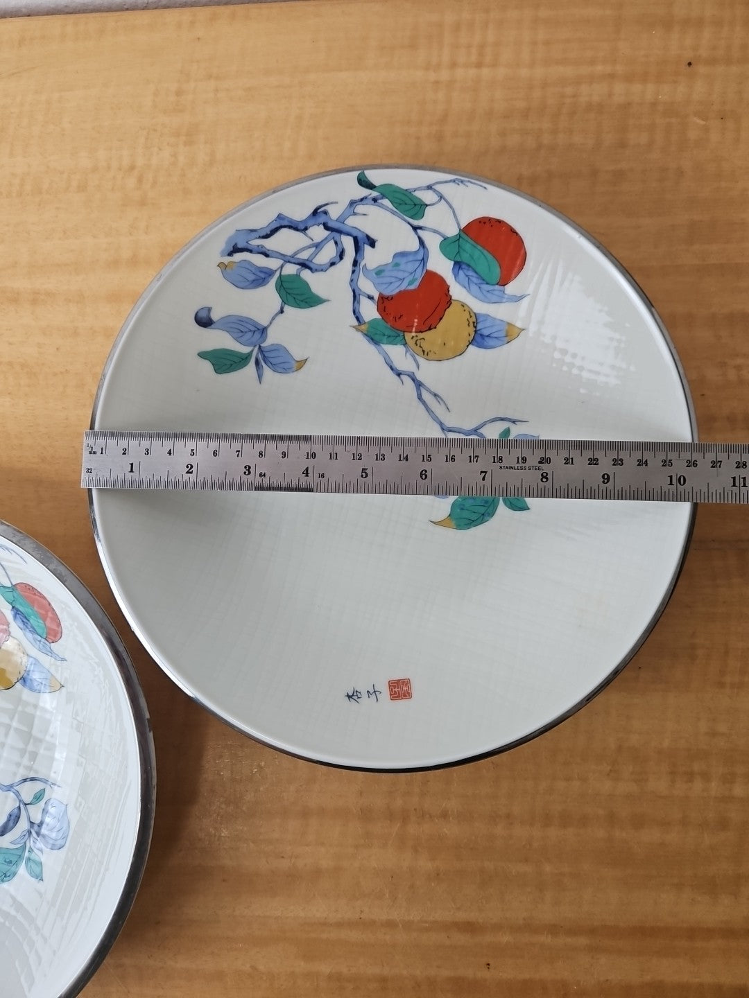 2 Beautiful Vintage Japanese Porcelain bowls, silver rim apricot 10", 10 1/2"