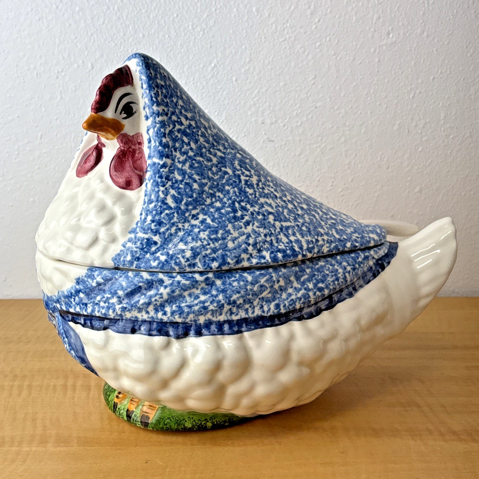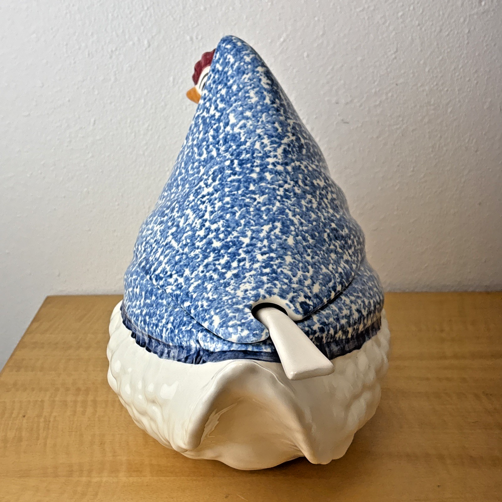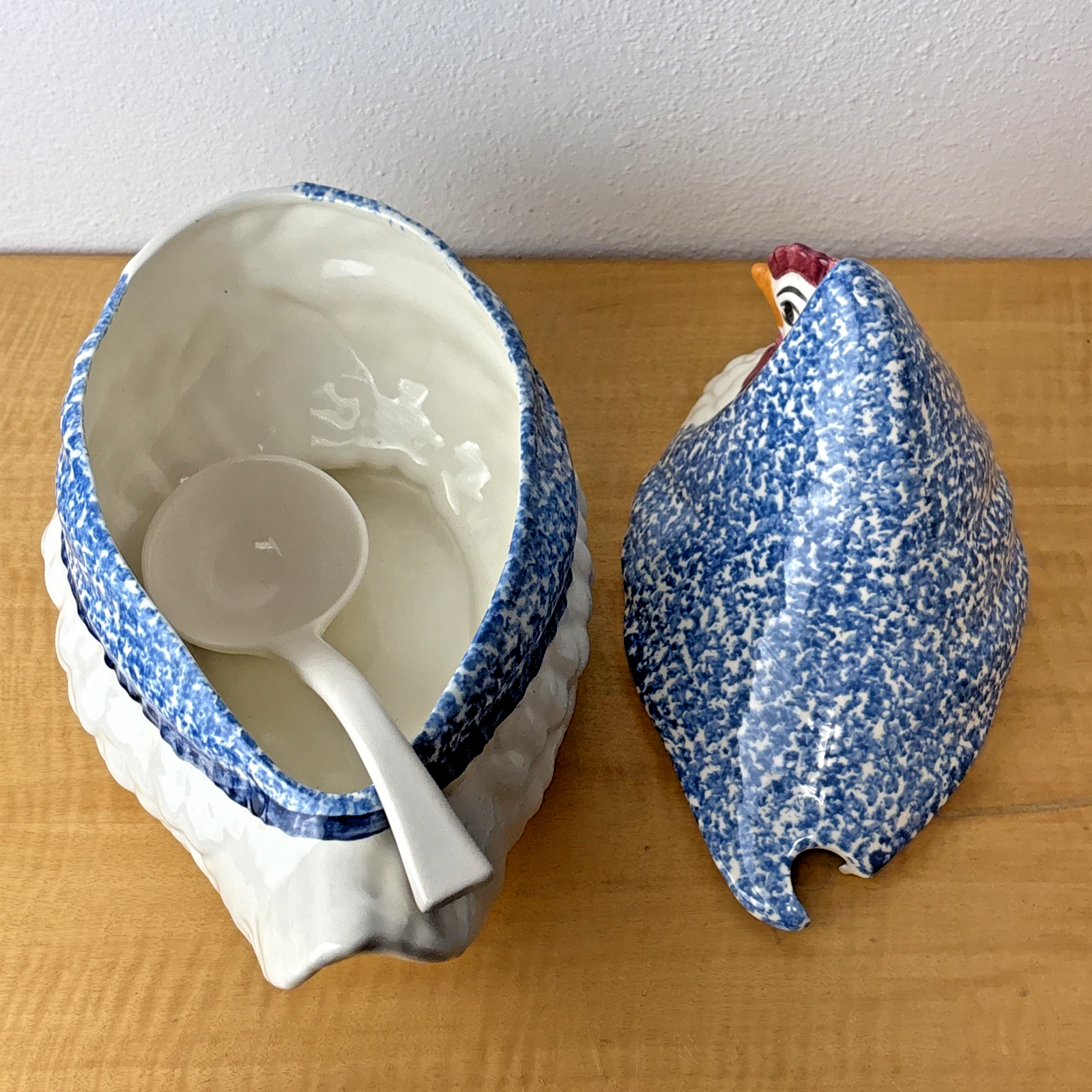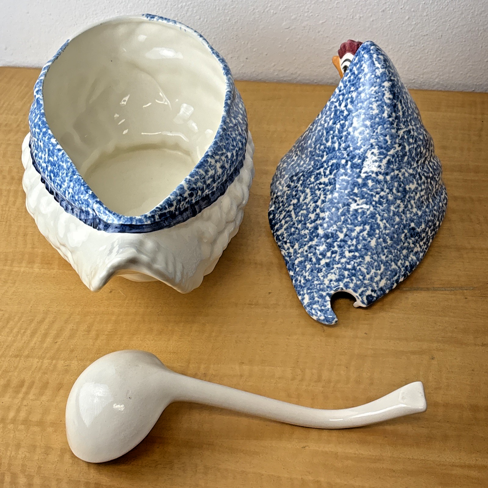 3 PC NS Gustin Calif Pottery Soup Tureen W/ Ladle Blue Spongeware Hen Chicken