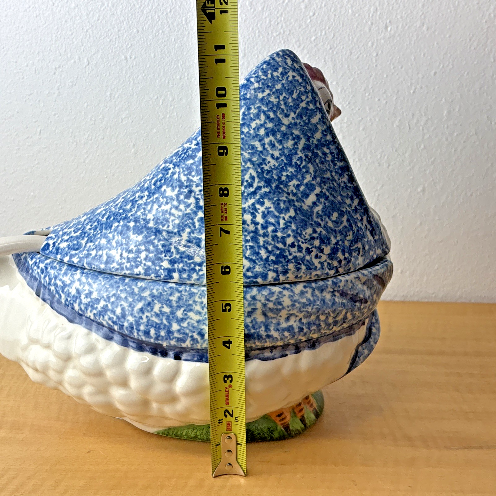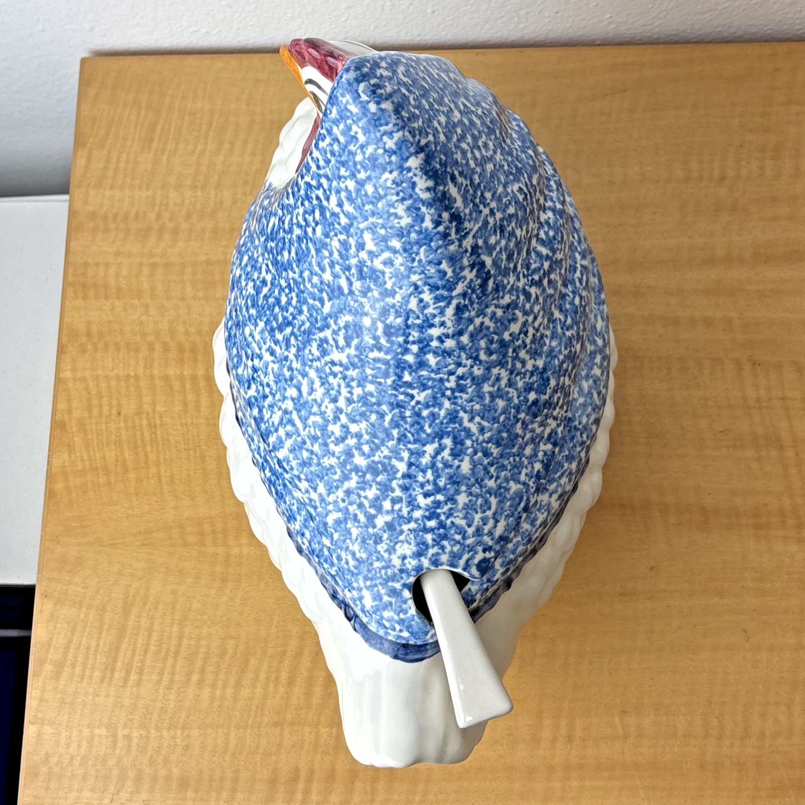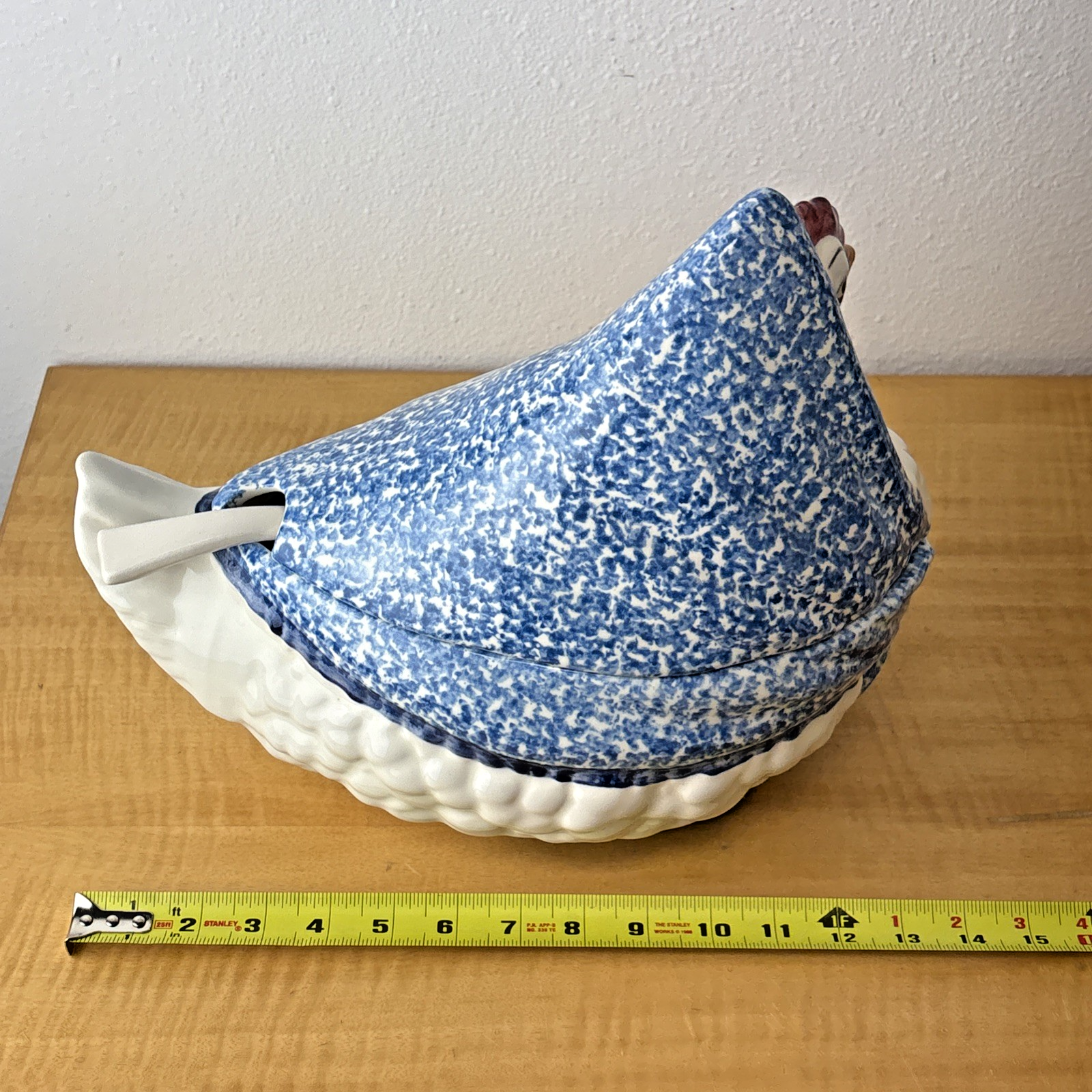 3 PC NS Gustin Calif Pottery Soup Tureen W/ Ladle Blue Spongeware Hen Chicken