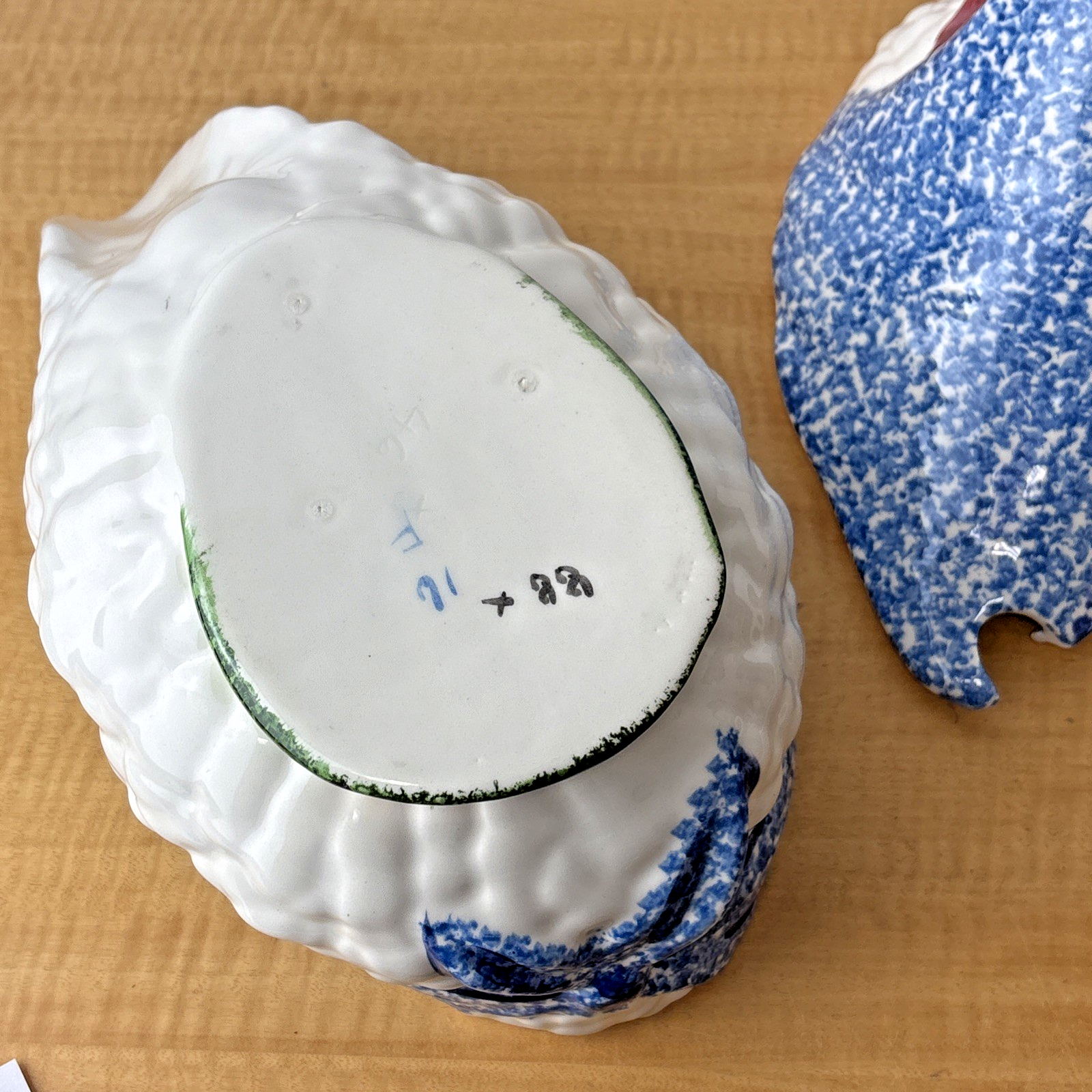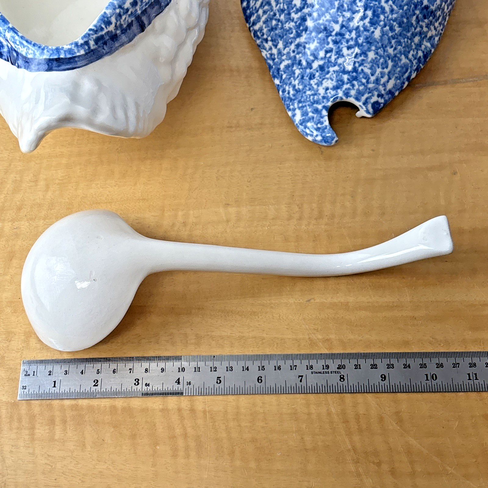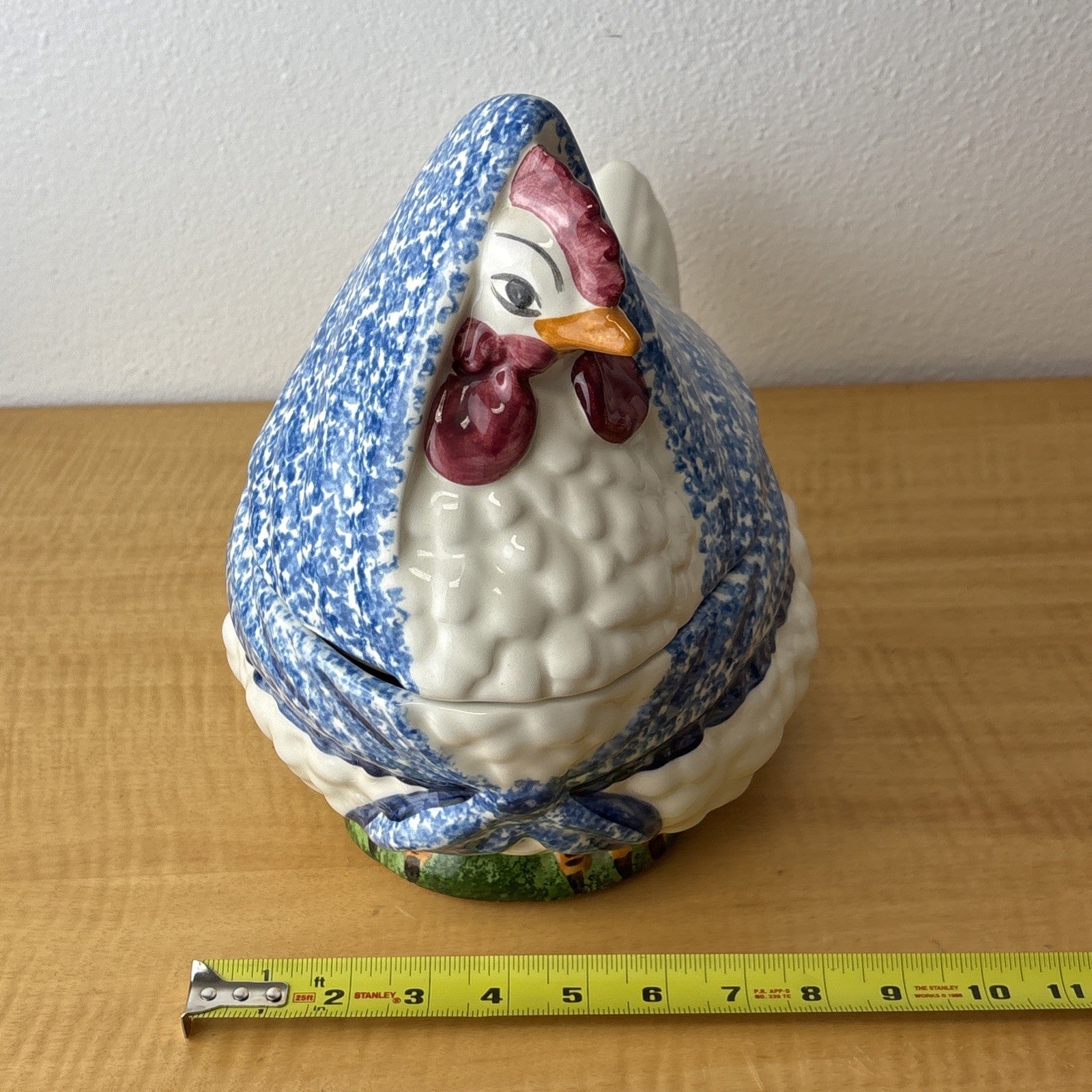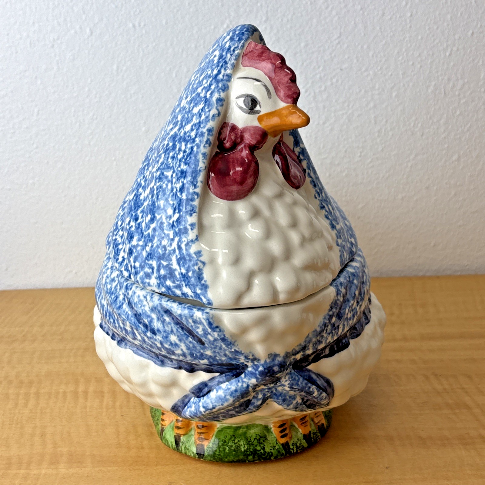 3 PC NS Gustin Calif Pottery Soup Tureen W/ Ladle Blue Spongeware Hen Chicken