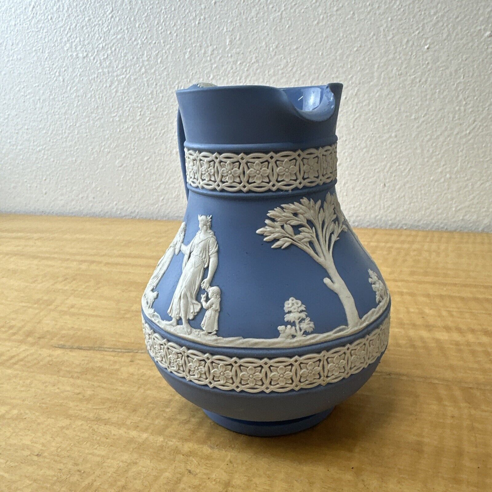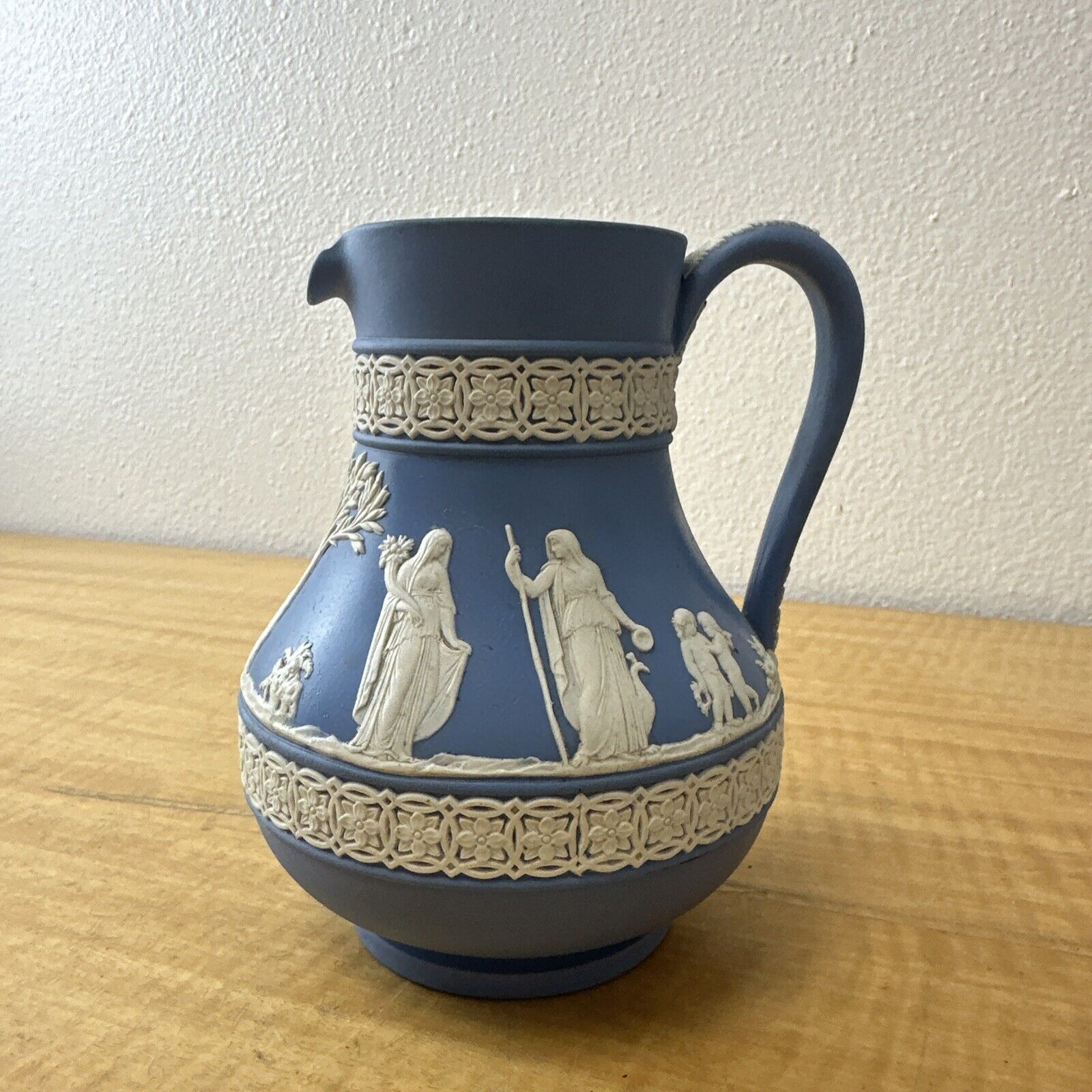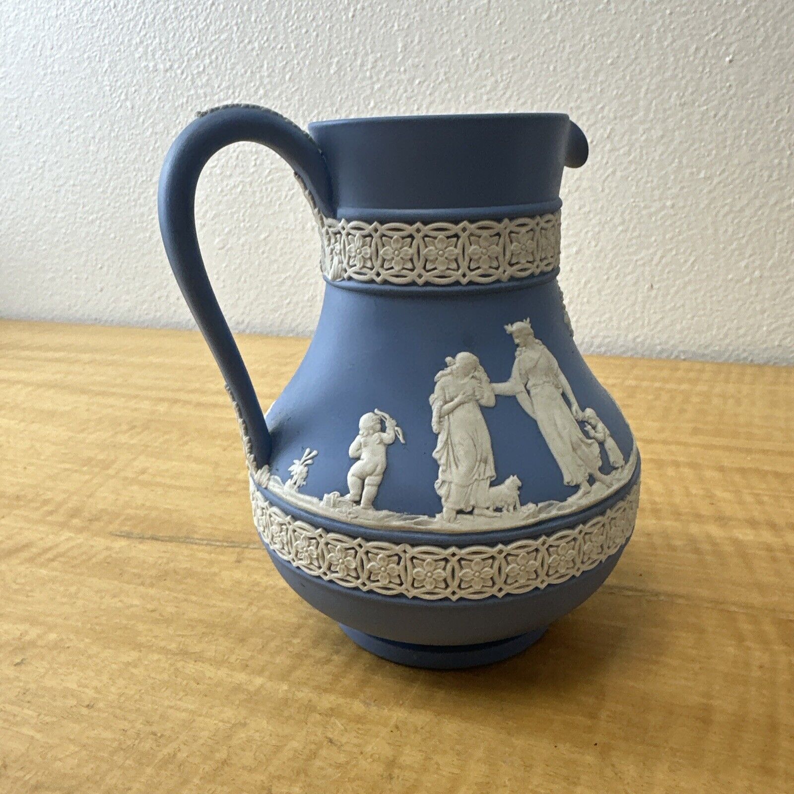 ANTIQUE WEDGWOOD "DIPPED" WHITE ON BLUE JASPERWARE ETRUSCAN PITCHER ENGLAND (1)