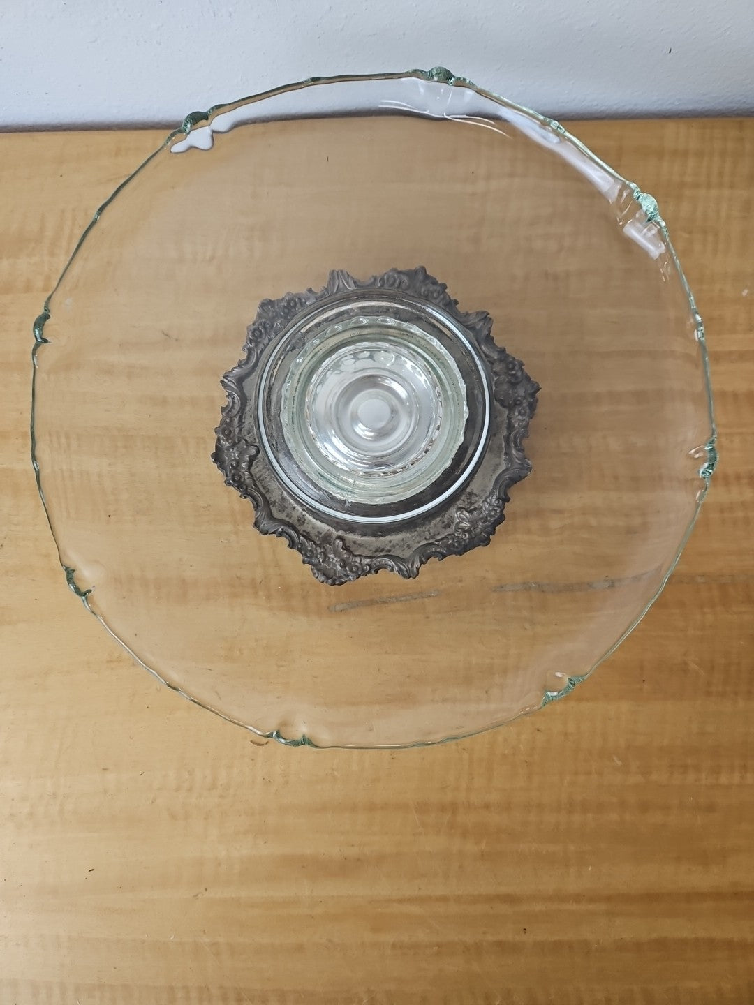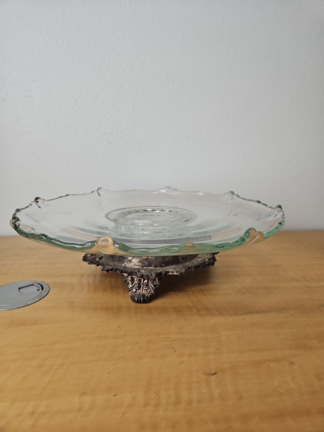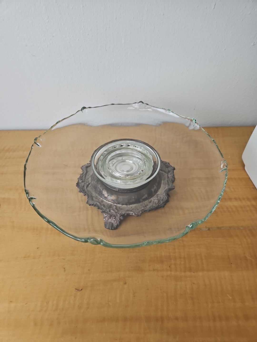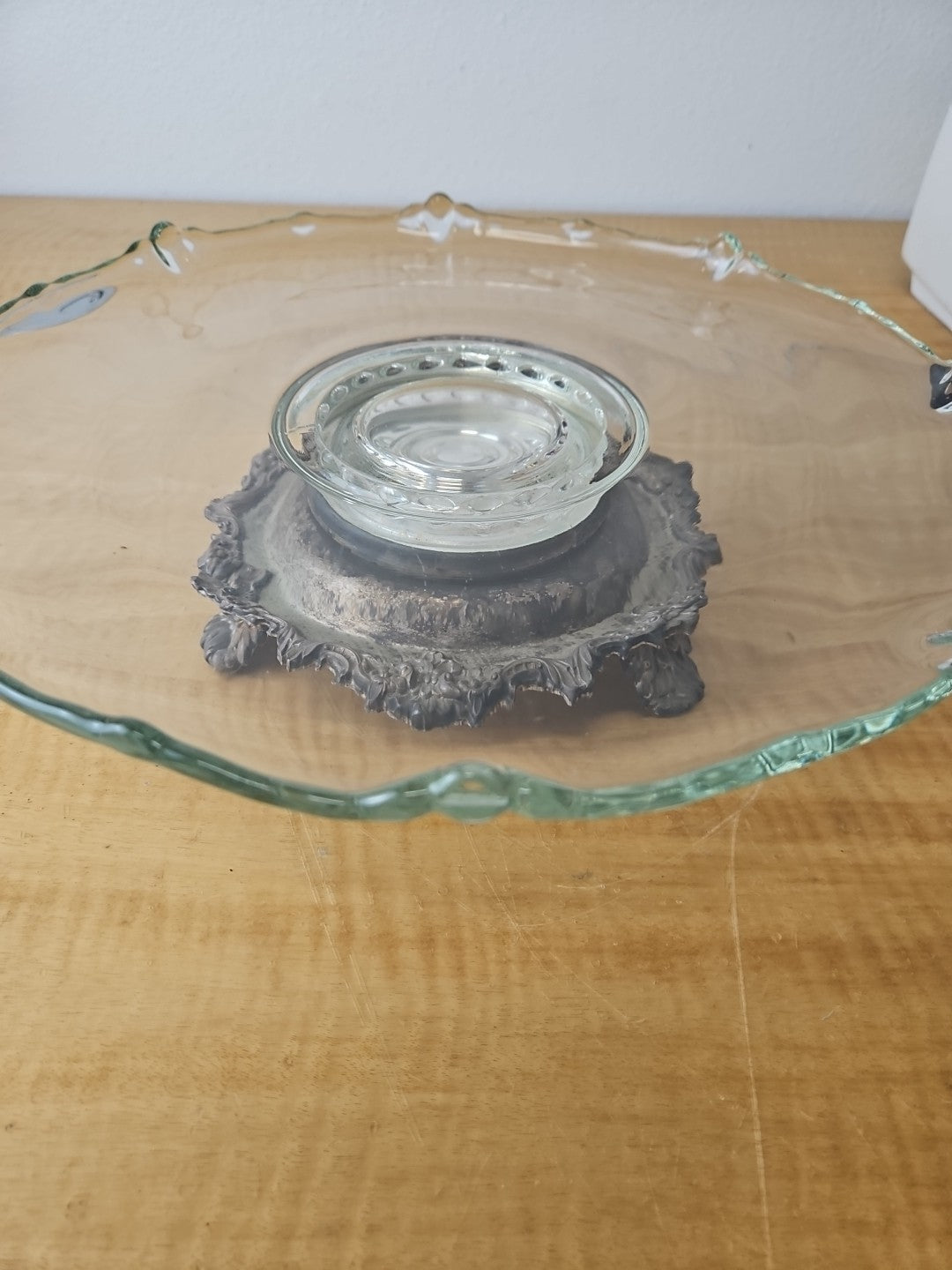 Beautiful Silver & Glass Lazy Susan Cake Plate -Logo of crown with C S- 13"