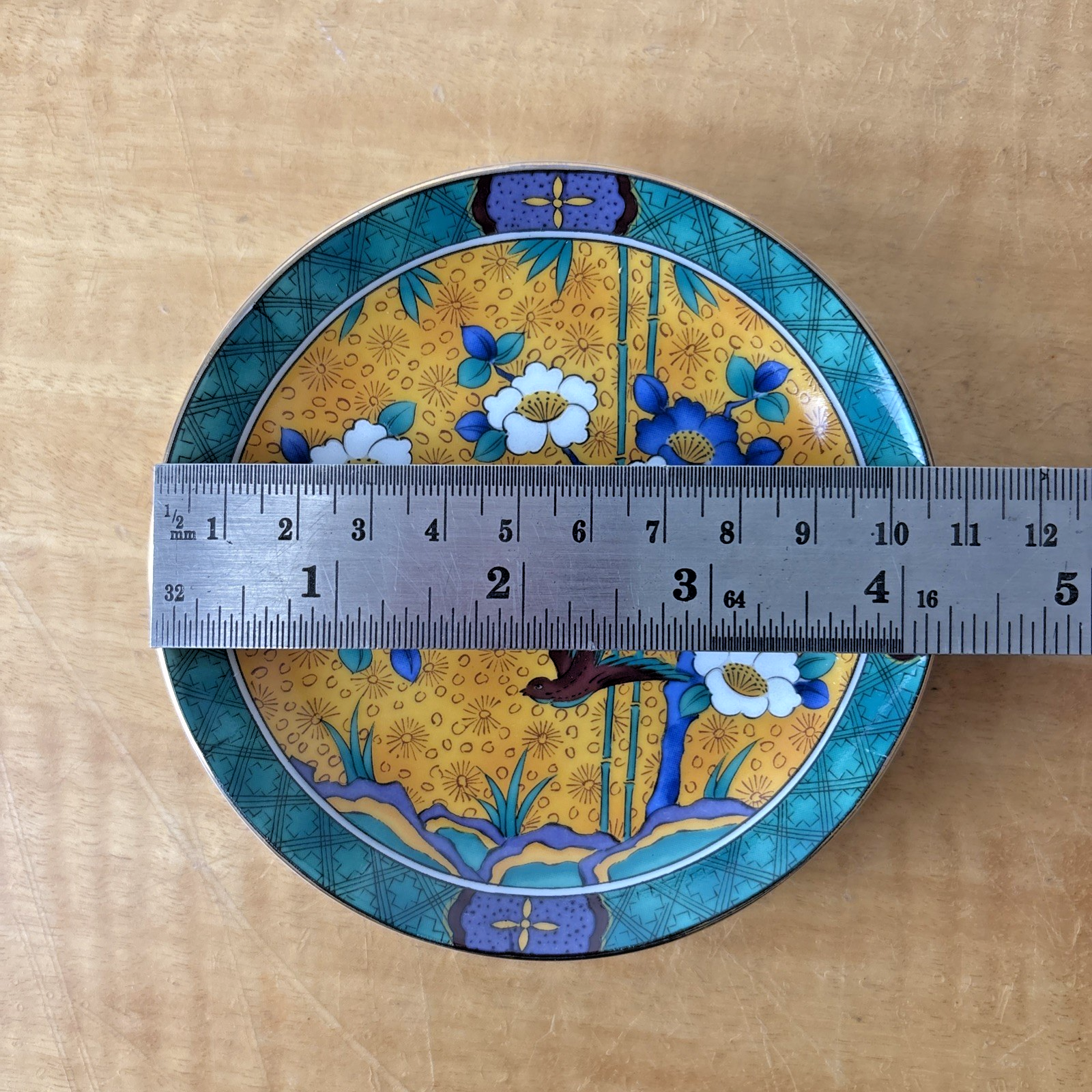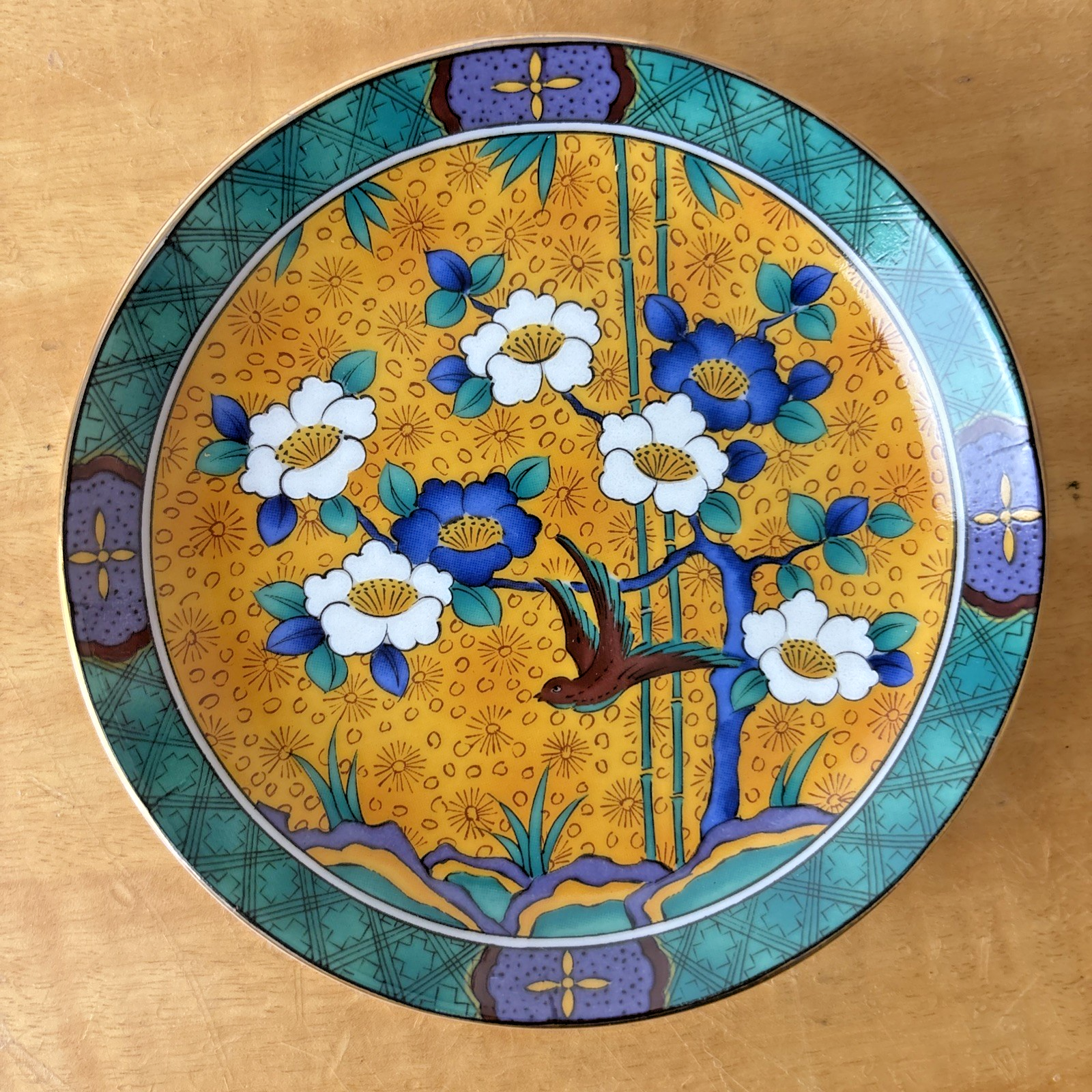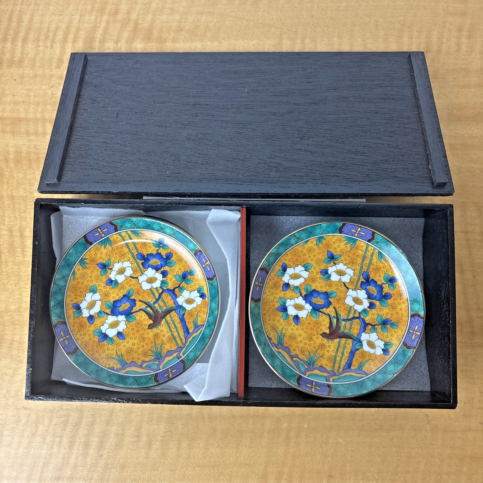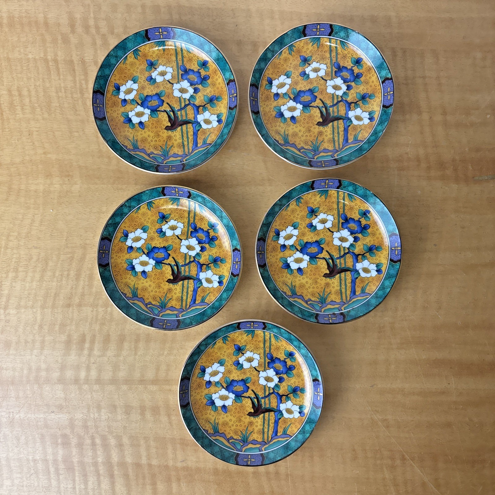 Chinese Porcelain Plate Dish Colorful Flowers Bird Signed Set of 5 in Wooden Box