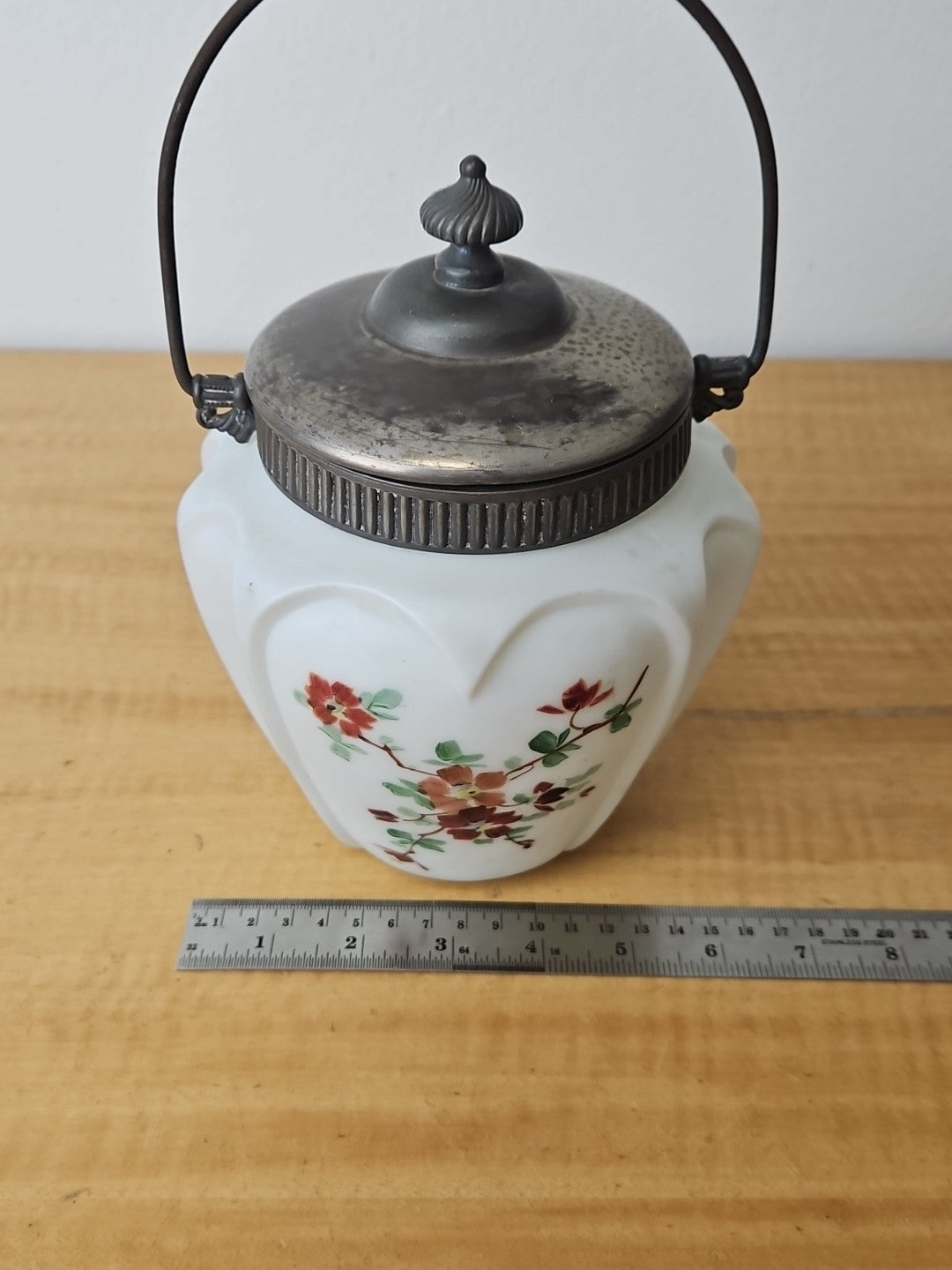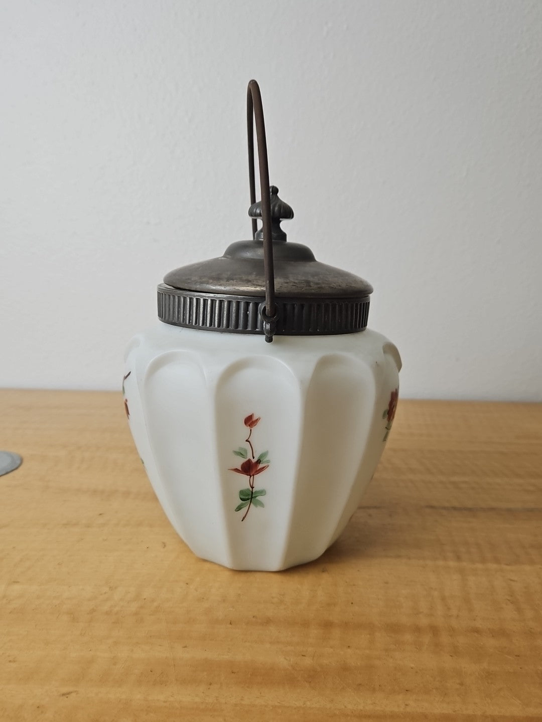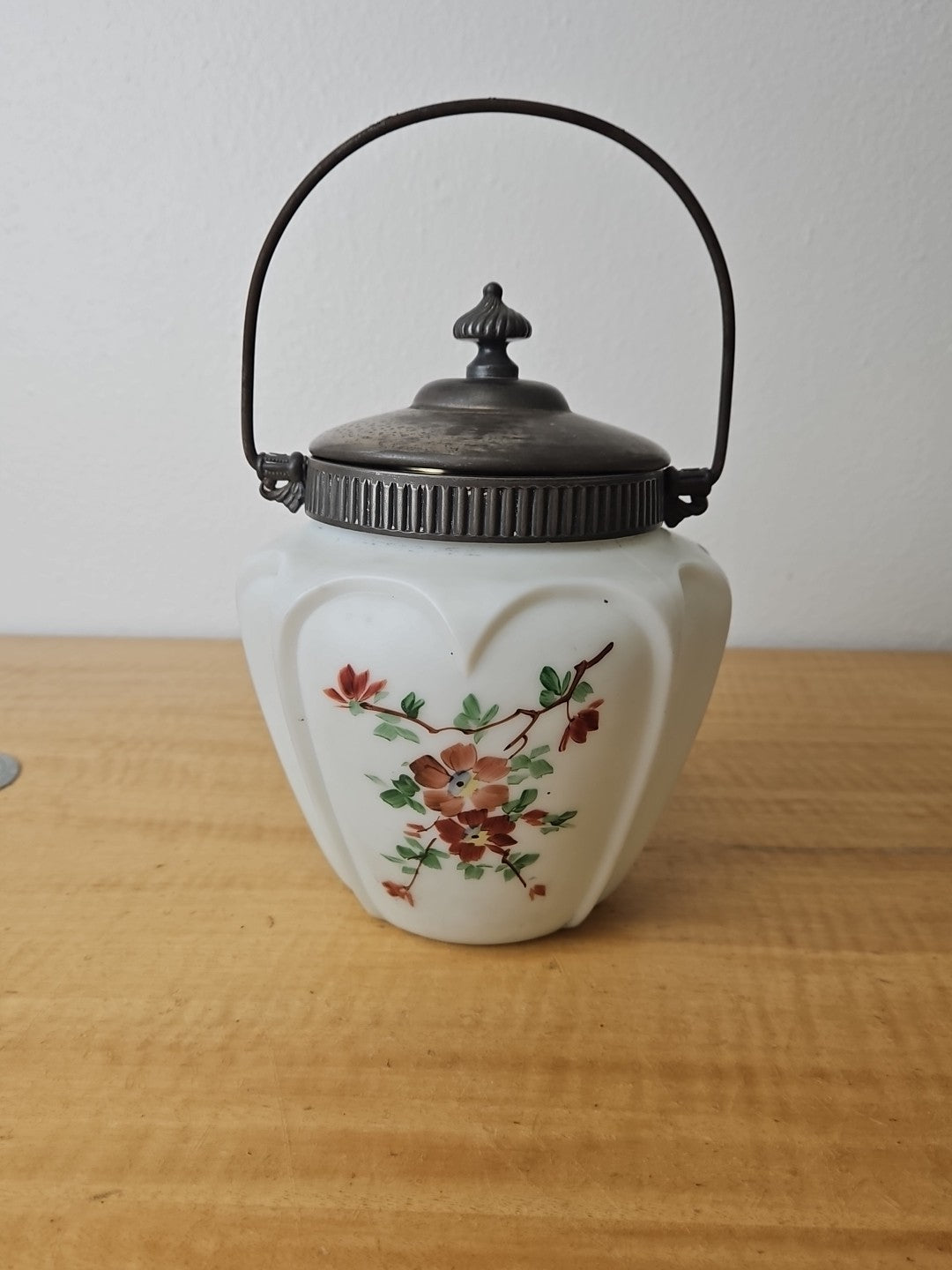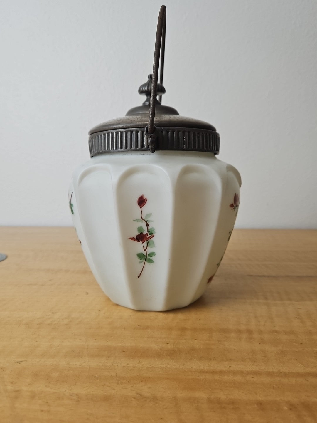 Custard Glass Biscuit Cookie Jar with lid and handle metal 6" white, flowers