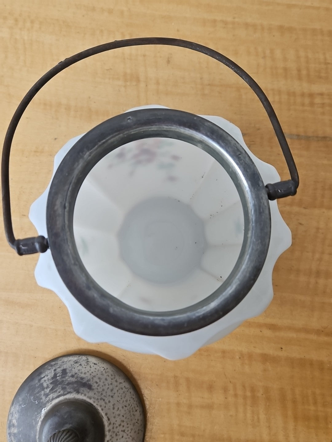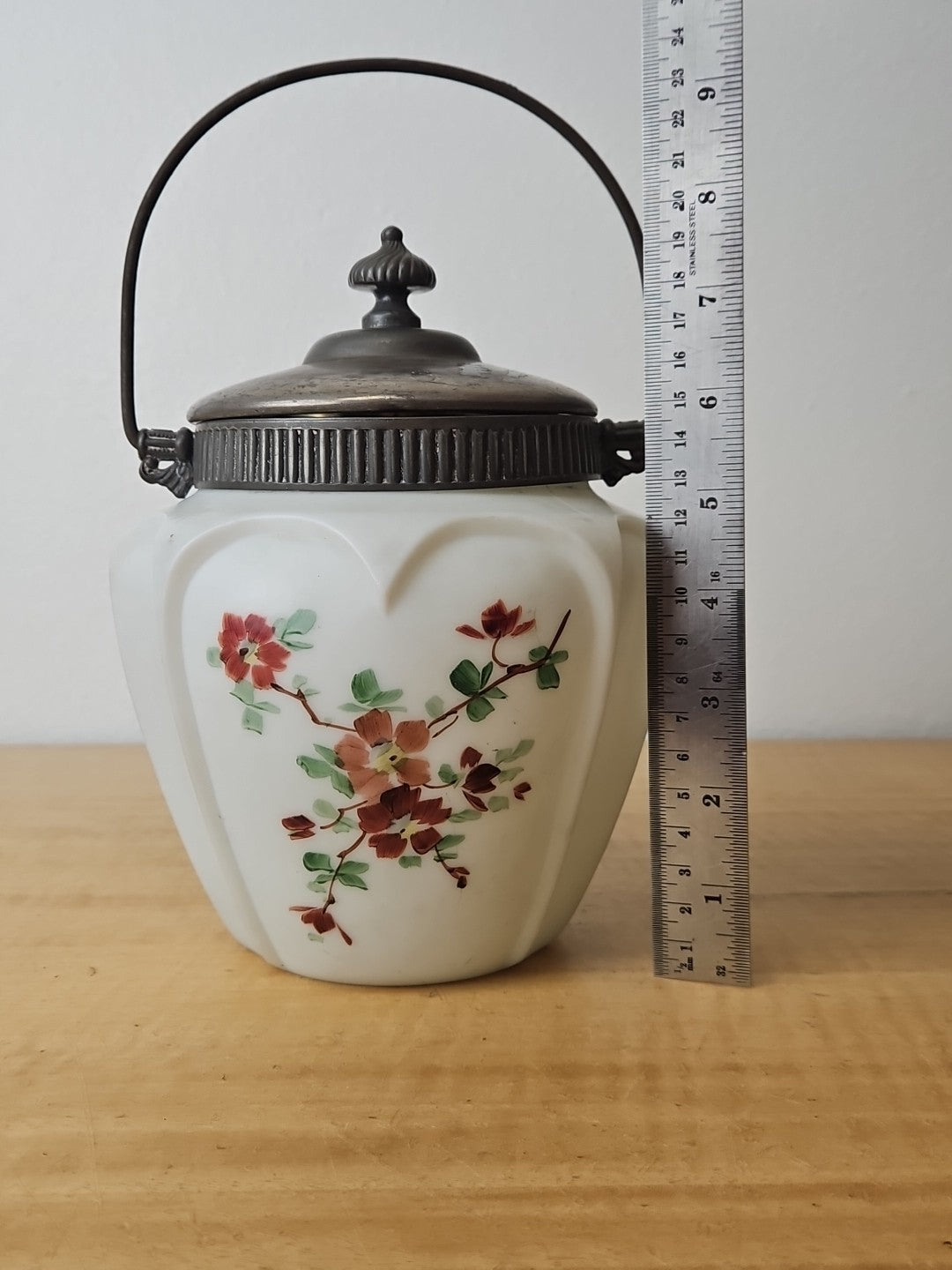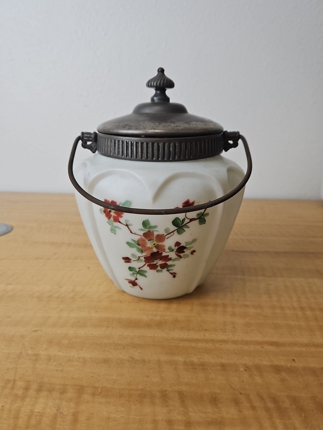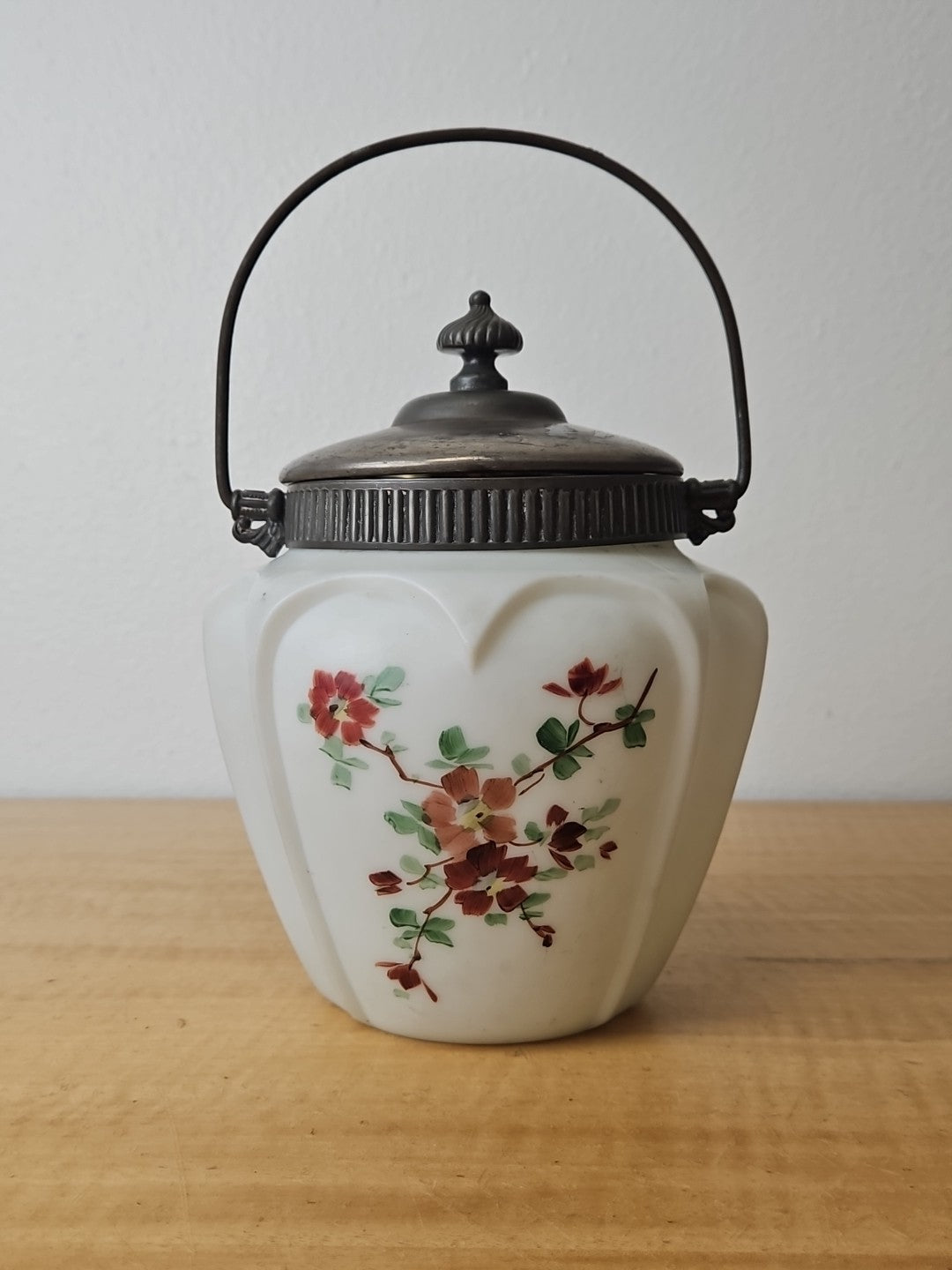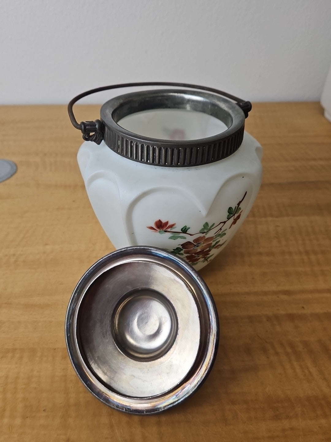 Custard Glass Biscuit Cookie Jar with lid and handle metal 6" white, flowers