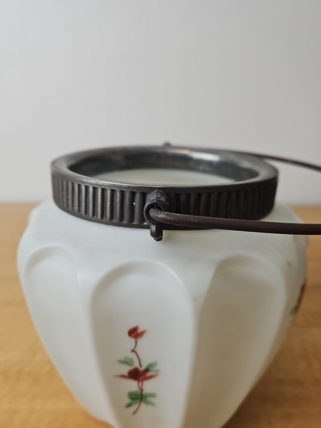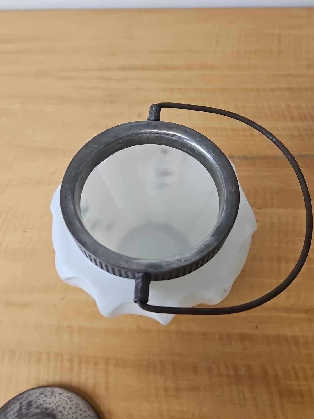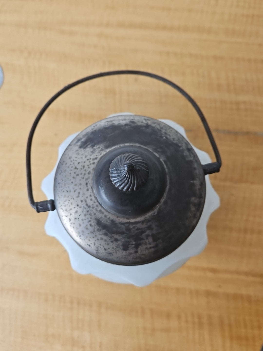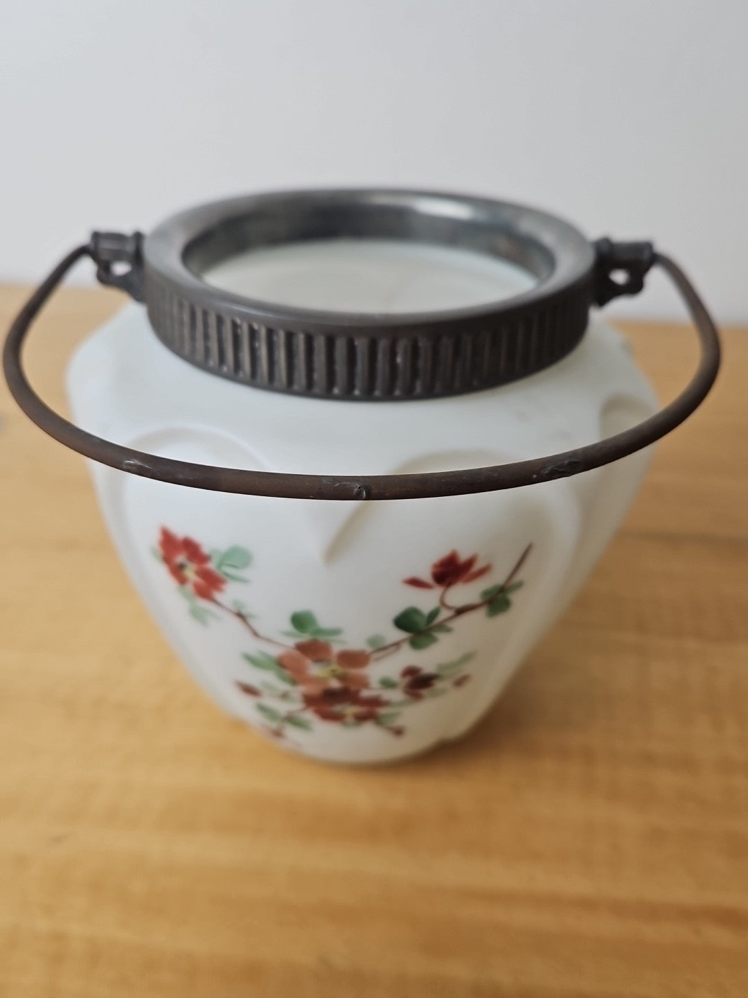 Custard Glass Biscuit Cookie Jar with lid and handle metal 6" white, flowers