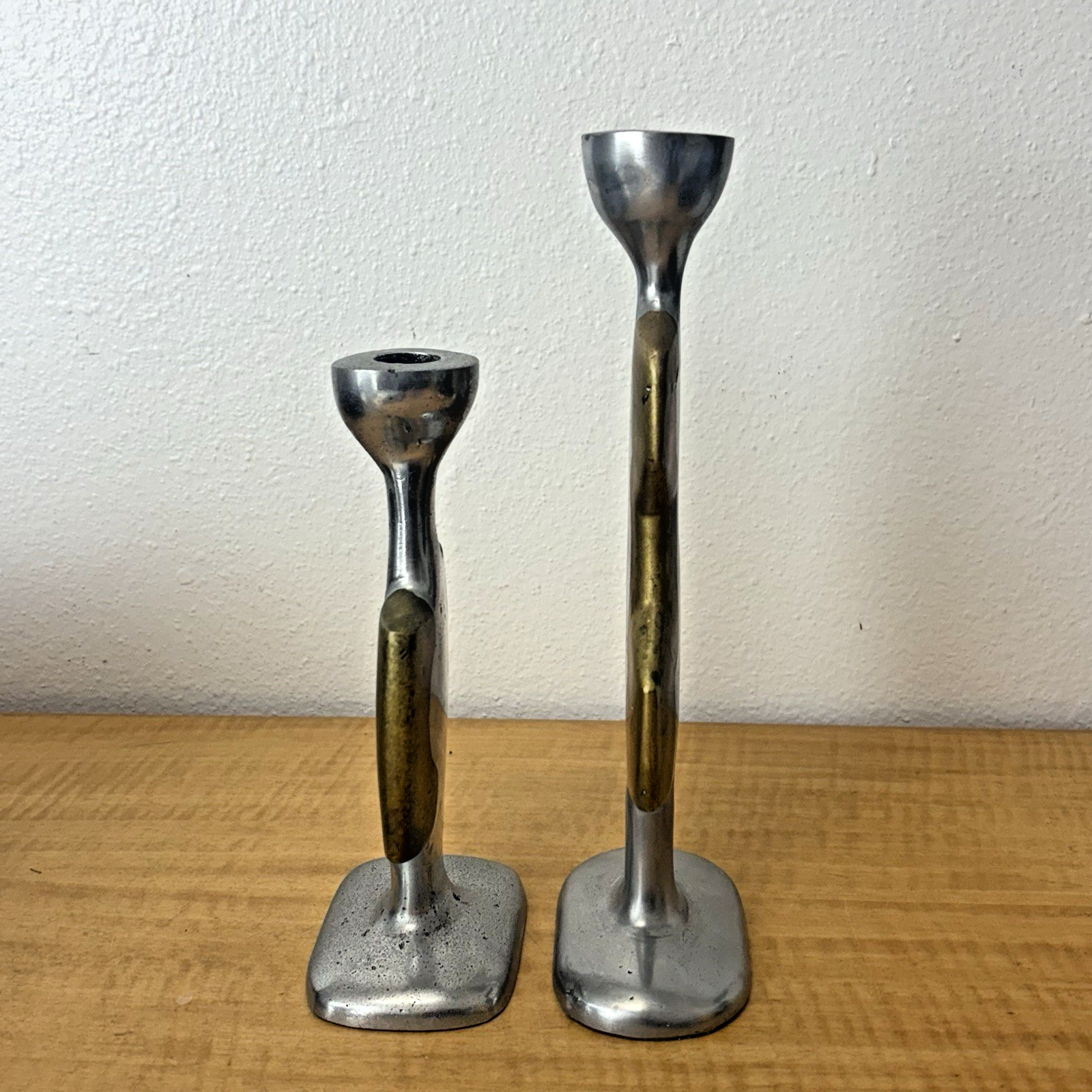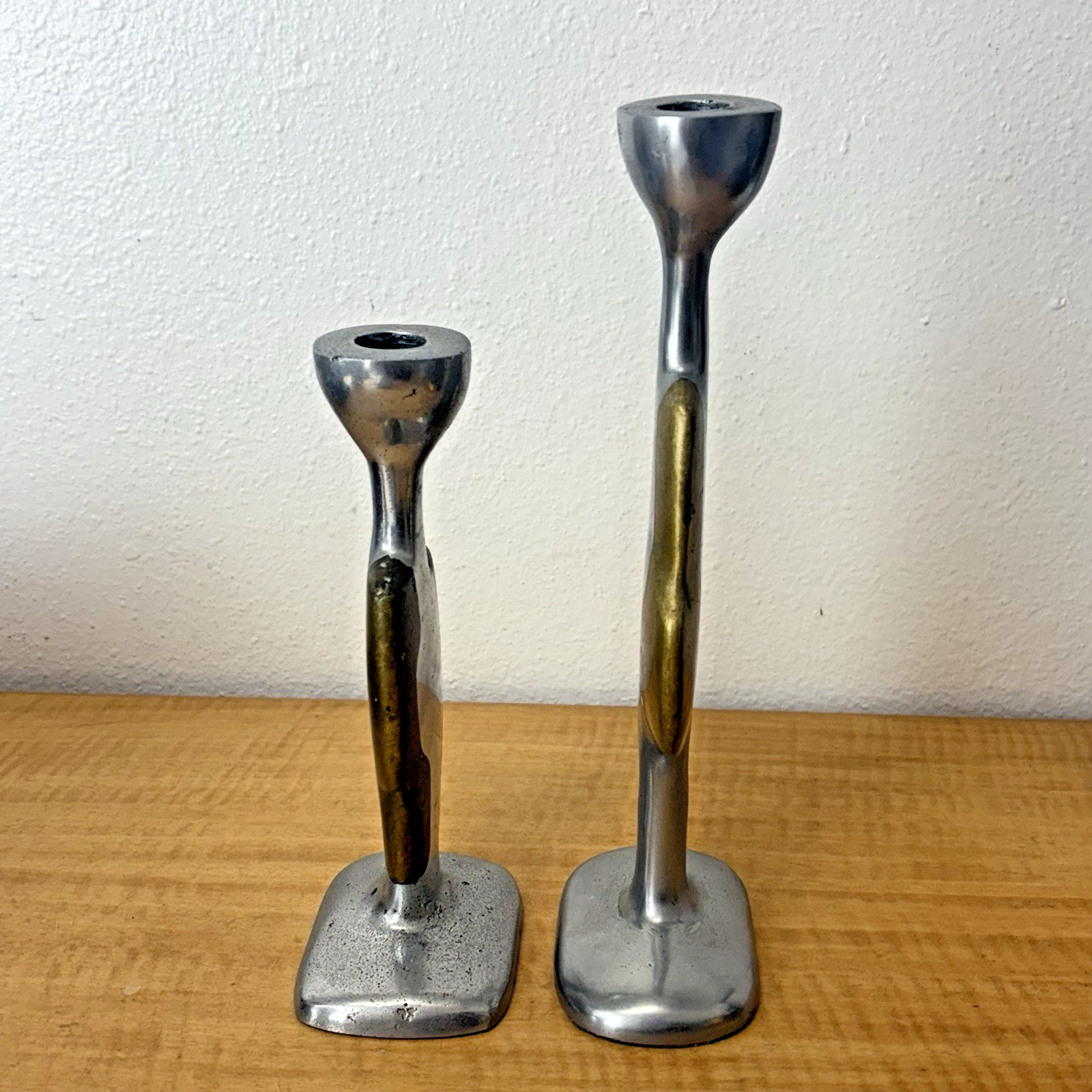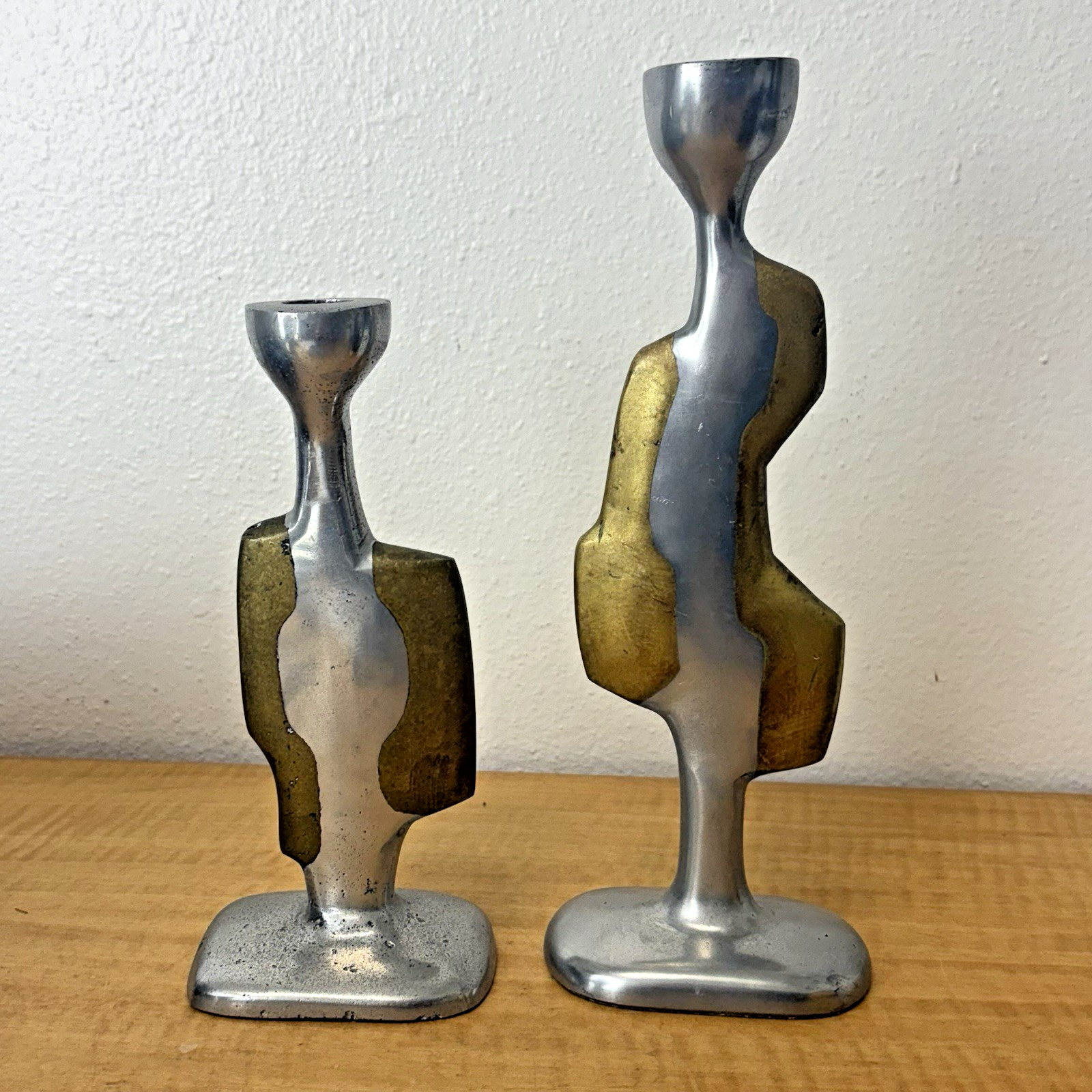 David Marshall Brass Aluminum Brutalist Candlestick Holders Set of 2