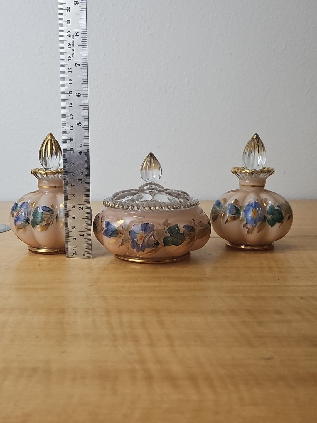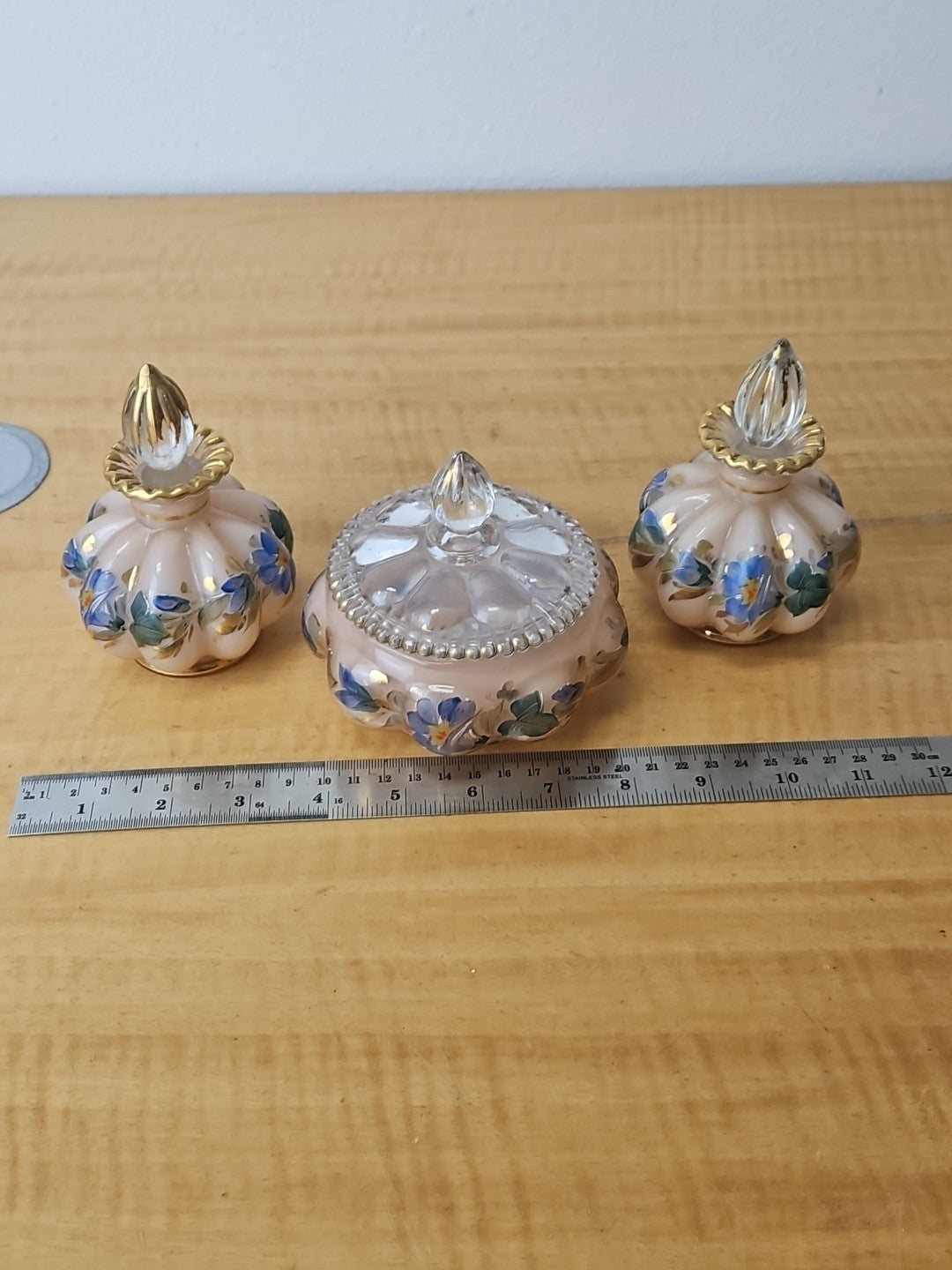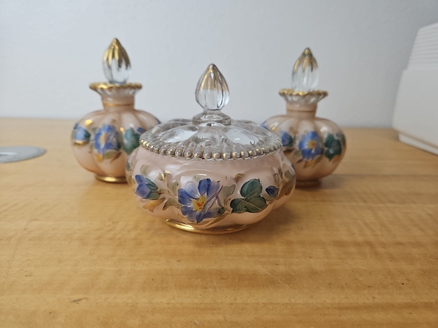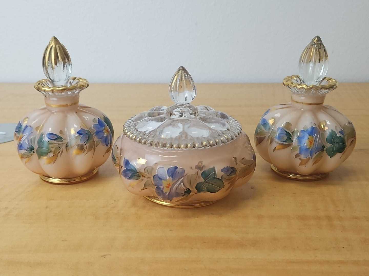 Fenton Vanity Set Pink, flowers, 2 perfume bottles w/stoppers, powder jar w/ lid