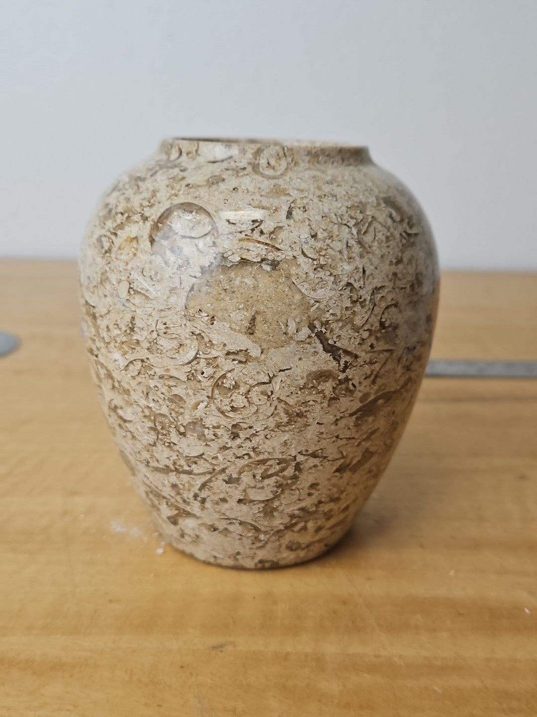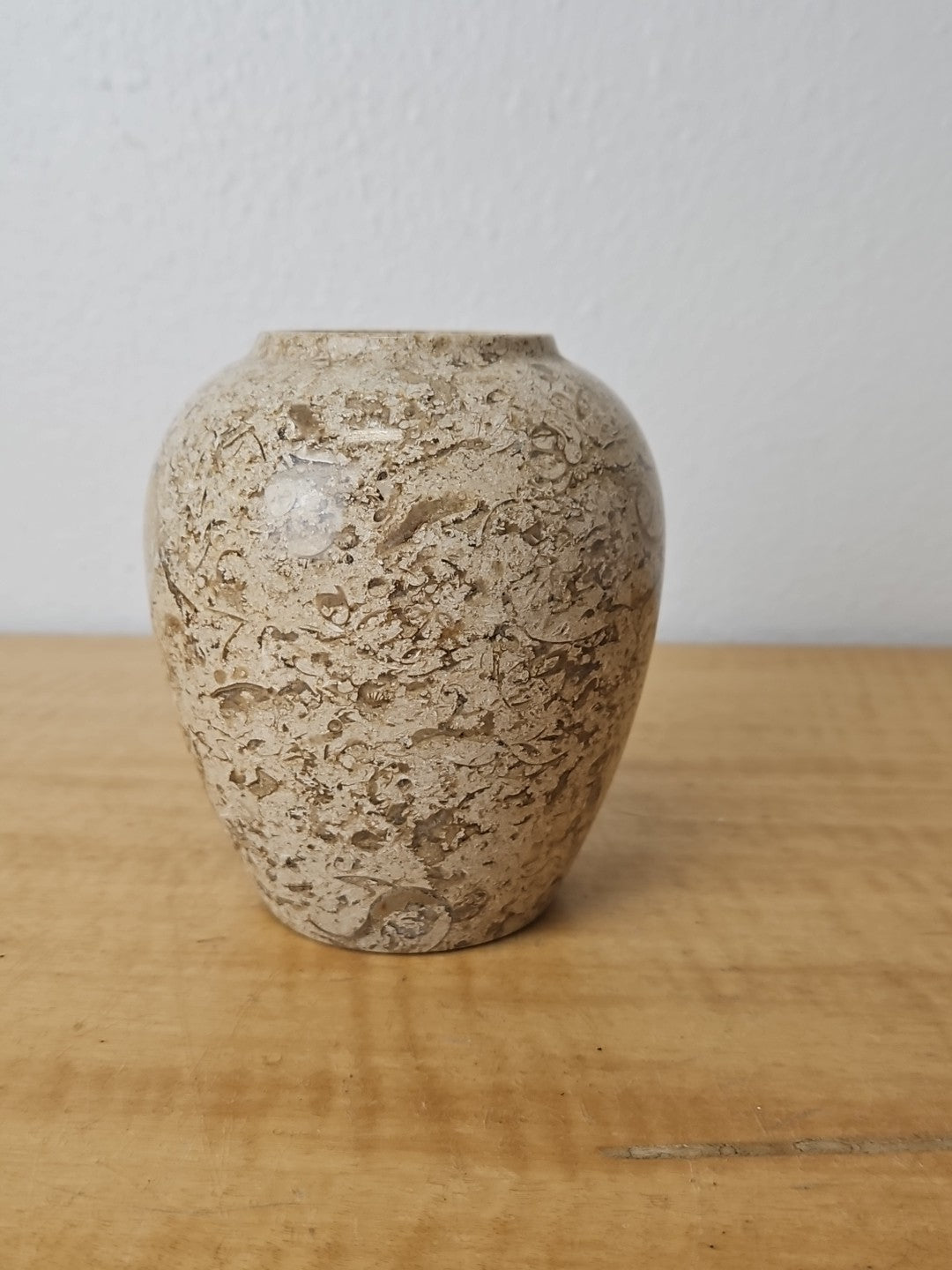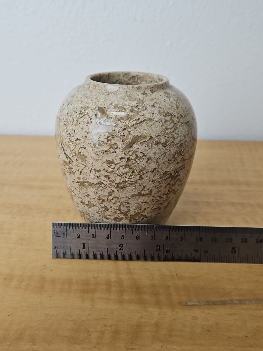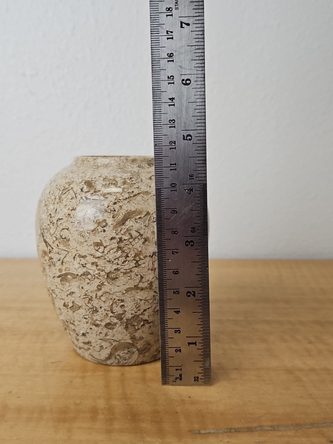 Fossil Marble Stone Vase, bud base, earth tones, heavy, 4 1/2"