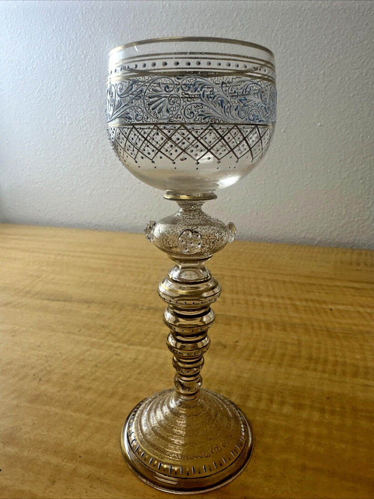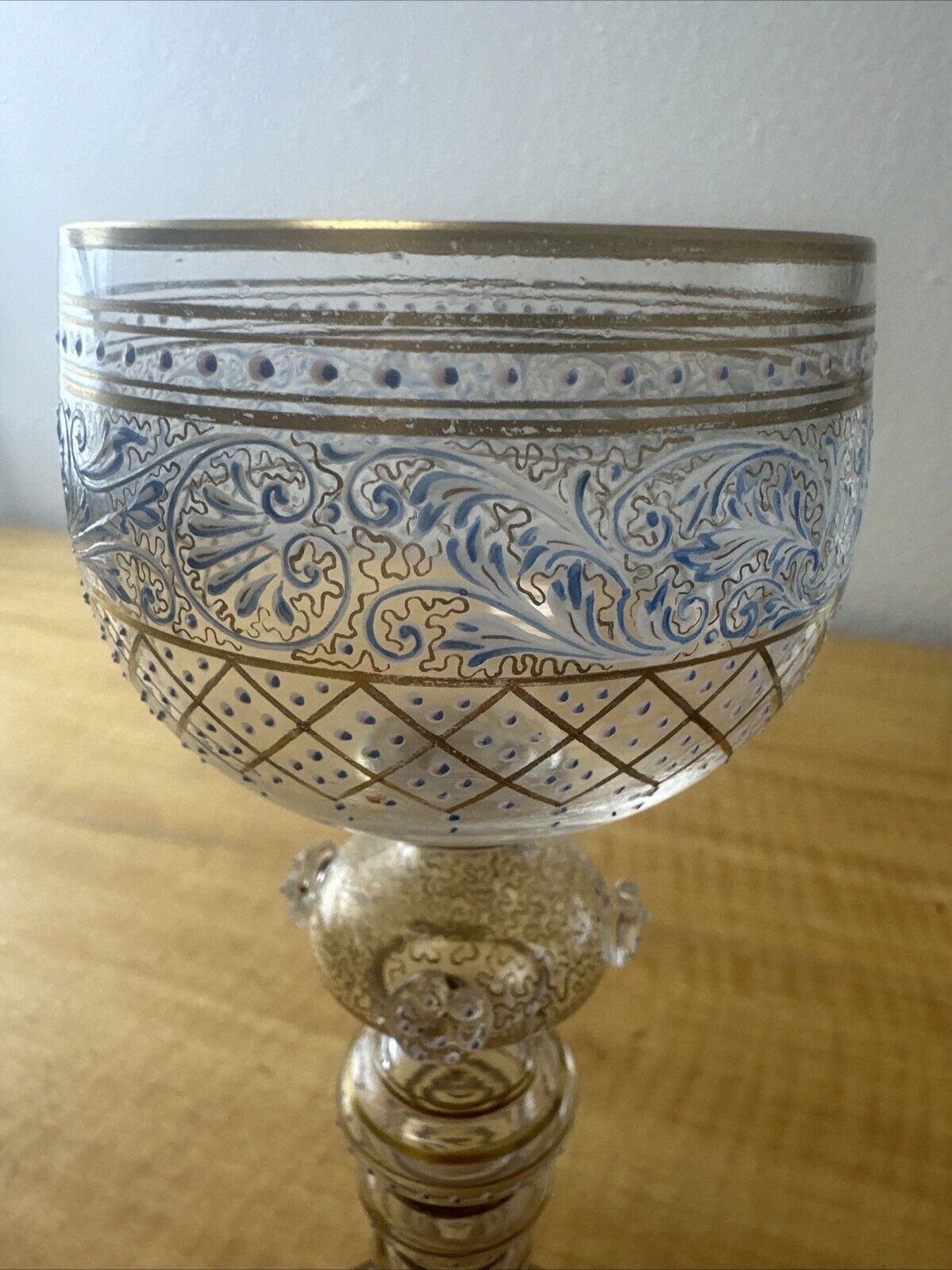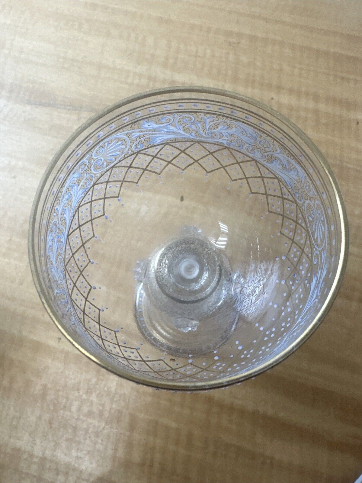 Fritz Heckert Hand Enameled White, Blue & Gold Wine Glass