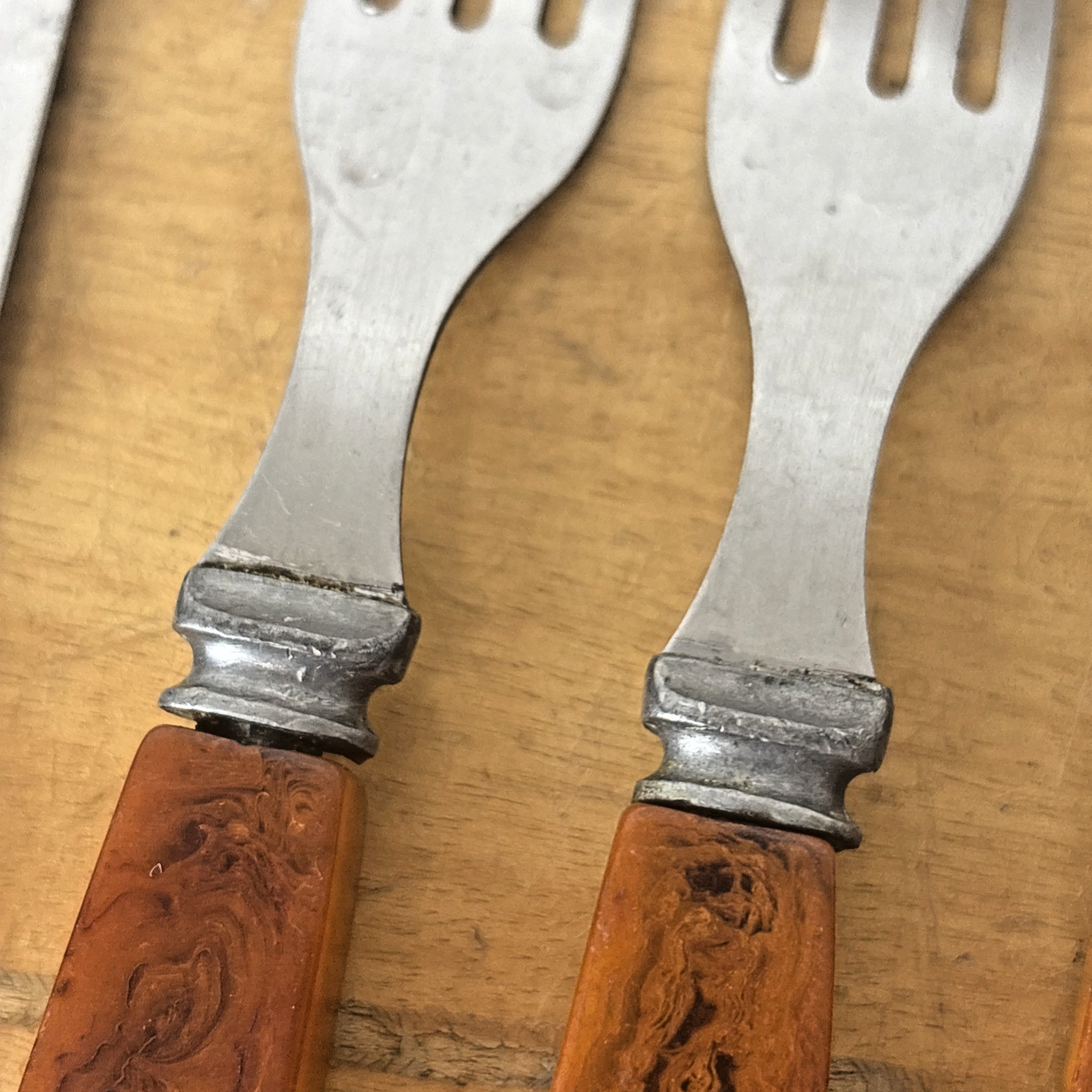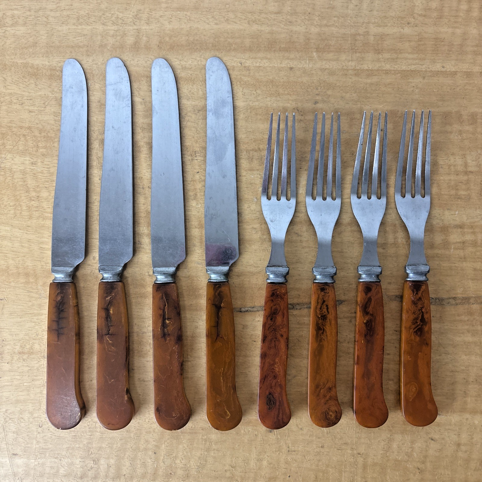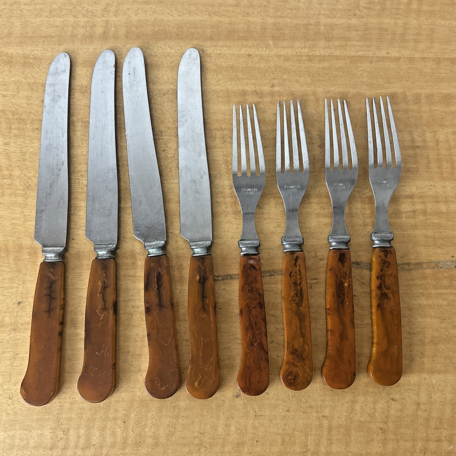 G S C Co. Amber Bakelite Stainless Steel Set of 4 Knives + 4 Forks Utensils