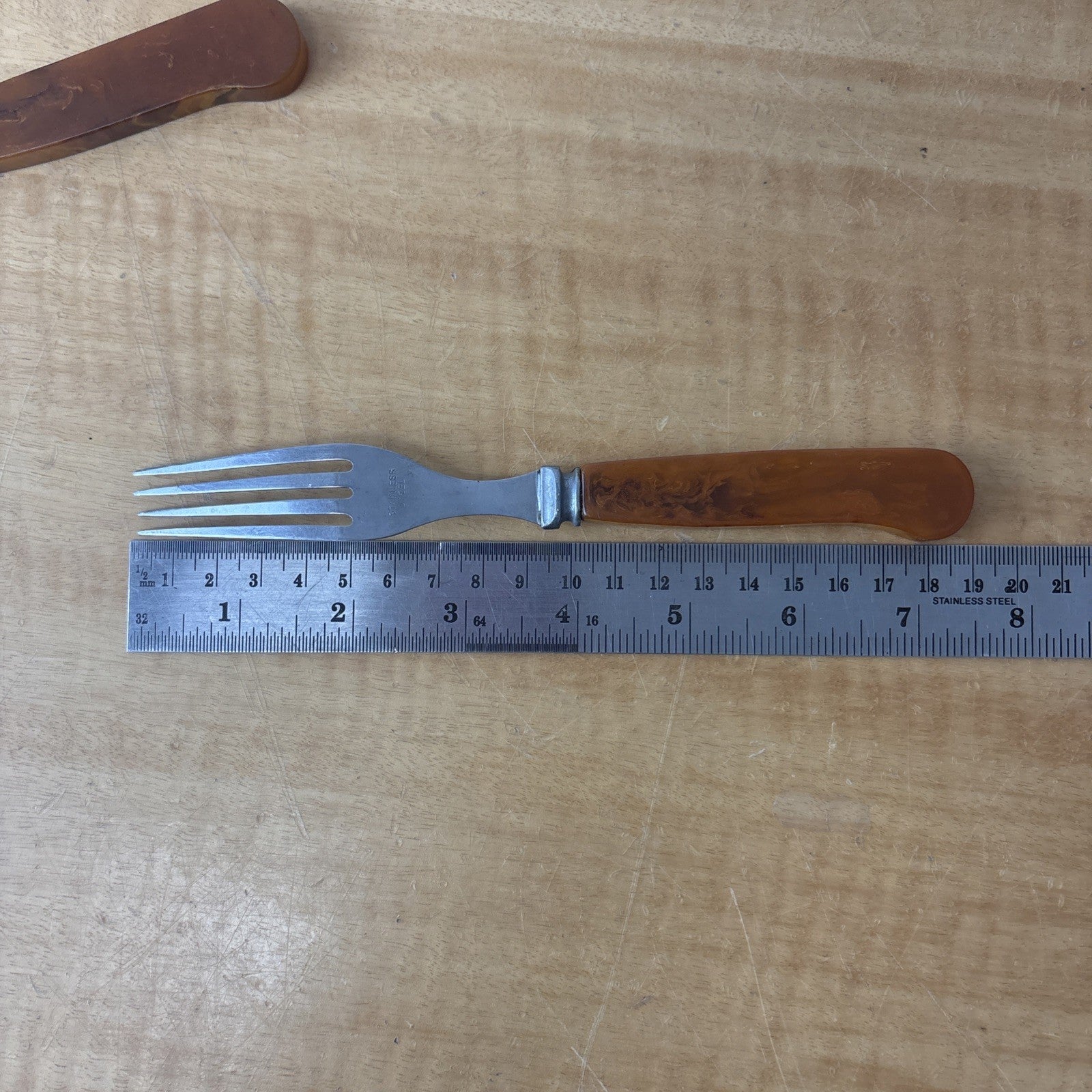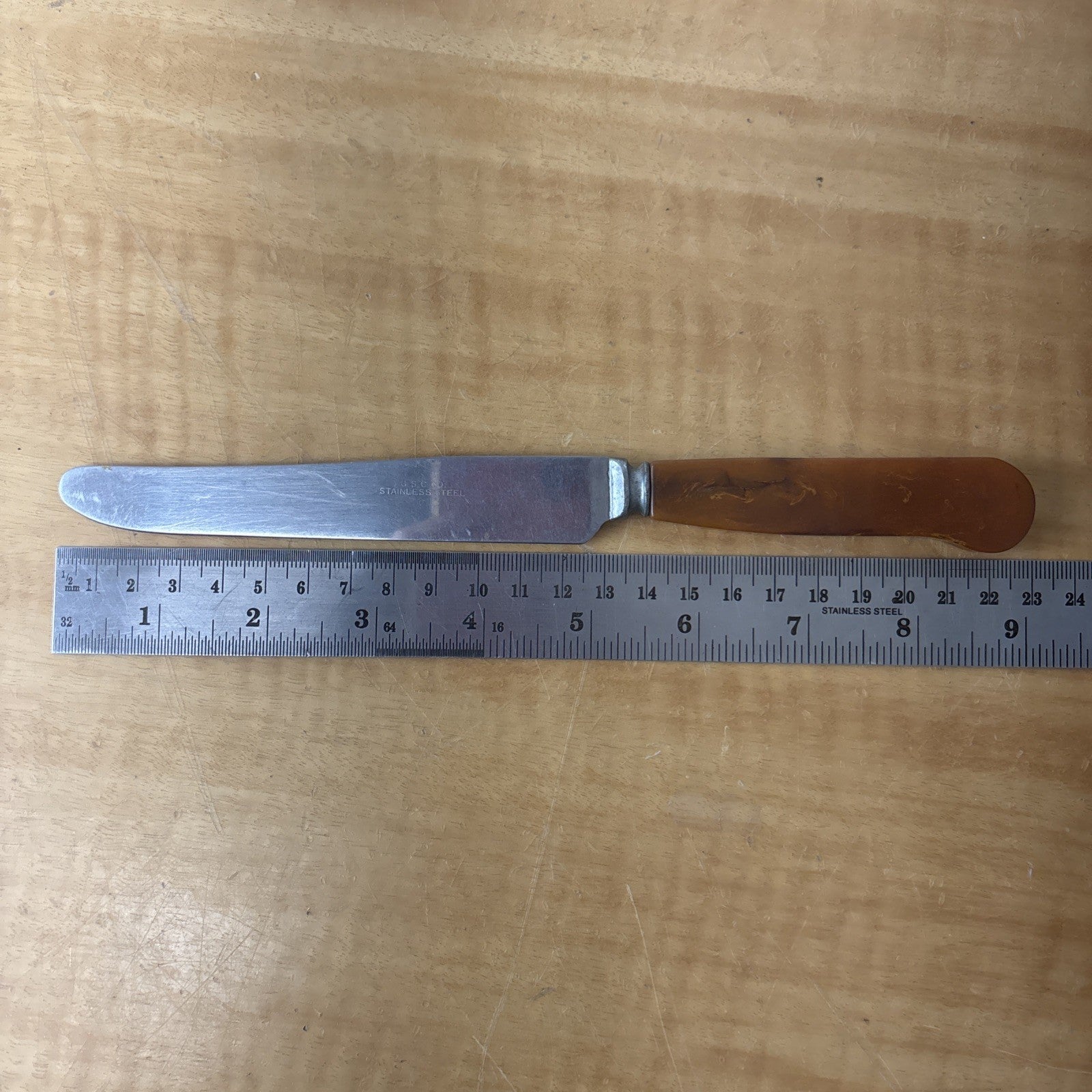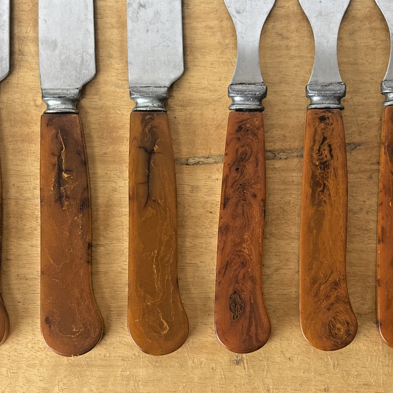 G S C Co. Amber Bakelite Stainless Steel Set of 4 Knives + 4 Forks Utensils