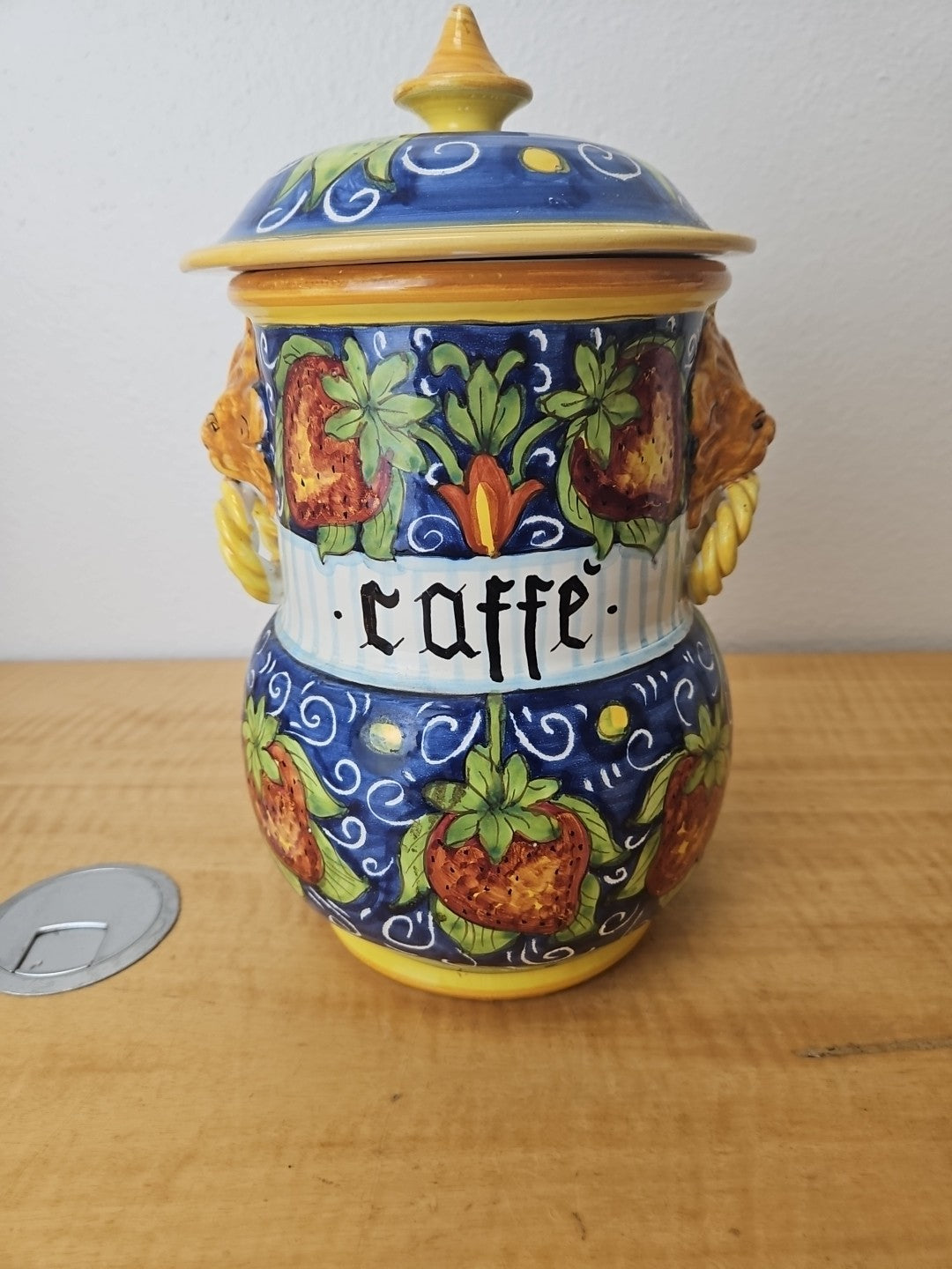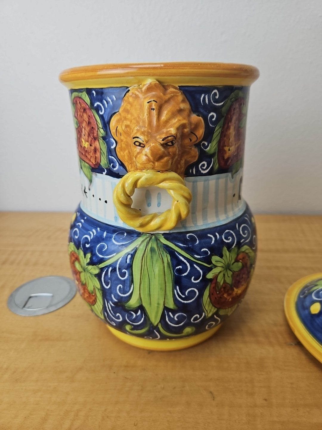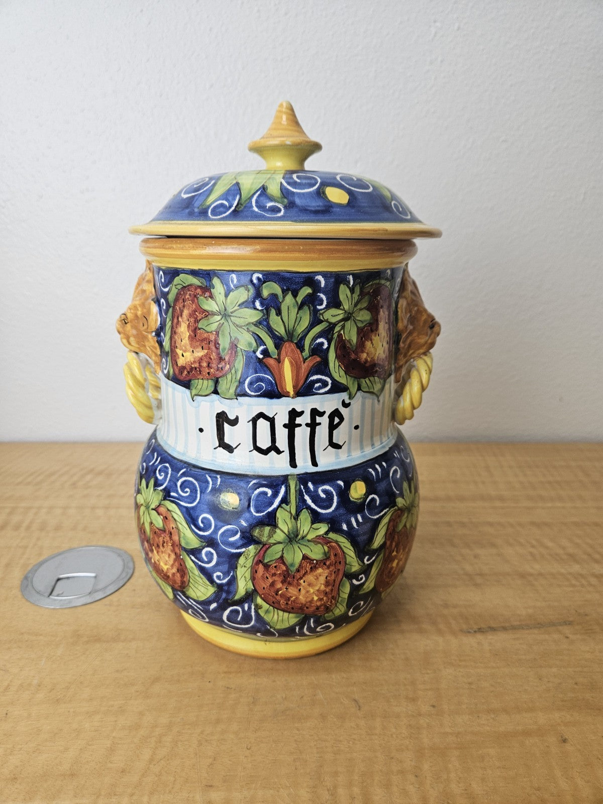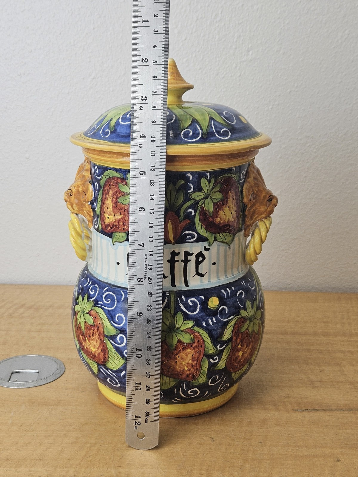 Hand Painted Italian Canister Pottery Crock Ceramic Caffe Lion Head w/ Lid