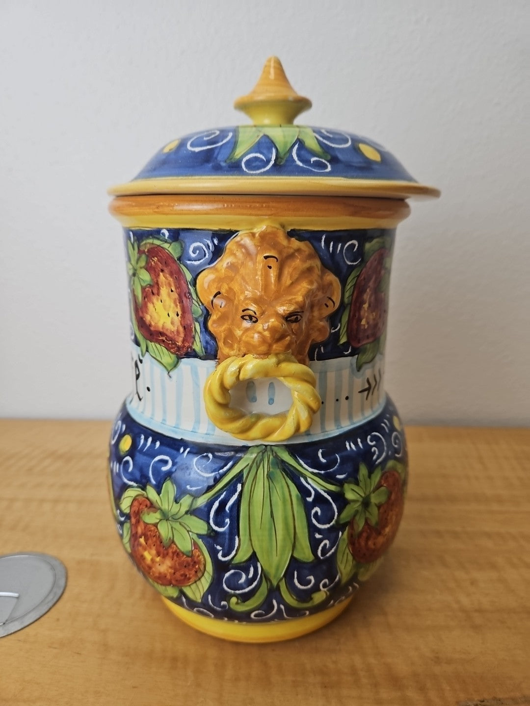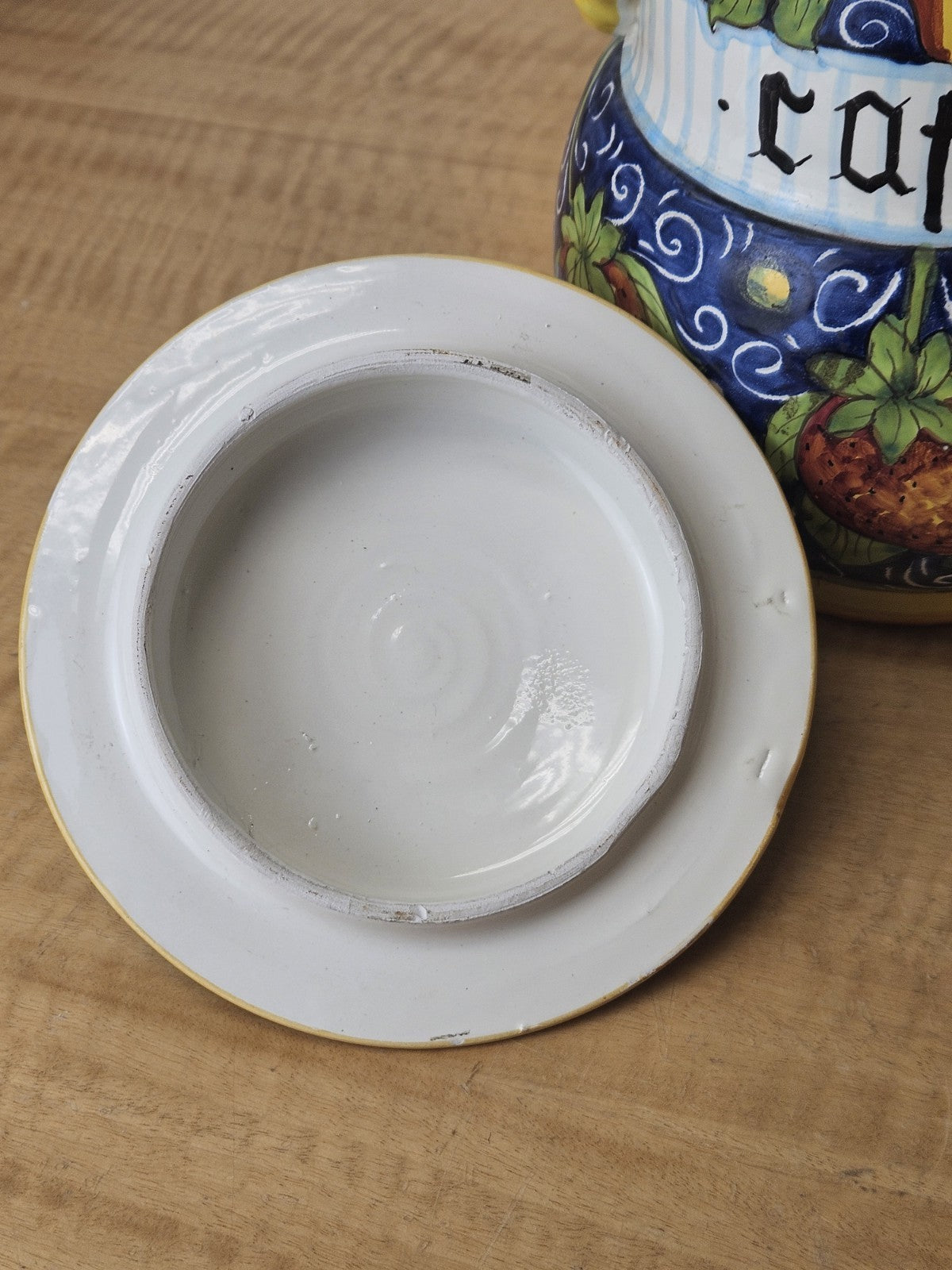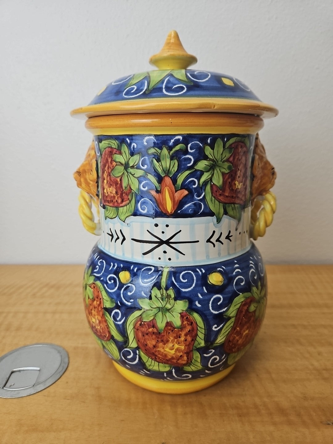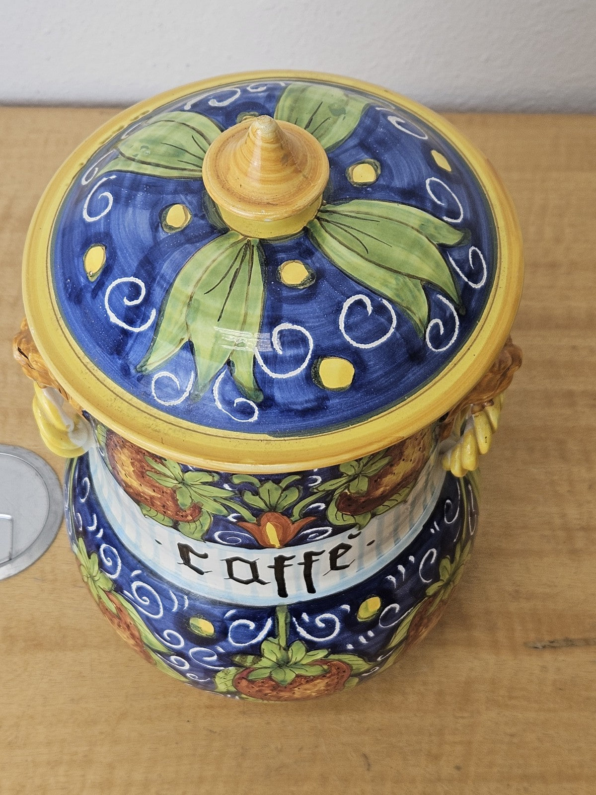 Hand Painted Italian Canister Pottery Crock Ceramic Caffe Lion Head w/ Lid