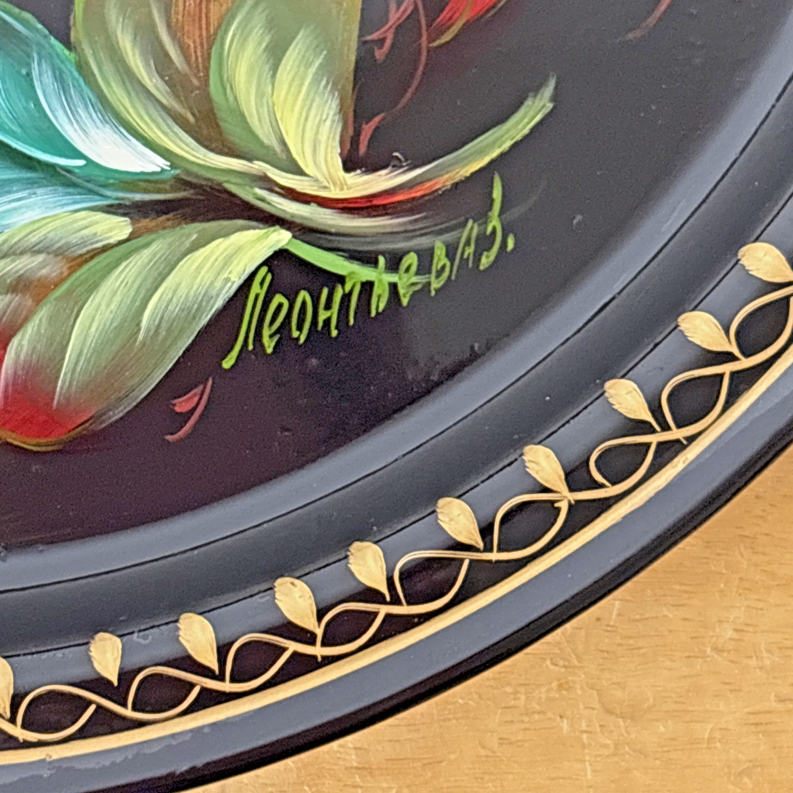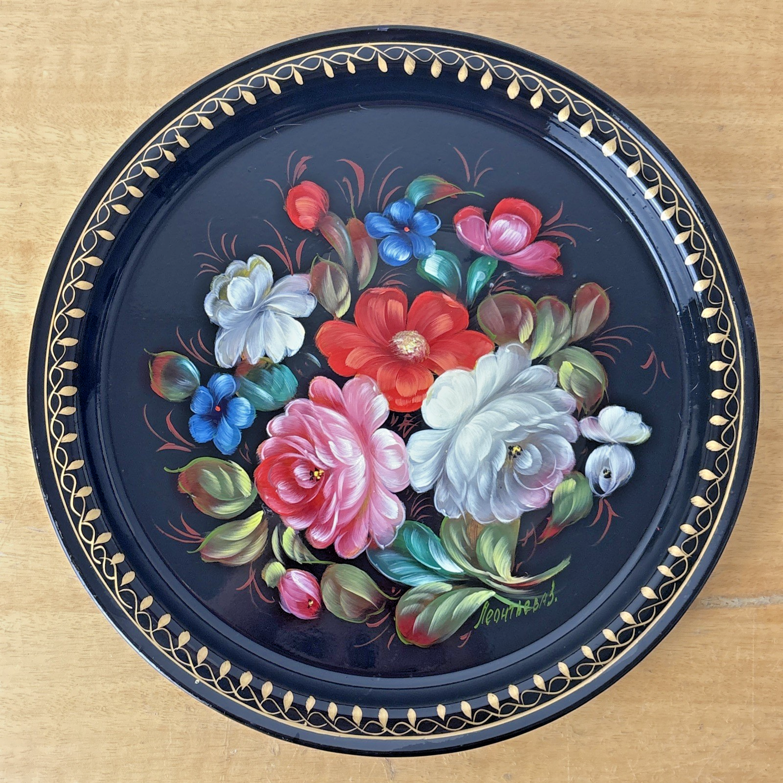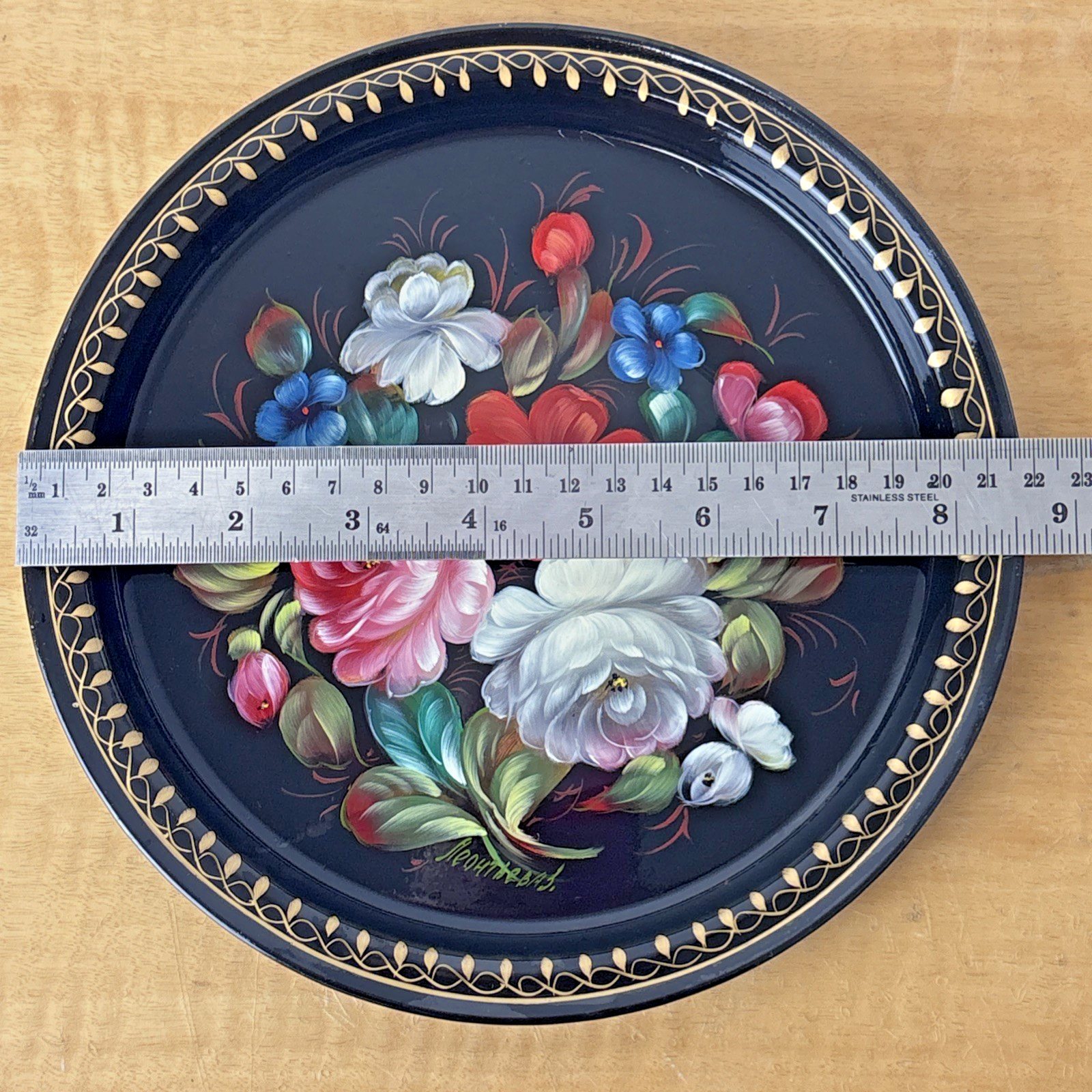 Hand Painted Round 8.5" Tole Tray / Plate Floral Made in Russia Signed