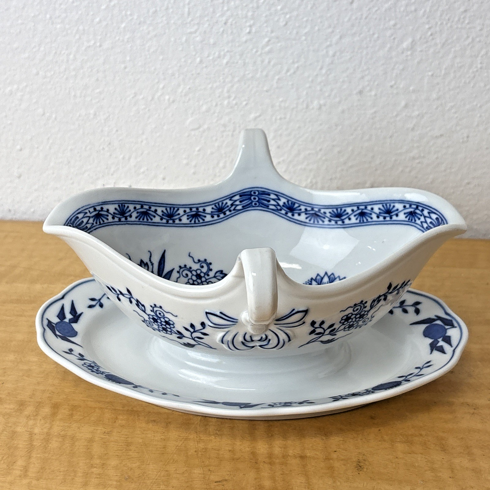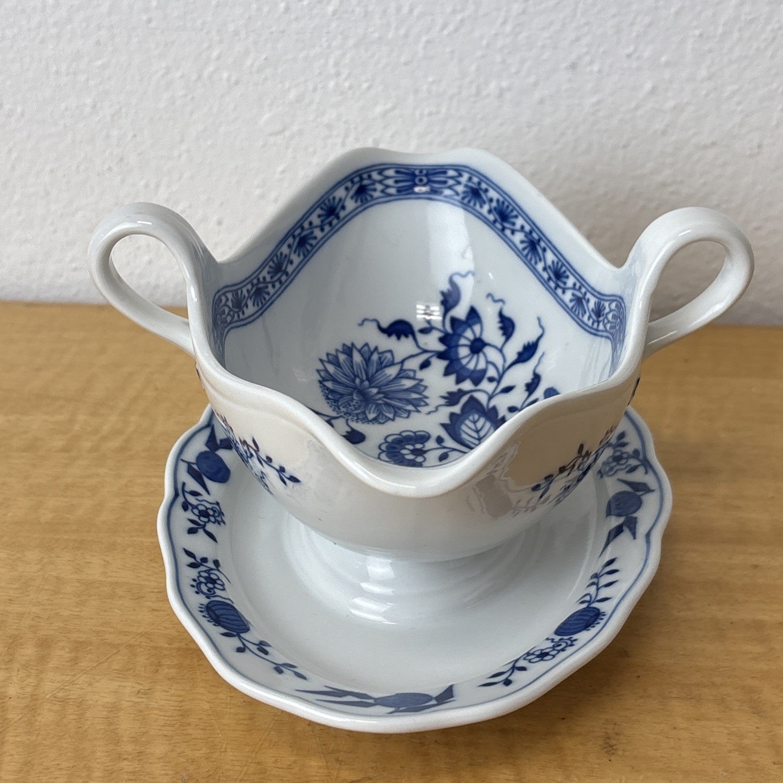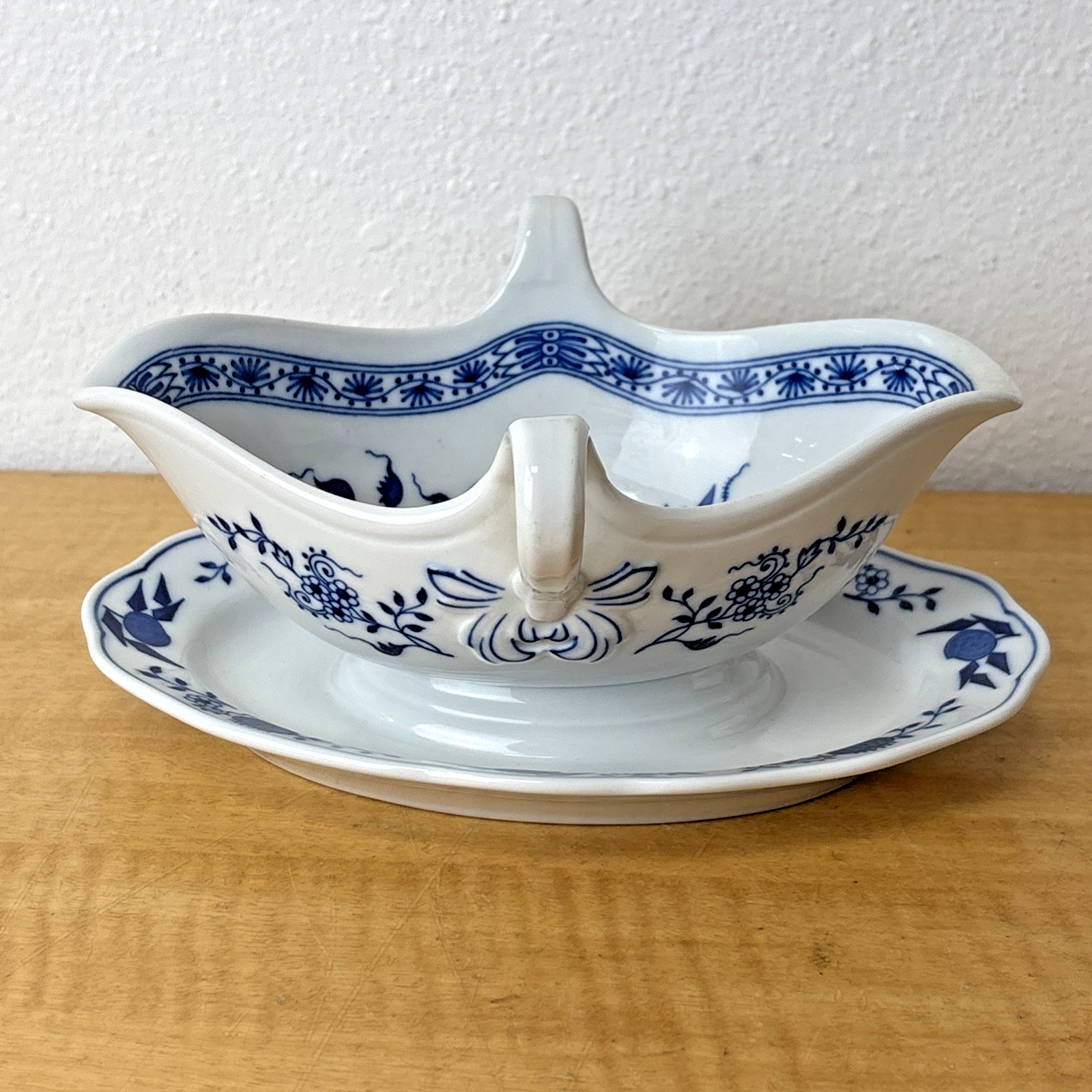 Hutschenreuther VTG Blue Onion Gravy Boat Attached Dish Loop Handles, Germany