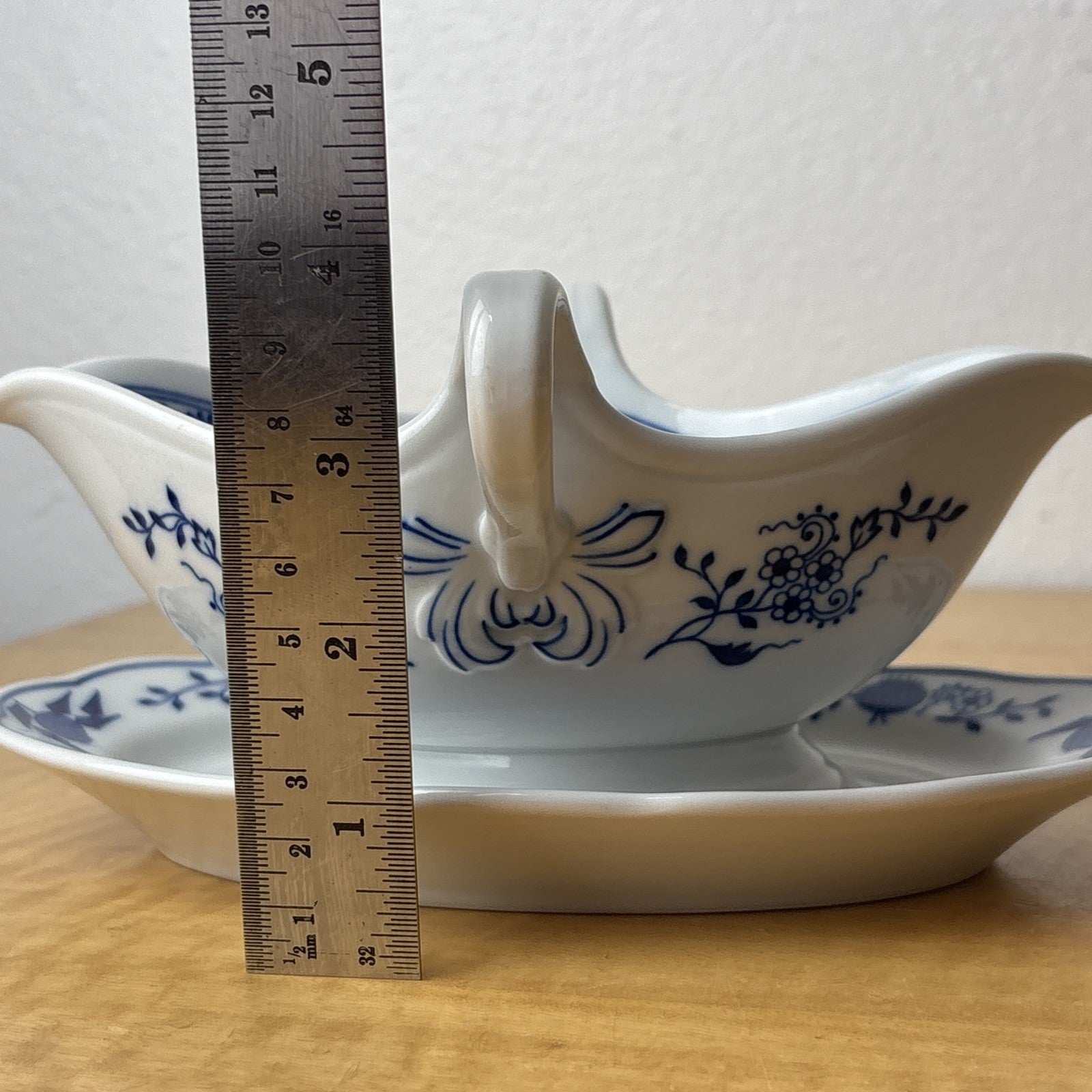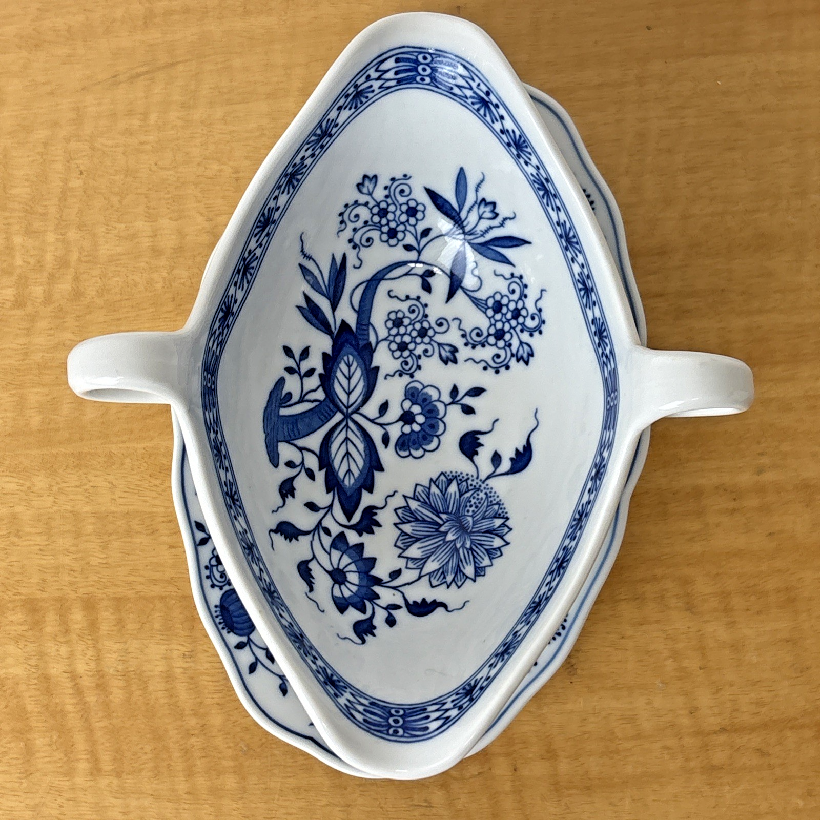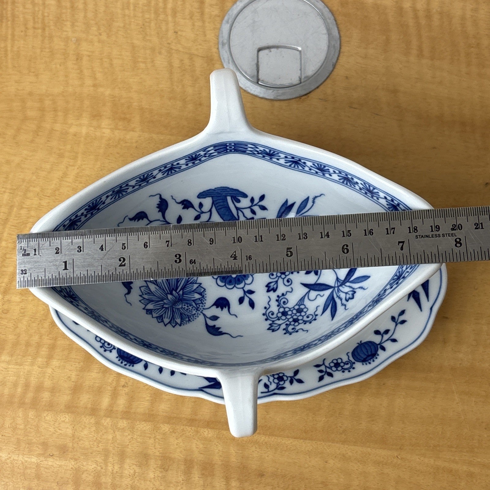 Hutschenreuther VTG Blue Onion Gravy Boat Attached Dish Loop Handles, Germany