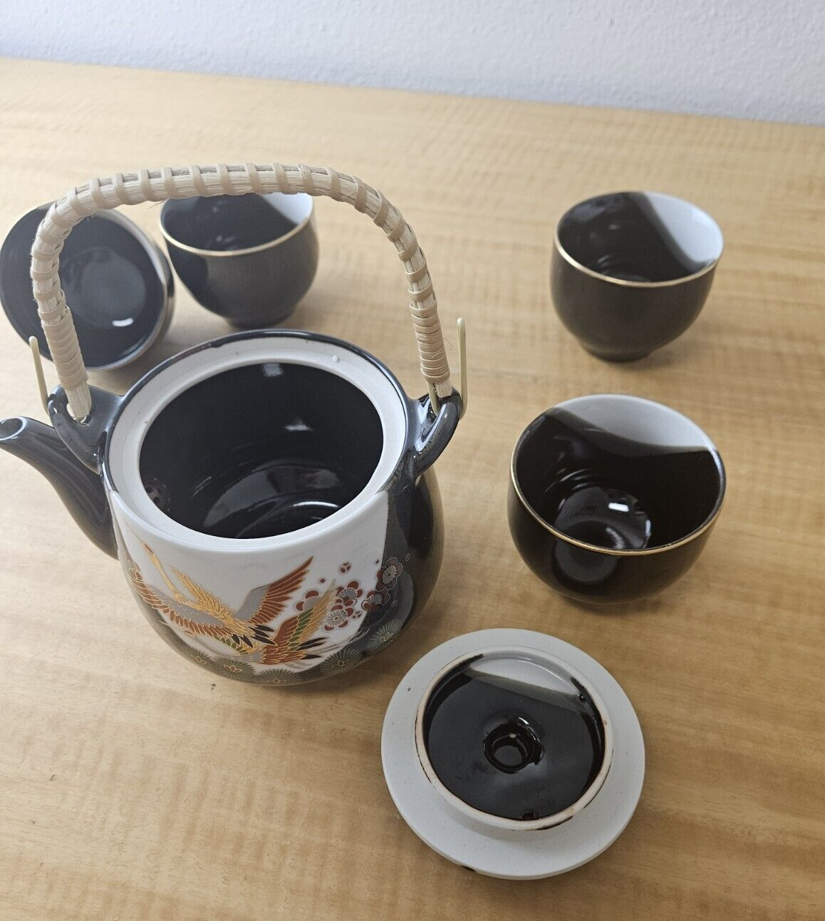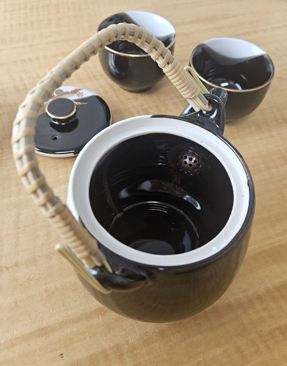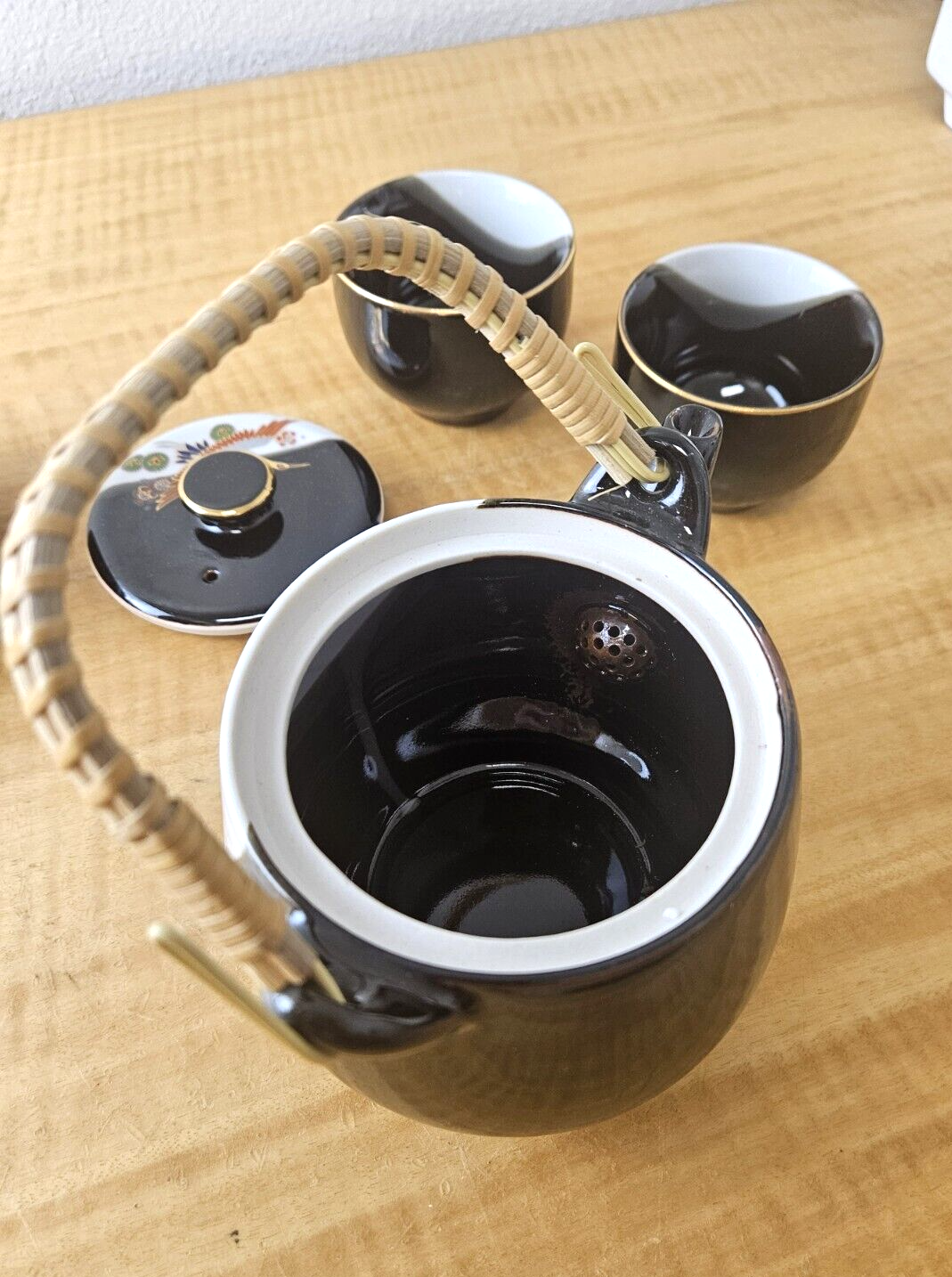 JAPAN PORCELIAN TEA POT CUP SET BLACK with Gold trim and accents