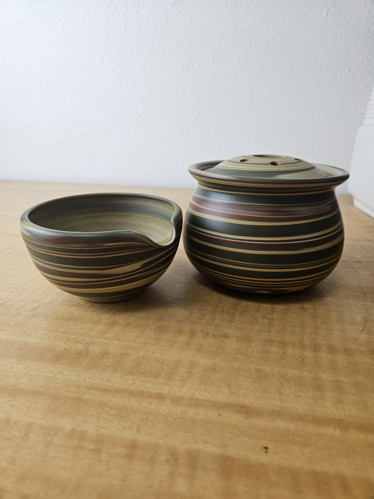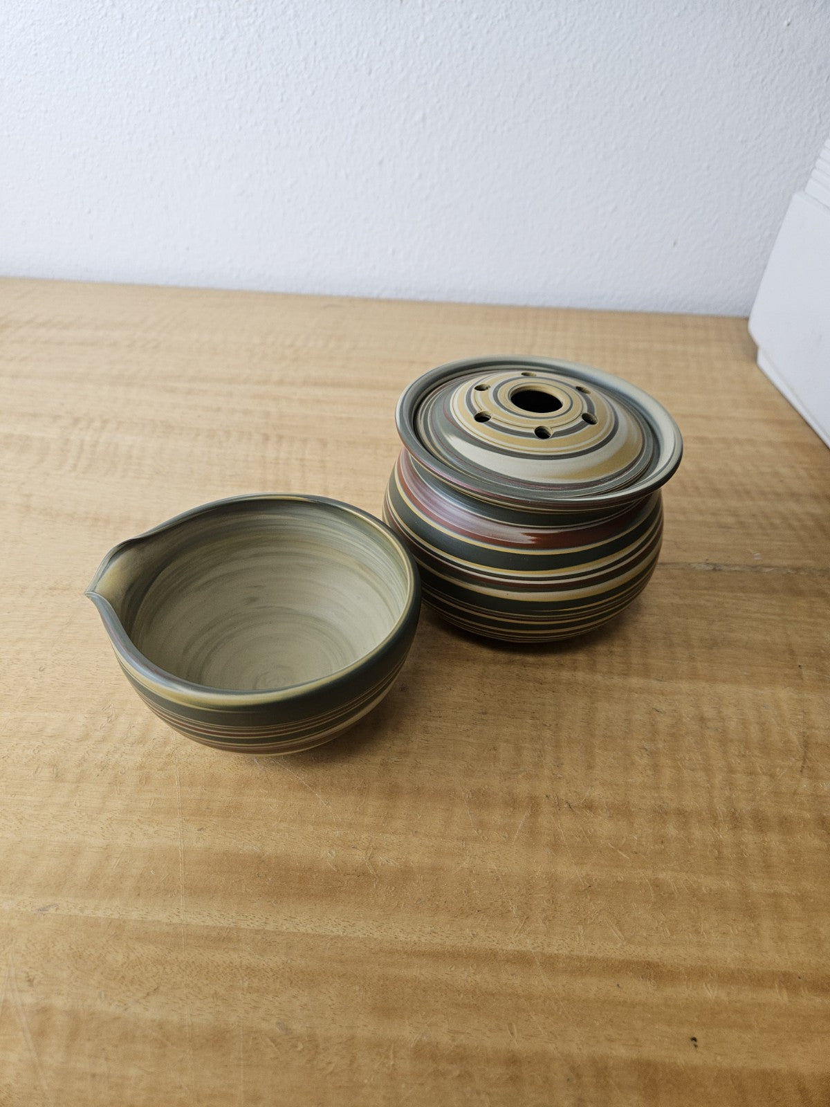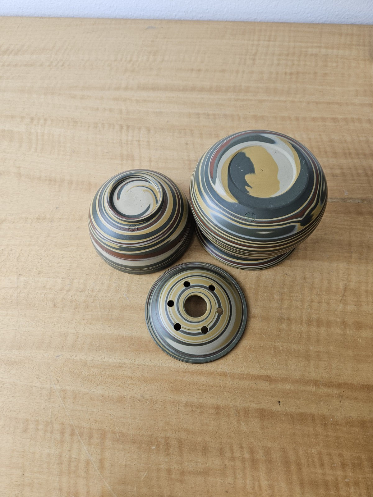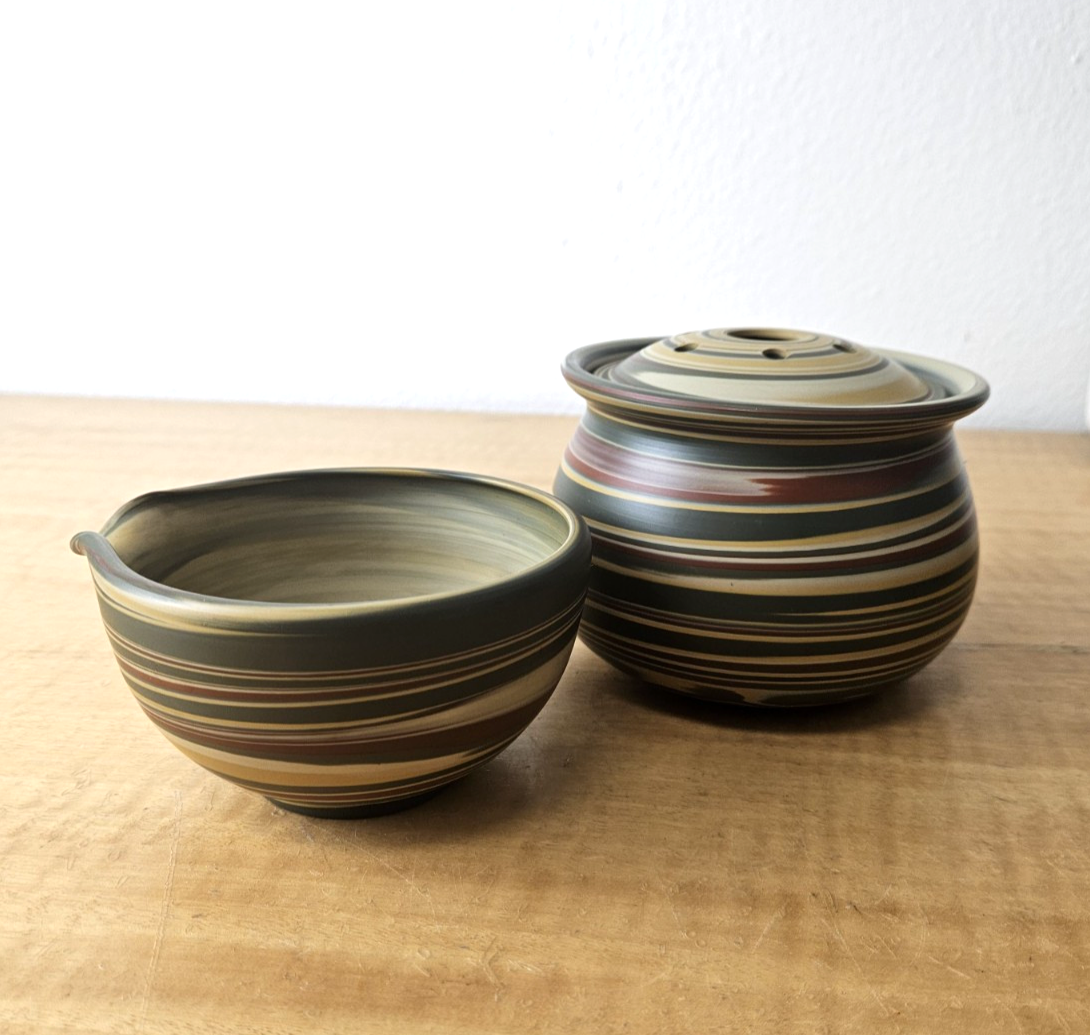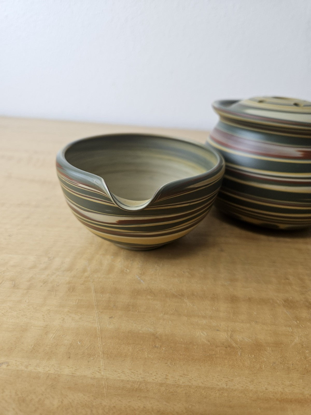 Japanese Tokoname Ware Nerikomi set stamped, bowl with spout, covered pot