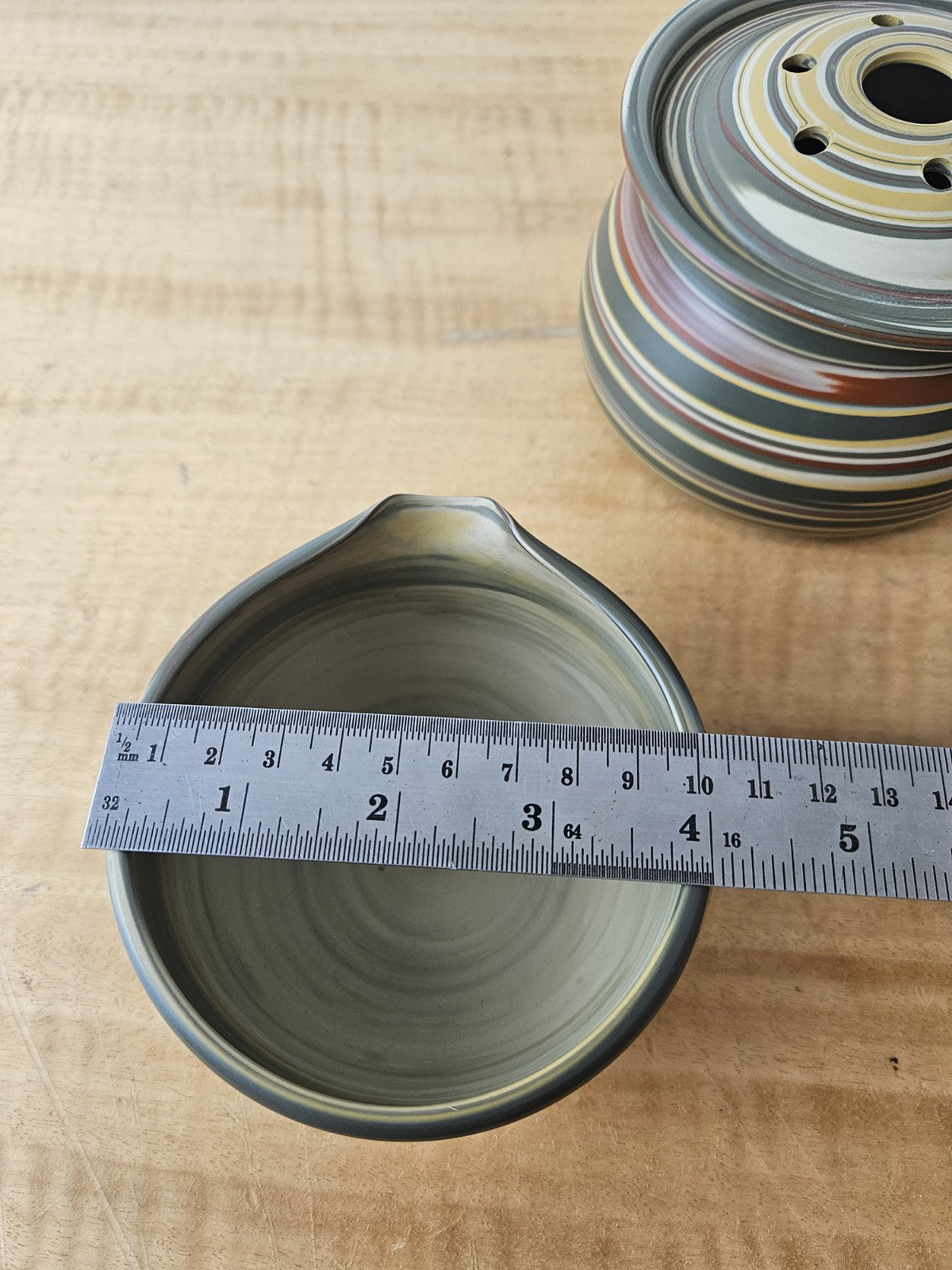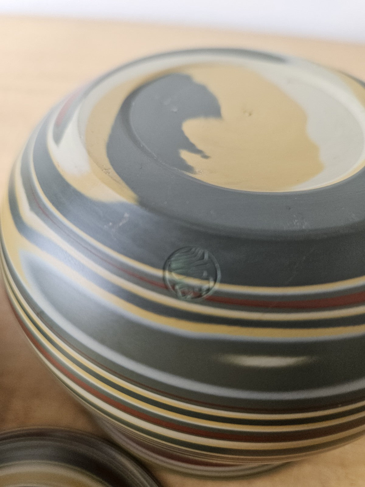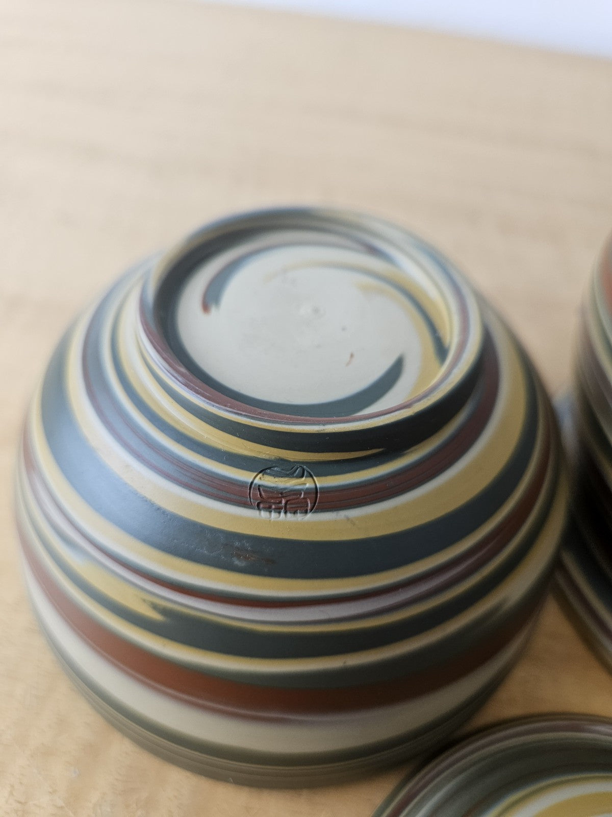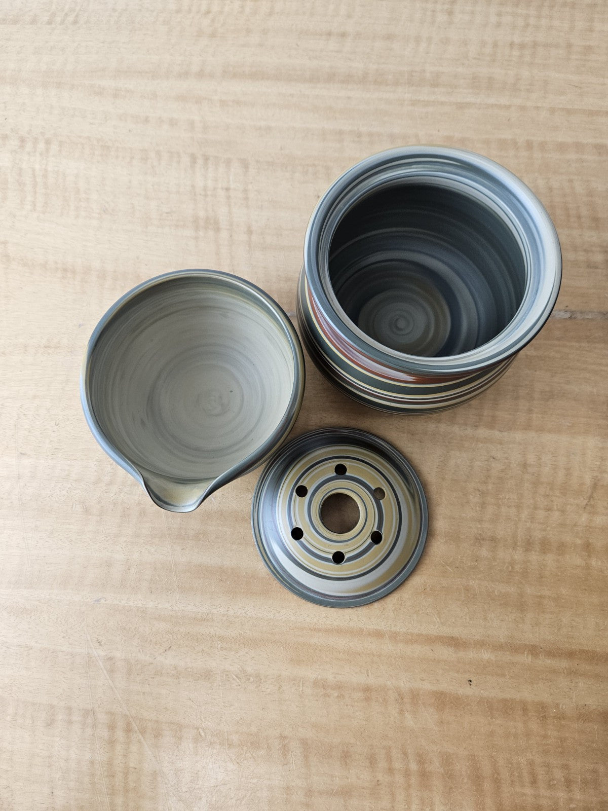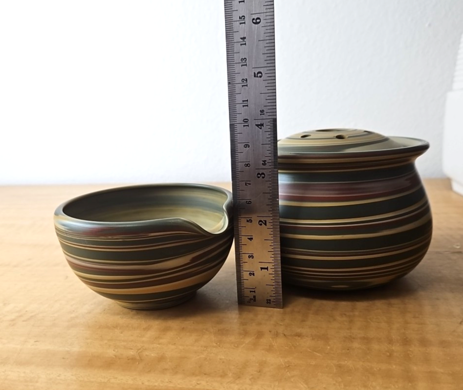 Japanese Tokoname Ware Nerikomi set stamped, bowl with spout, covered pot