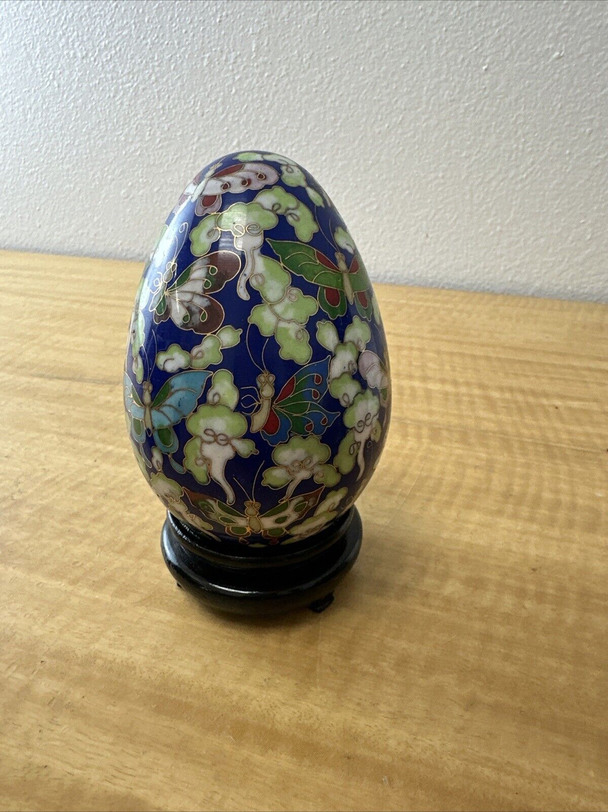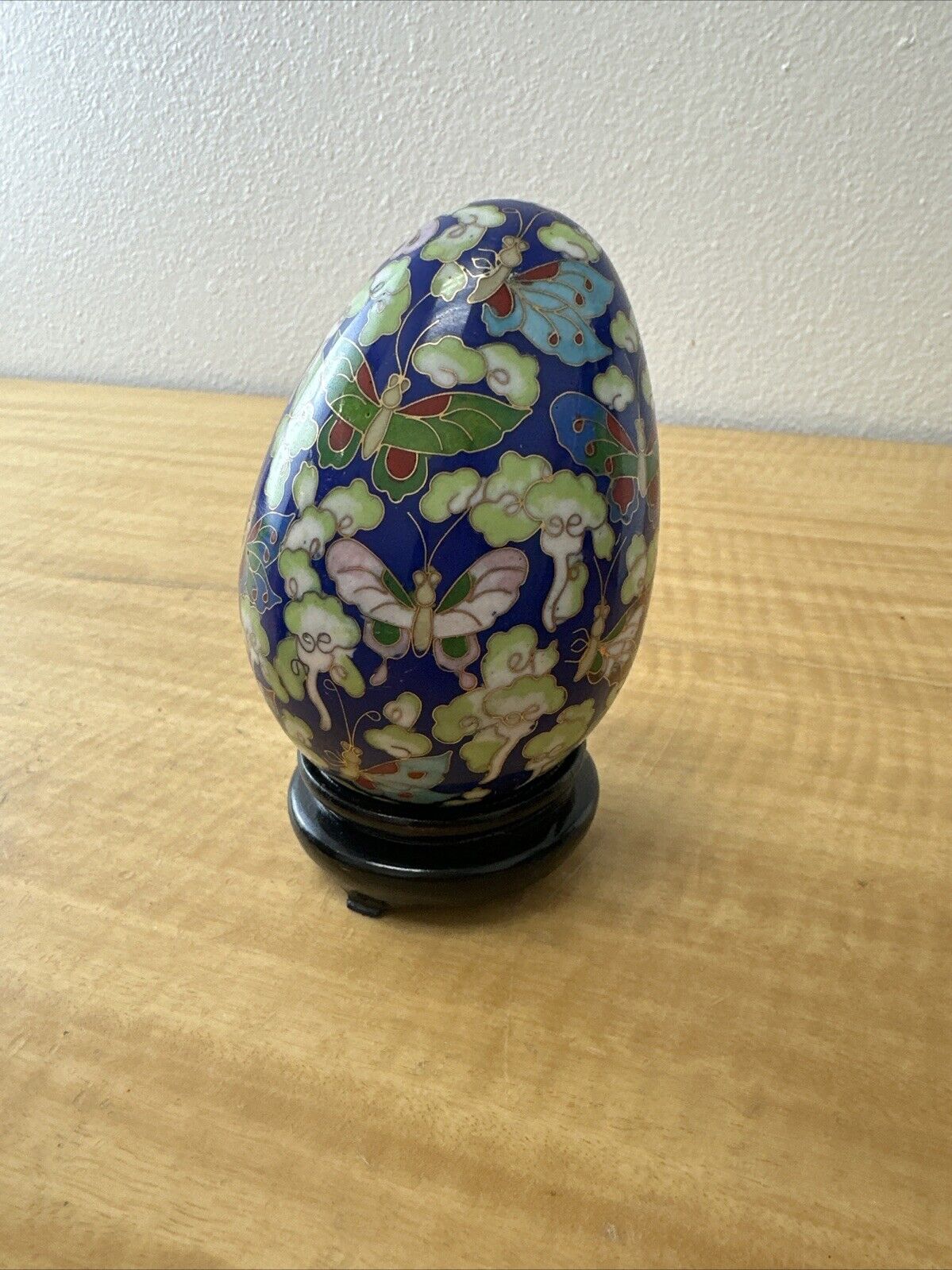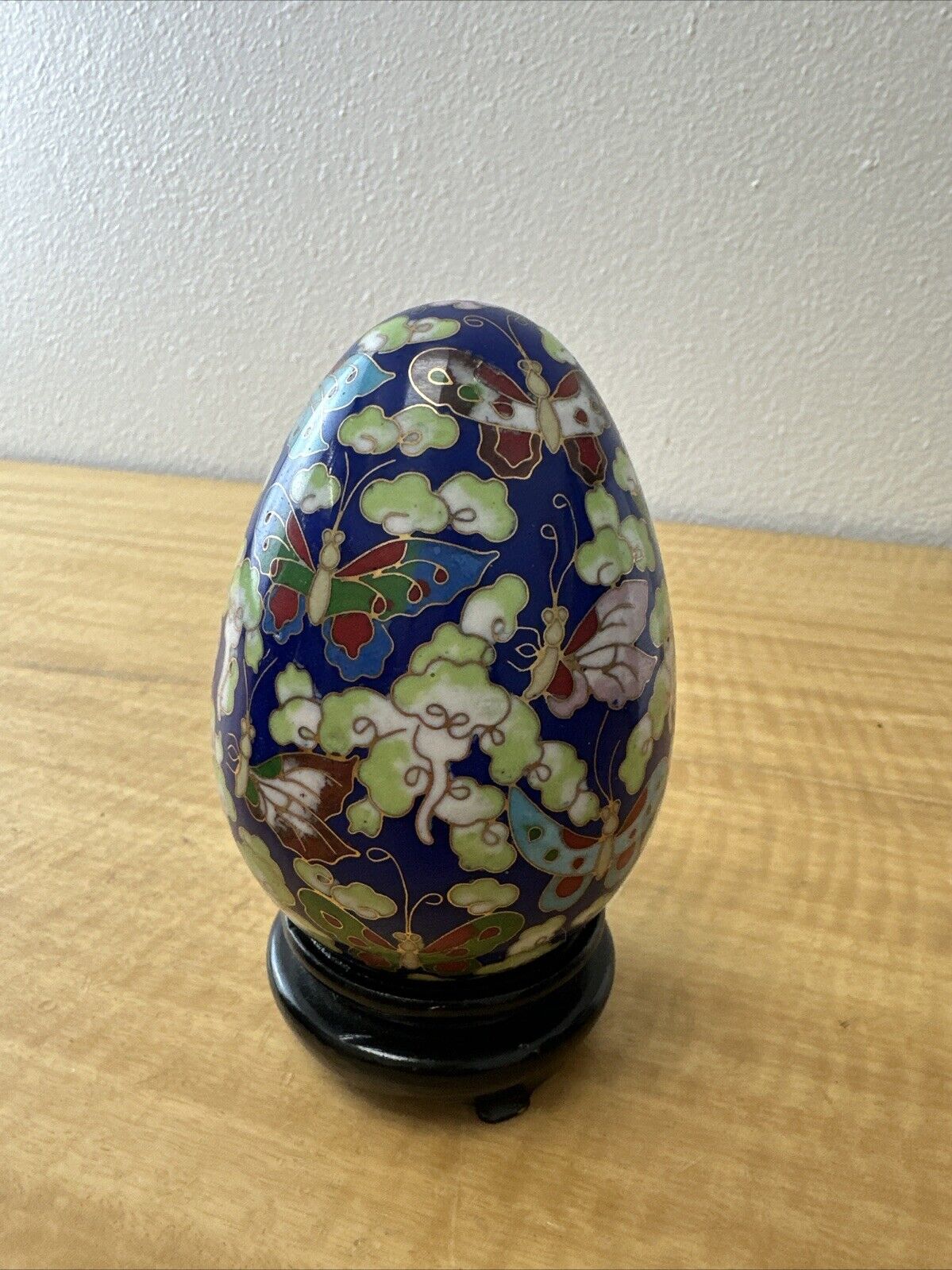 Large Cloisonne Enamil Egg with Wooden Stand, 5”Tall, Butterfly Pattern