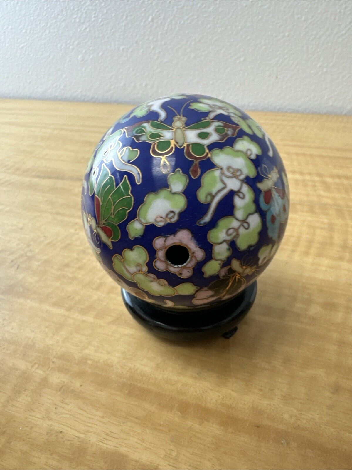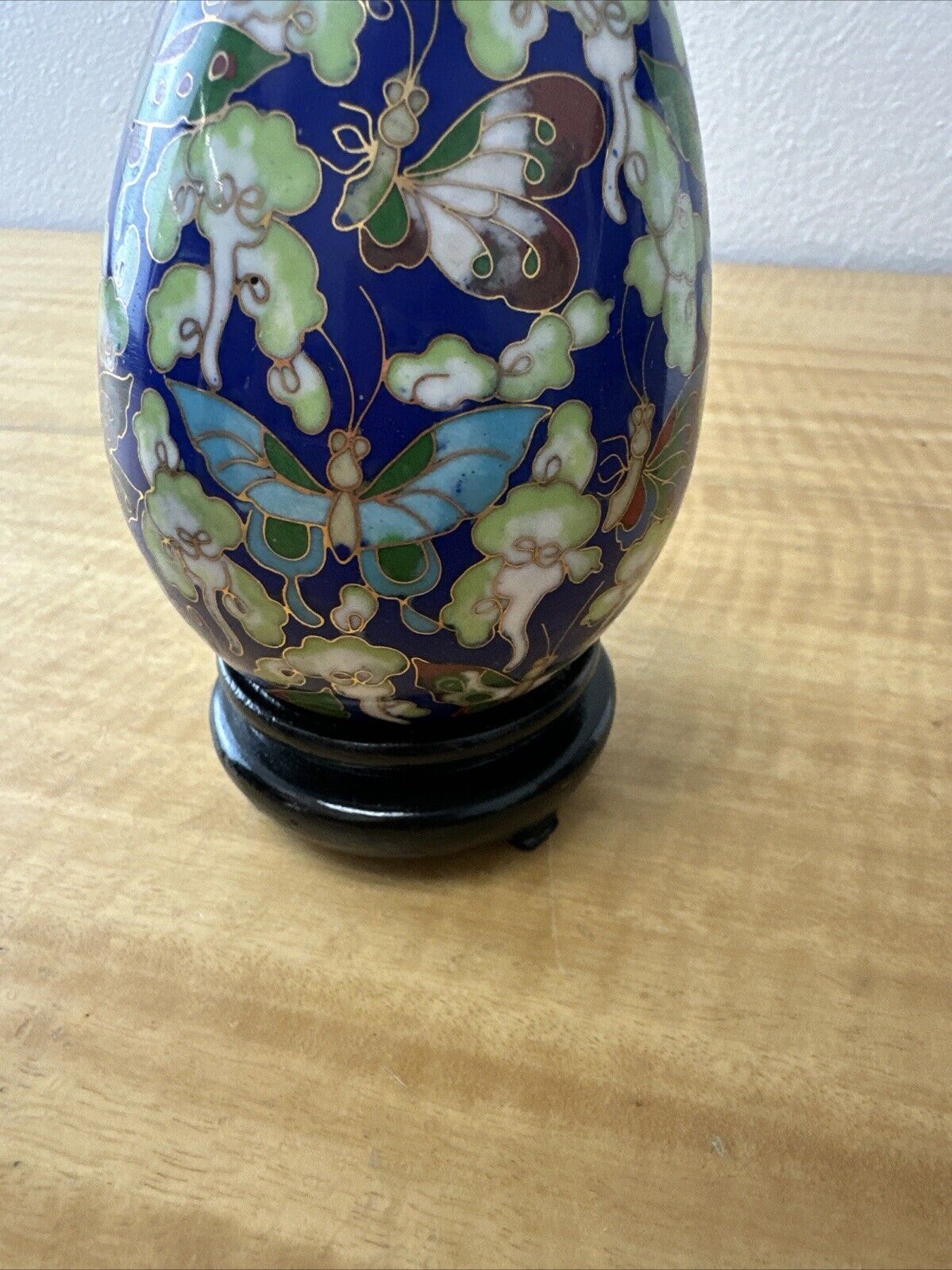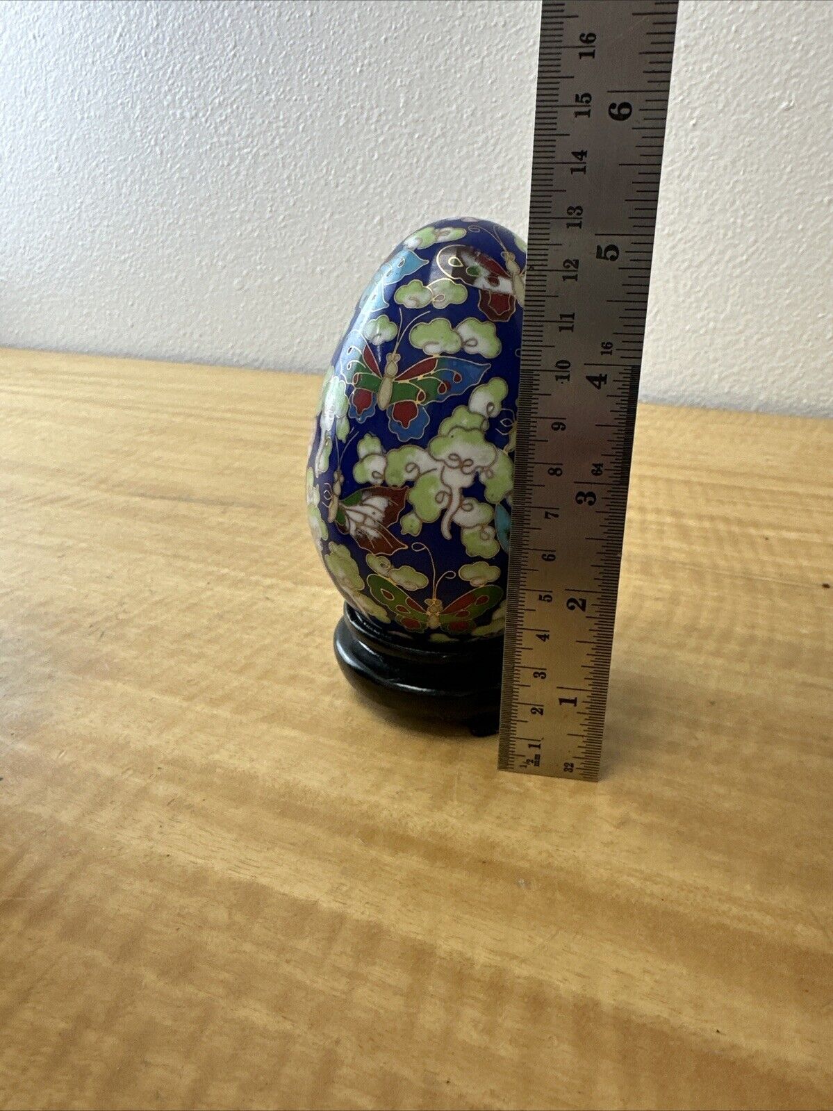 Large Cloisonne Enamil Egg with Wooden Stand, 5”Tall, Butterfly Pattern