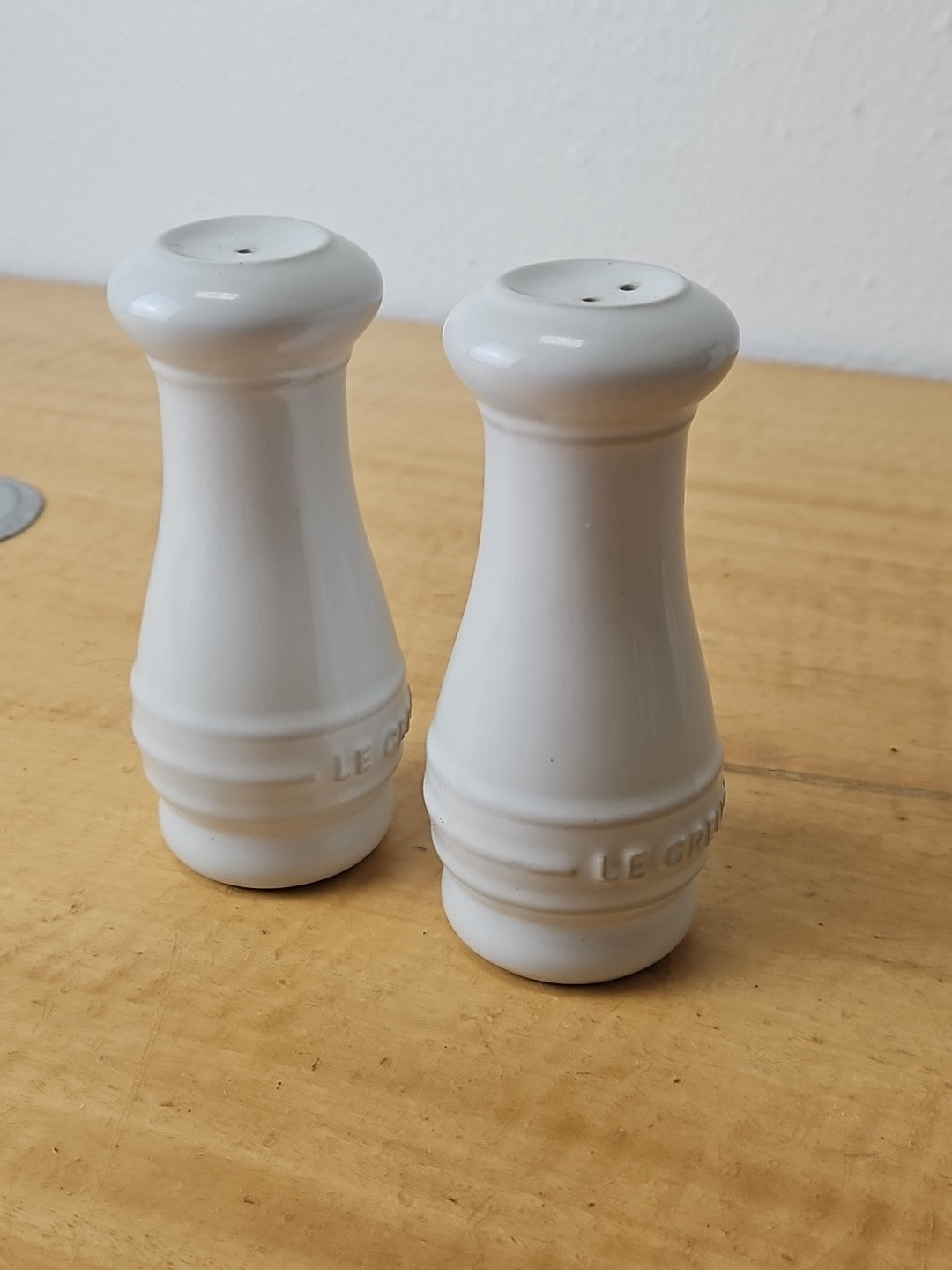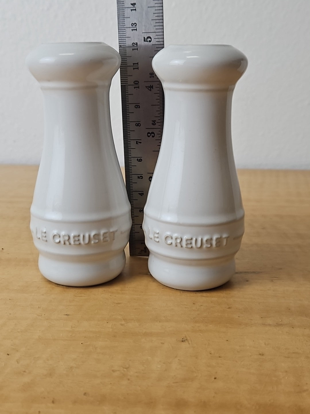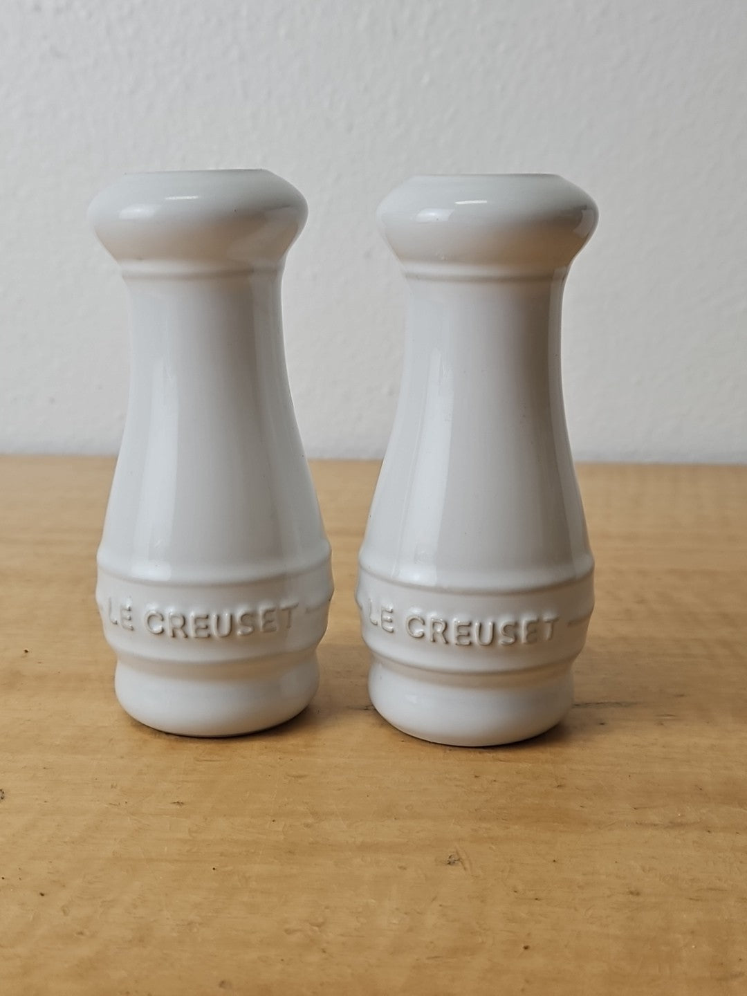 LE CREUSET white Salt & Pepper Shakers Set Stoneware Tall with stoppers