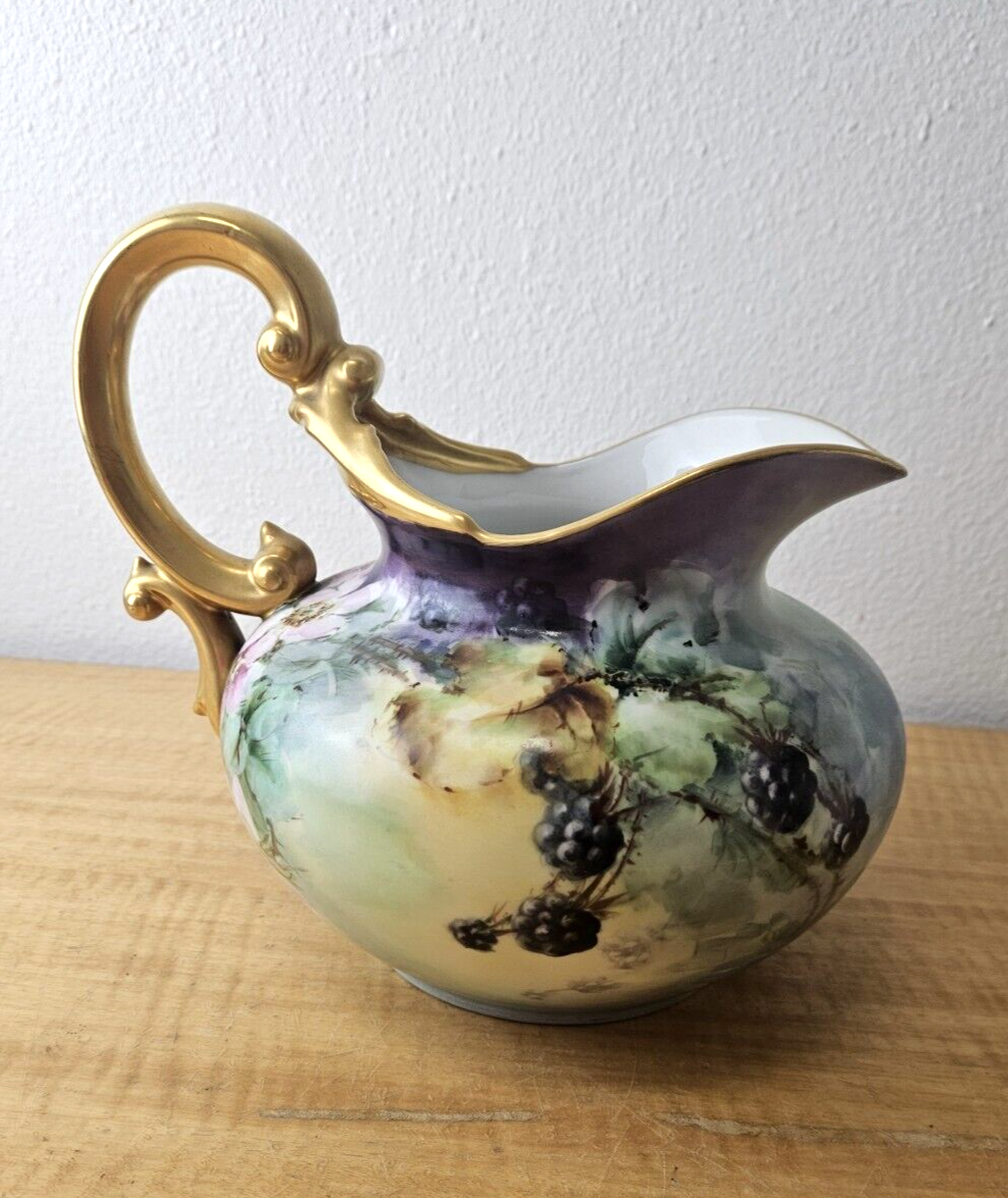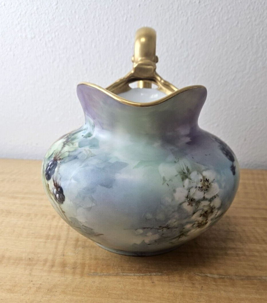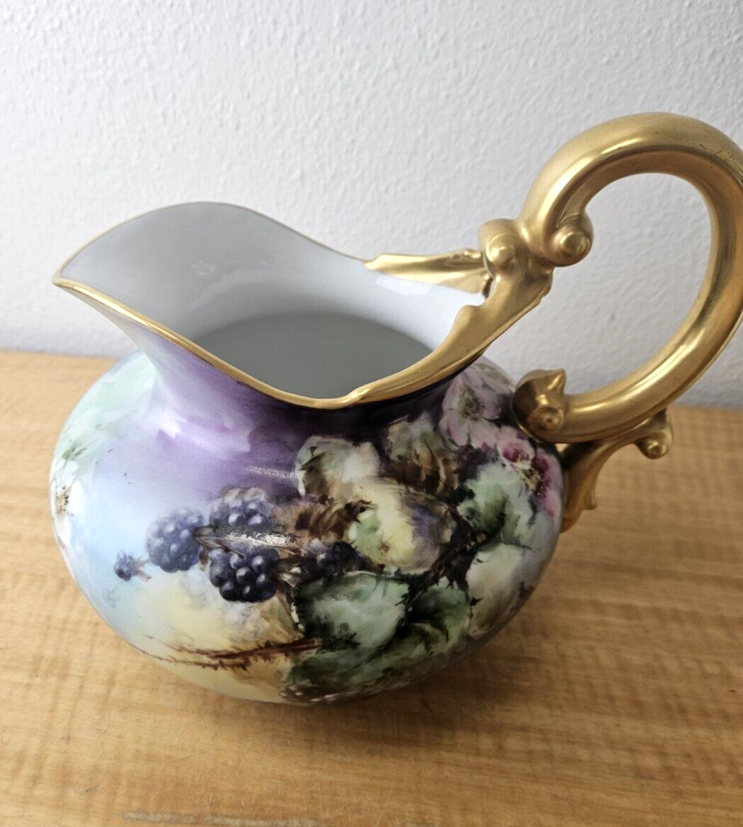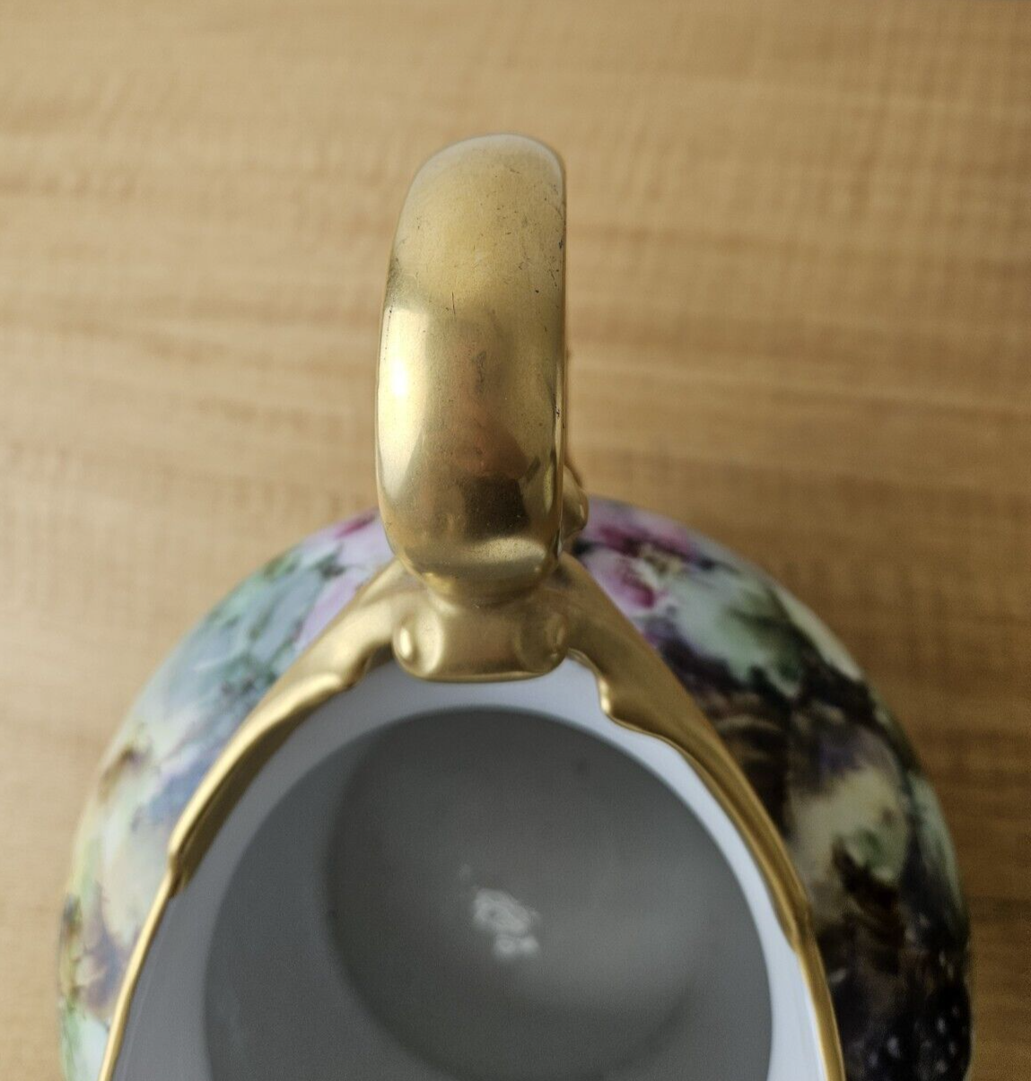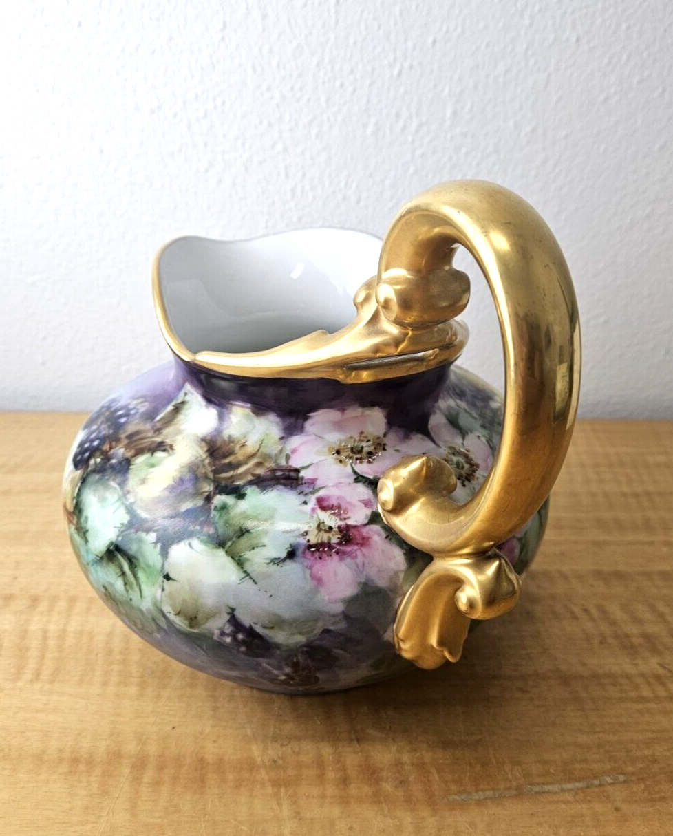 LIMOGES France large pitcher Purple Floral with Gold handle and trim