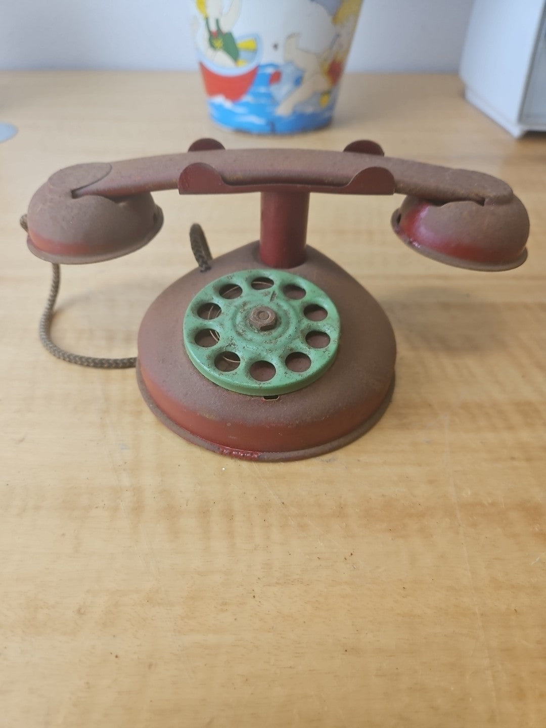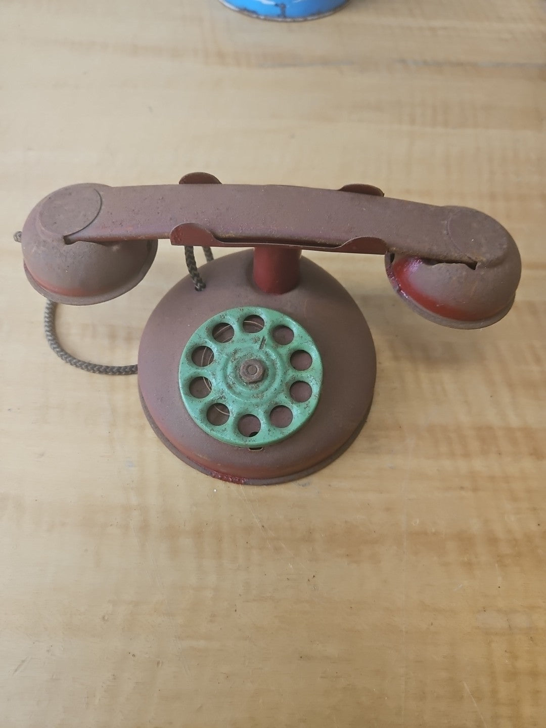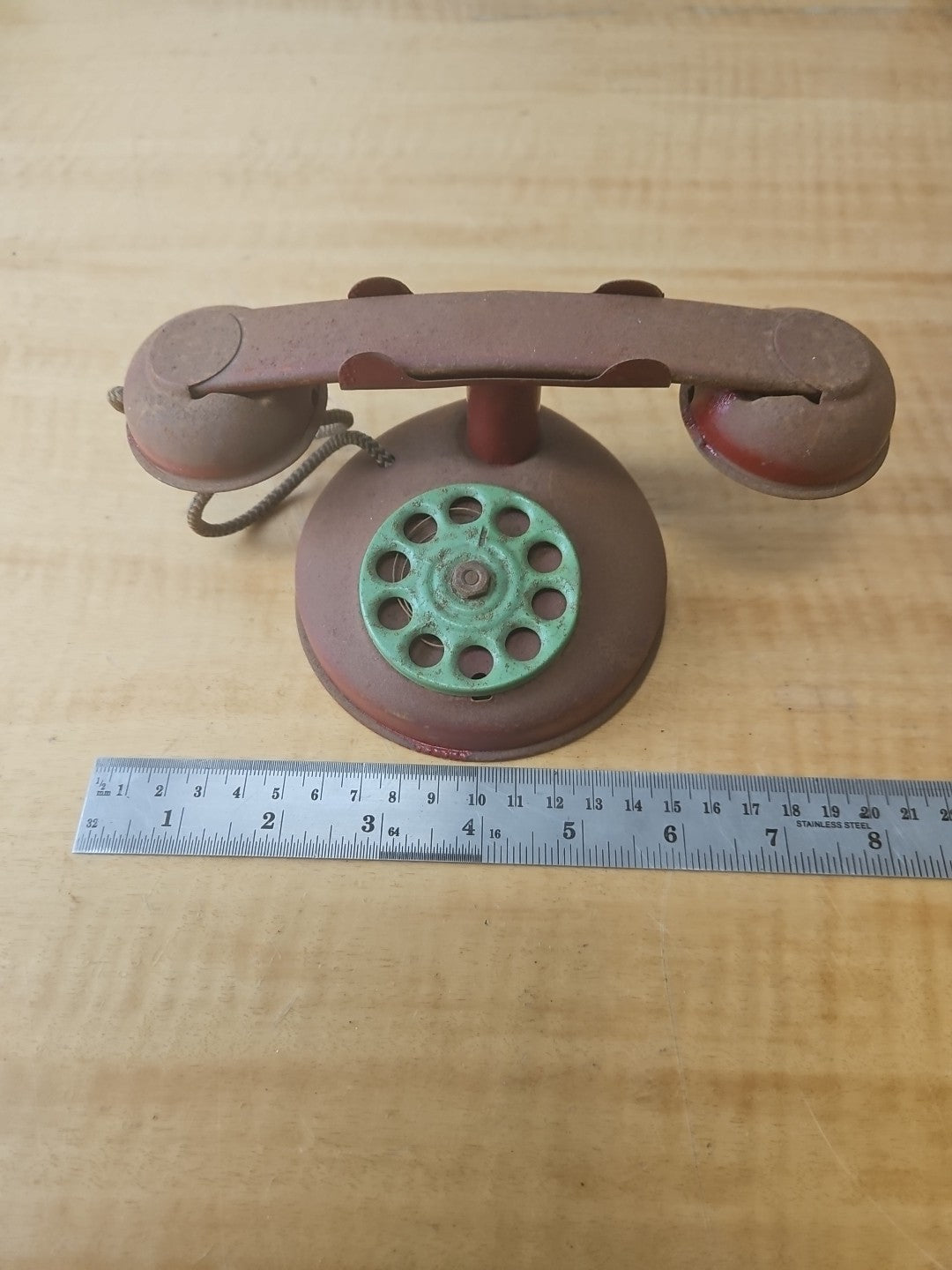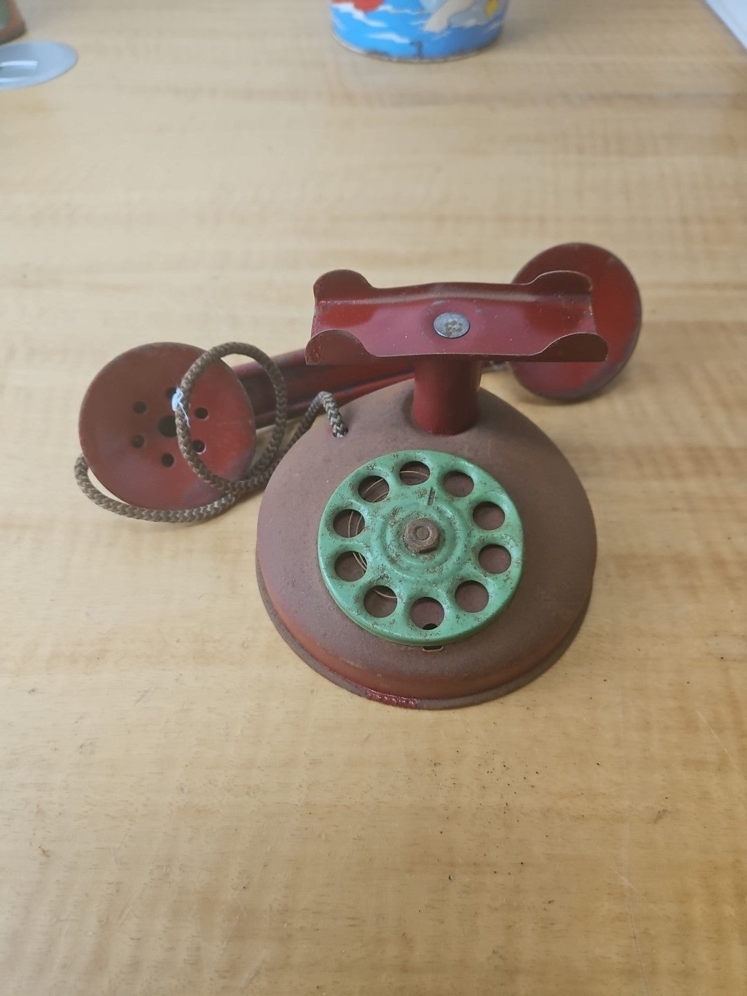 Metal Toy Phone, red, green dial, vintage, rotary, small