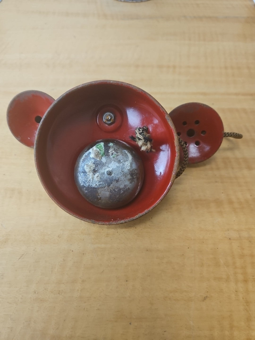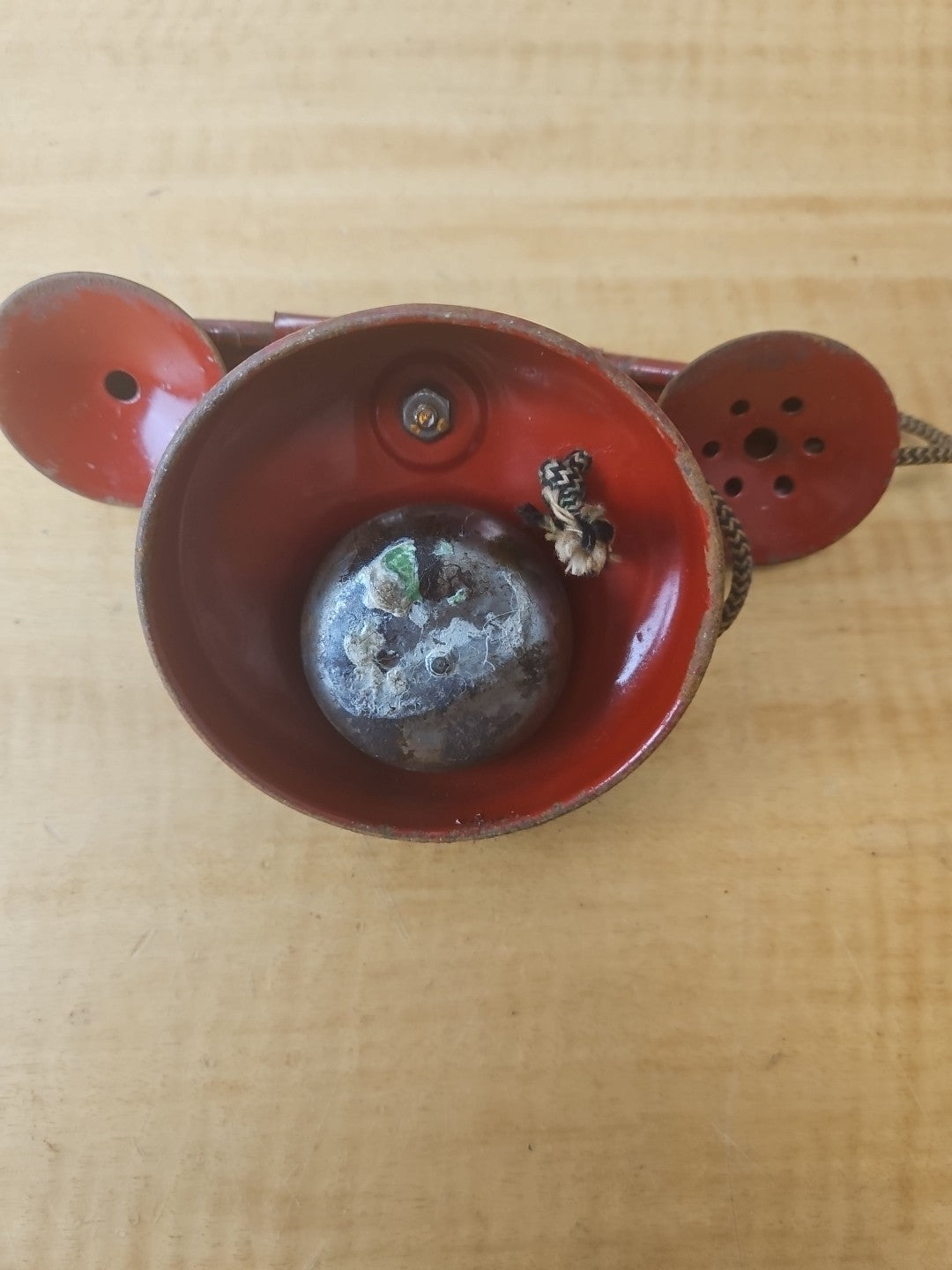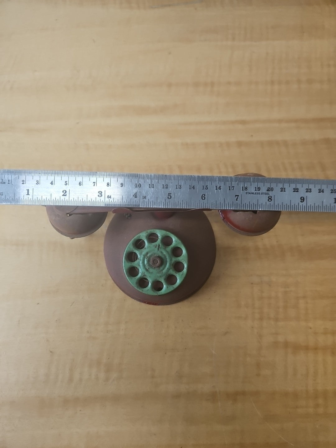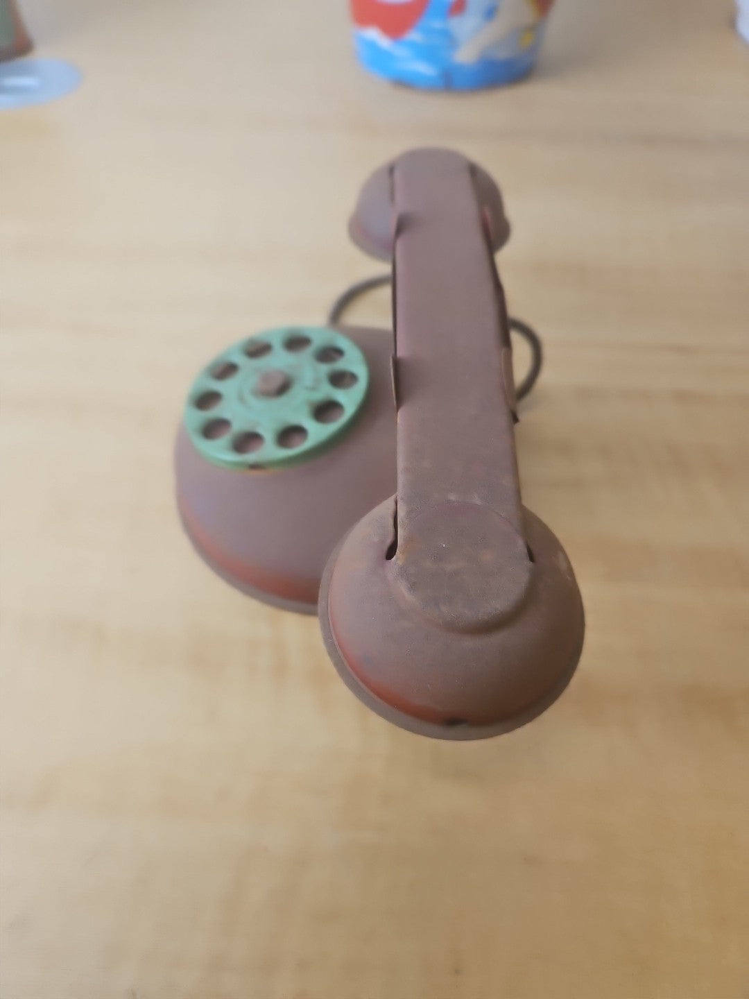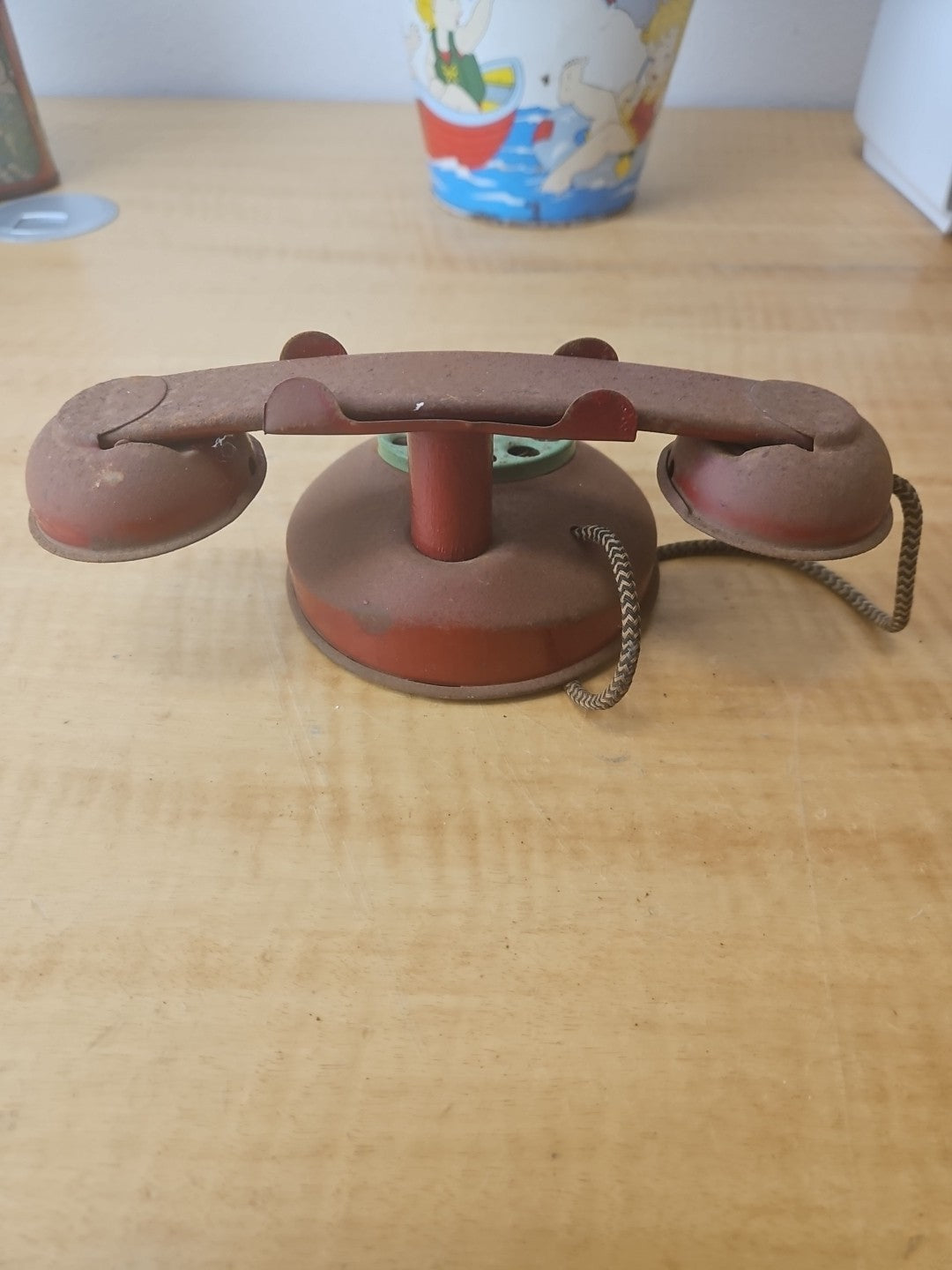 Metal Toy Phone, red, green dial, vintage, rotary, small
