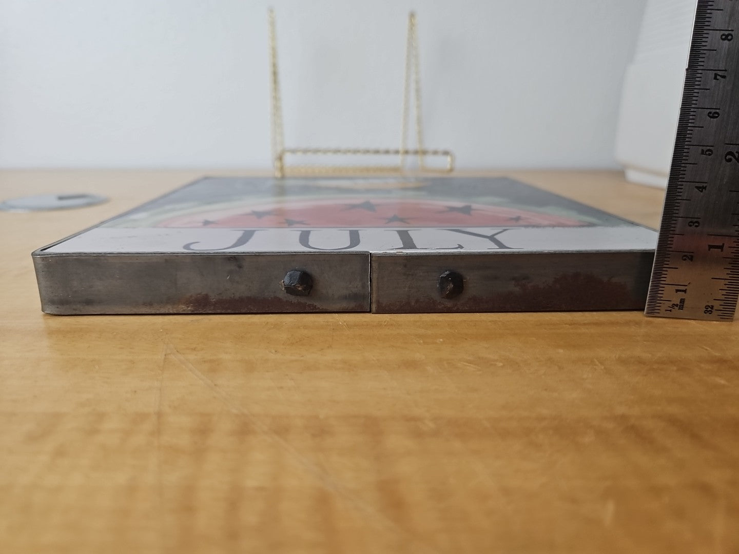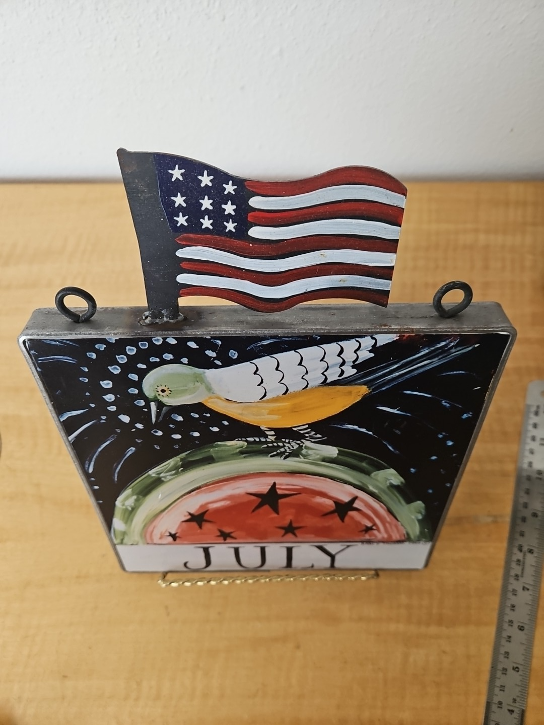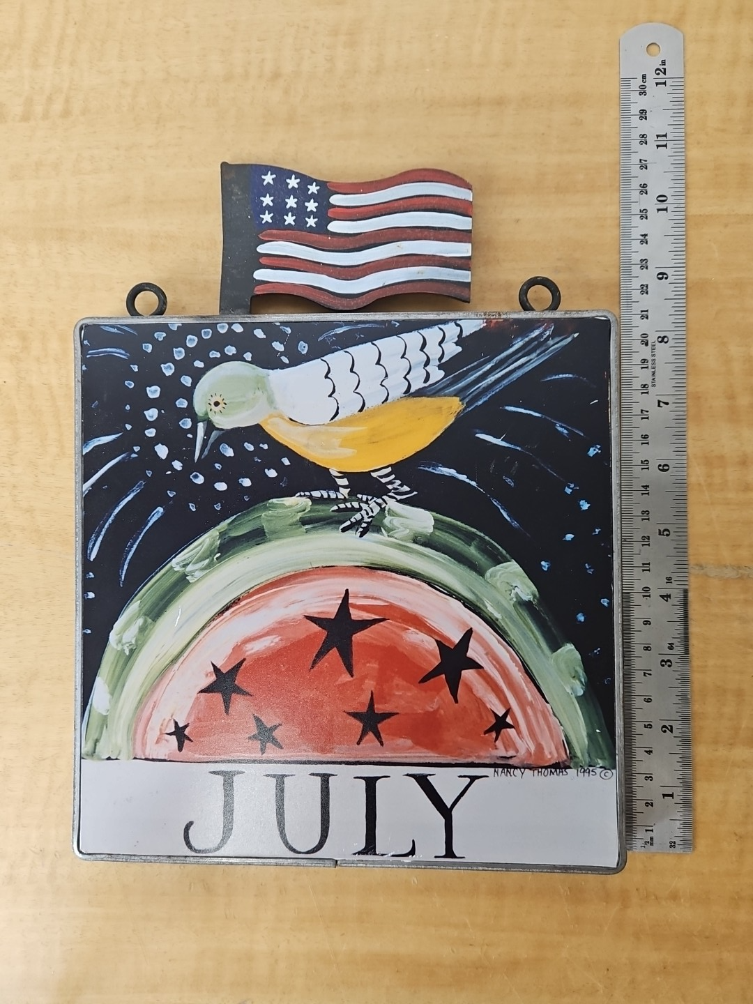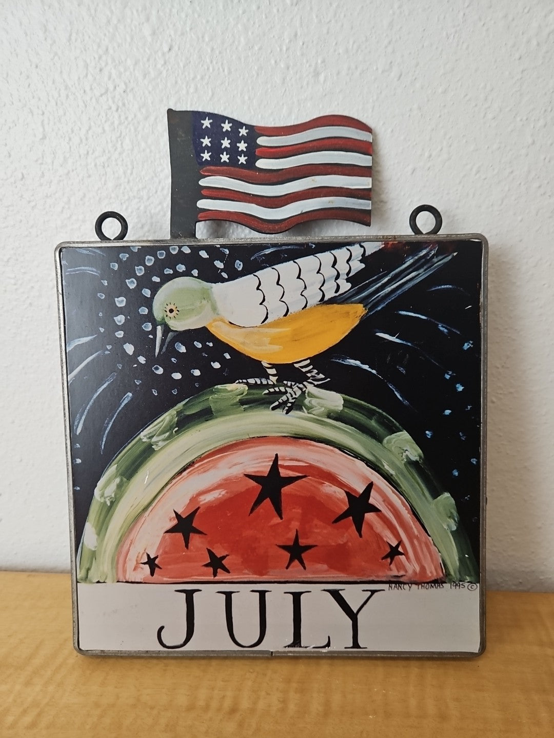 Nancy Thomas Folk Art Wall Plaque ~ JULY Watermelon Bird Summer Flag