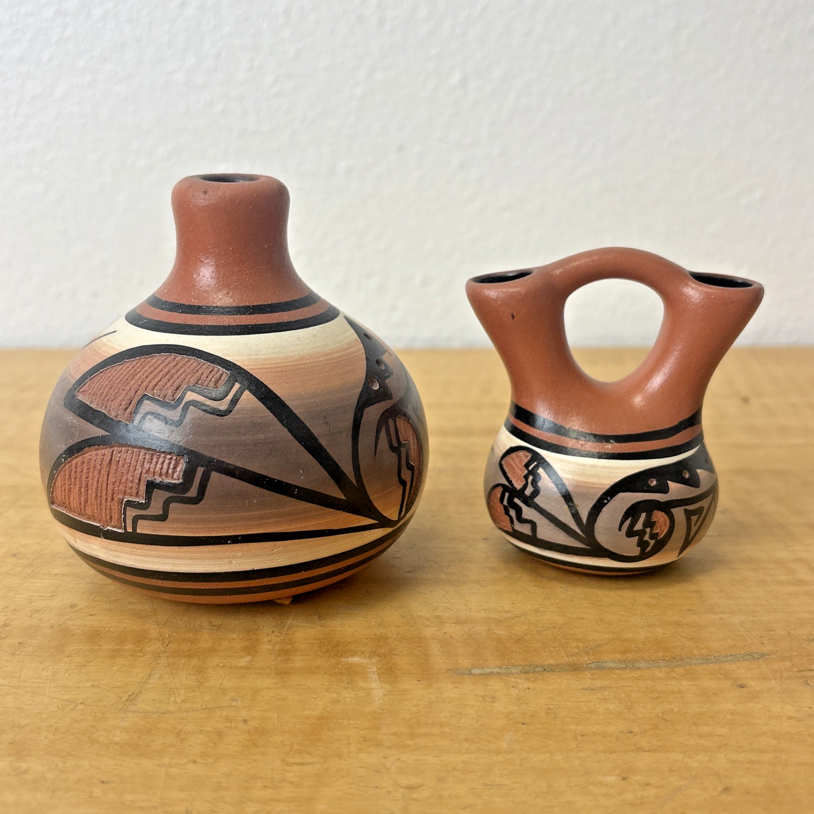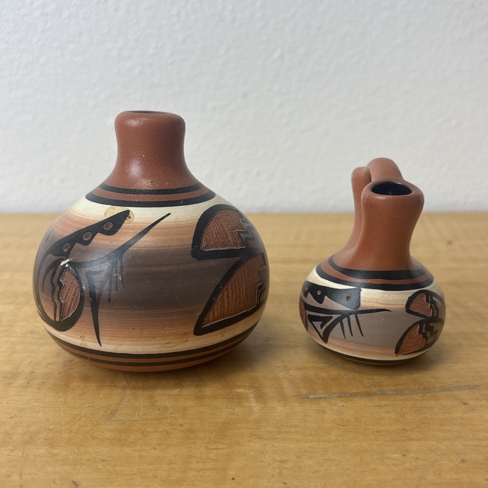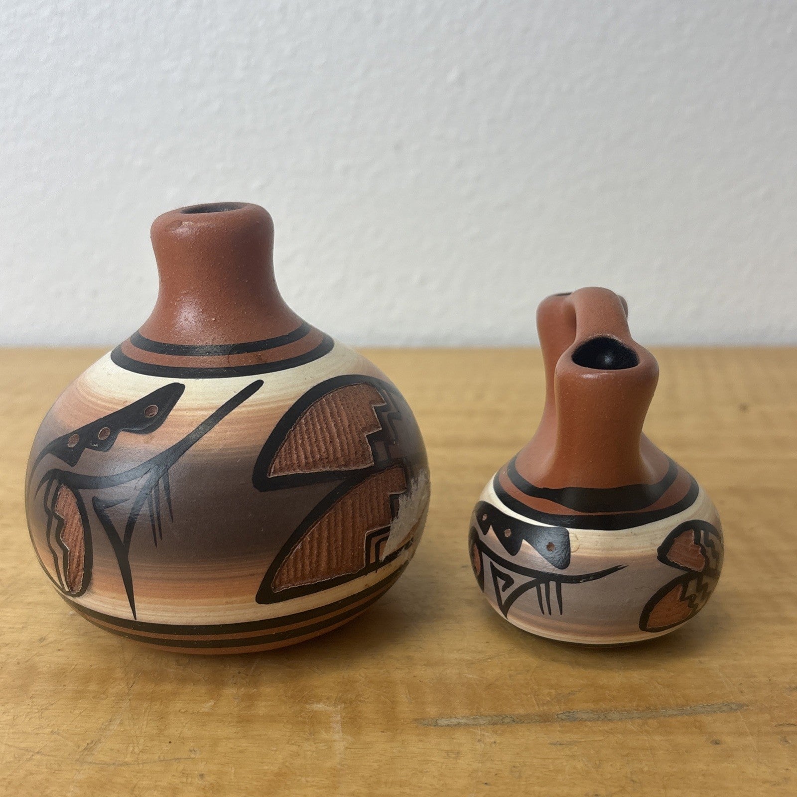 Navajo Hand Painted Wedding Vase and Bud Vase Red Clay Pottery Set