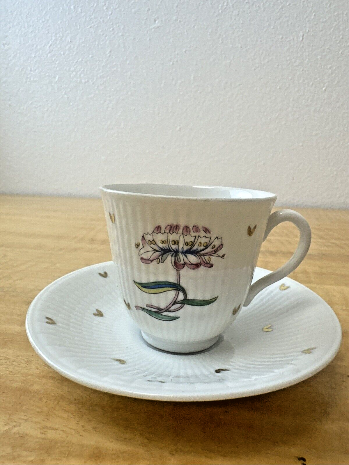 One Sweden Rorstrand Smaland Linnea Gold Rim Floral CoffeeTea Cup and Saucer Set
