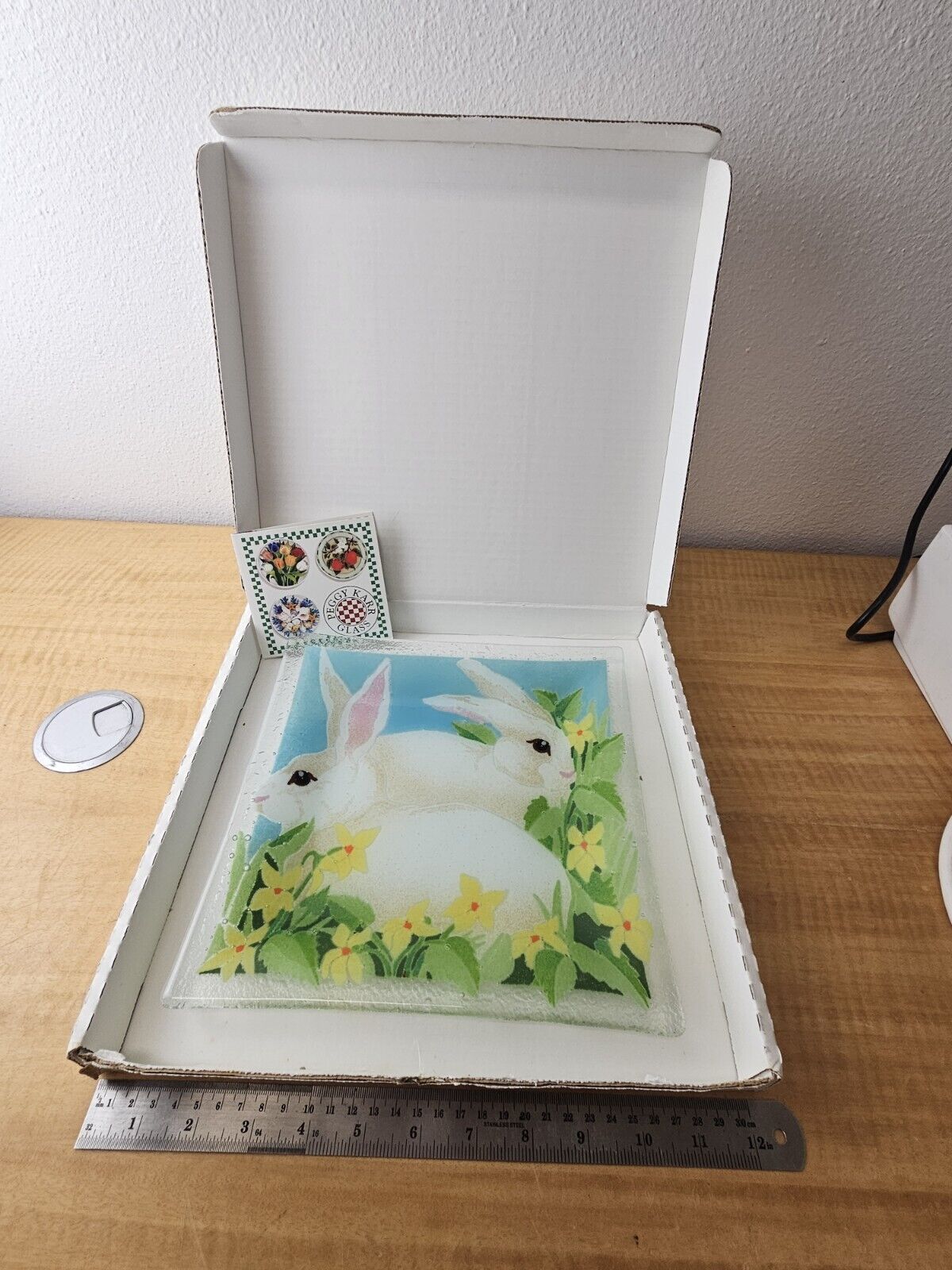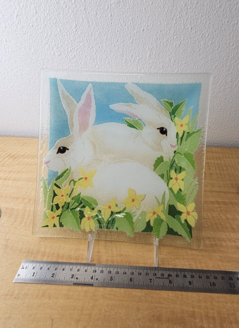 Peggy Karr Easter Bunnies Rabbits 10" SQUARE Fused Glass Plate Signed BU10S