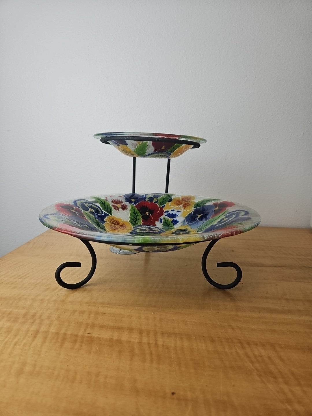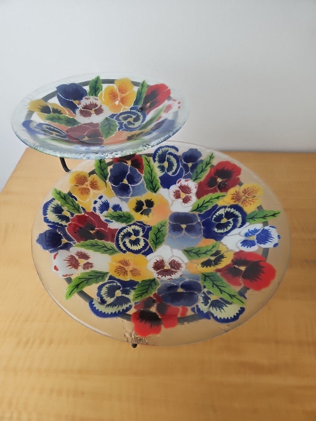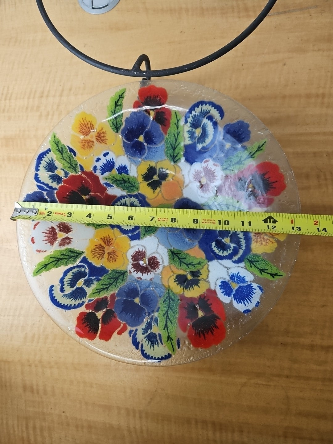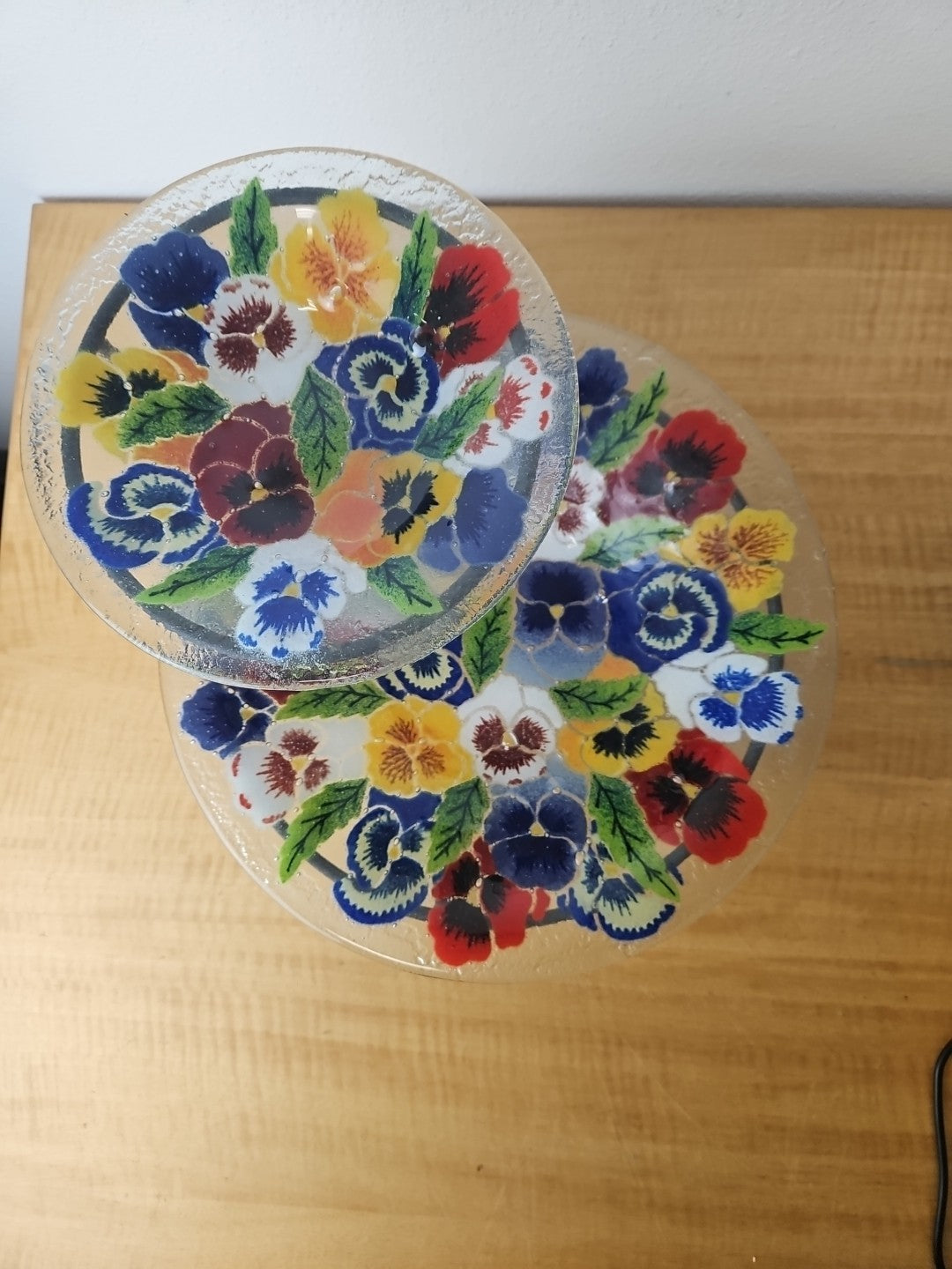 Peggy Karr Glass Pansy Bowl Set with metal holder Art Glass 13 1/4" and 8 3/8"