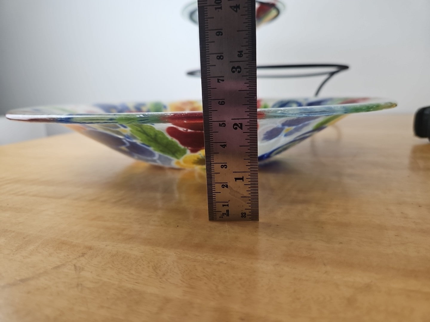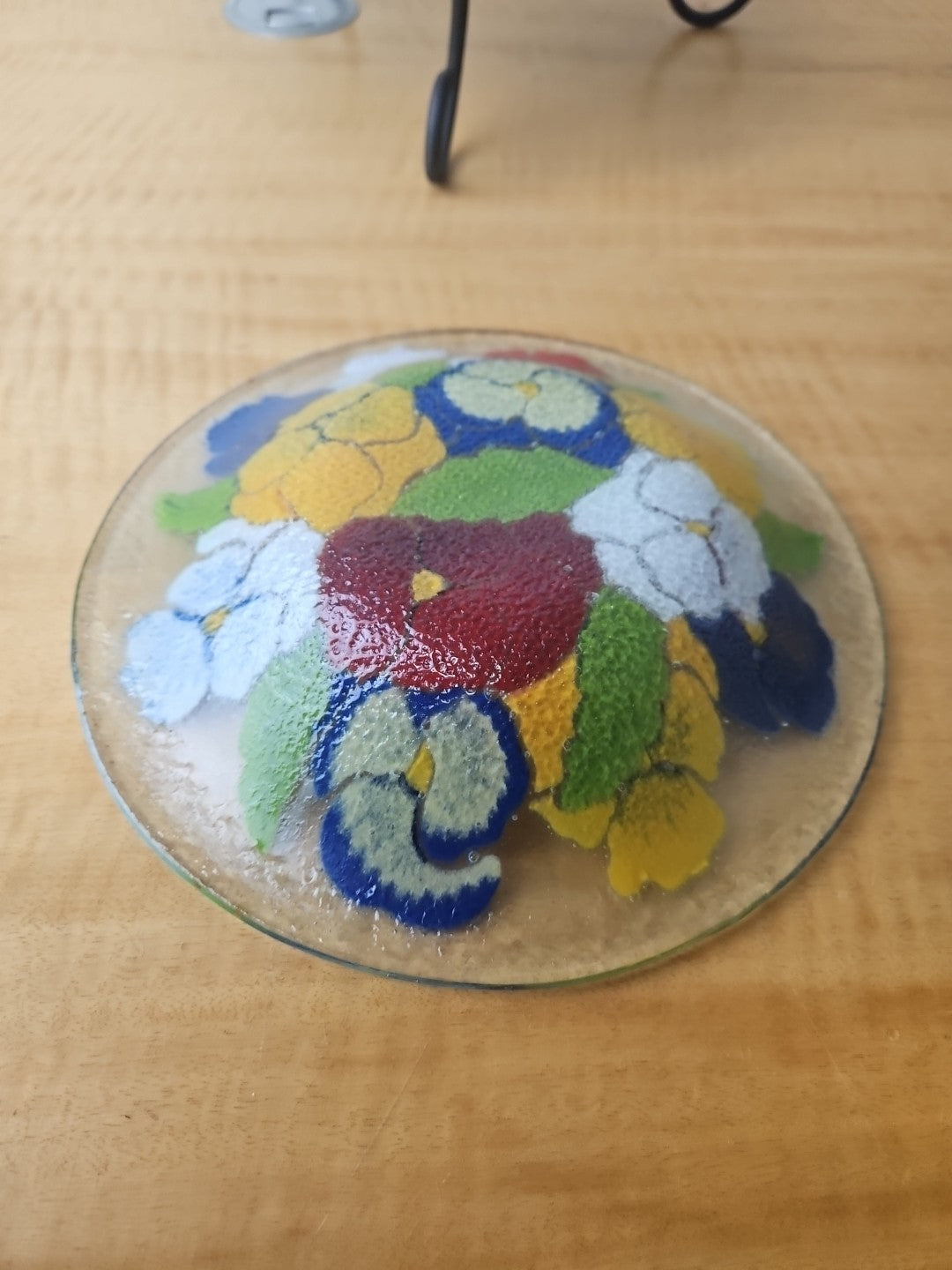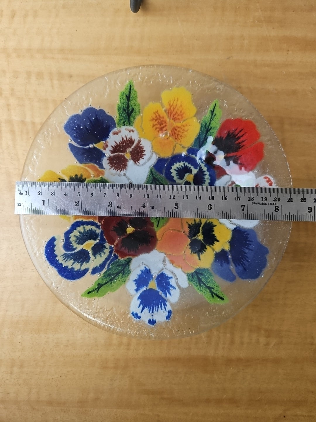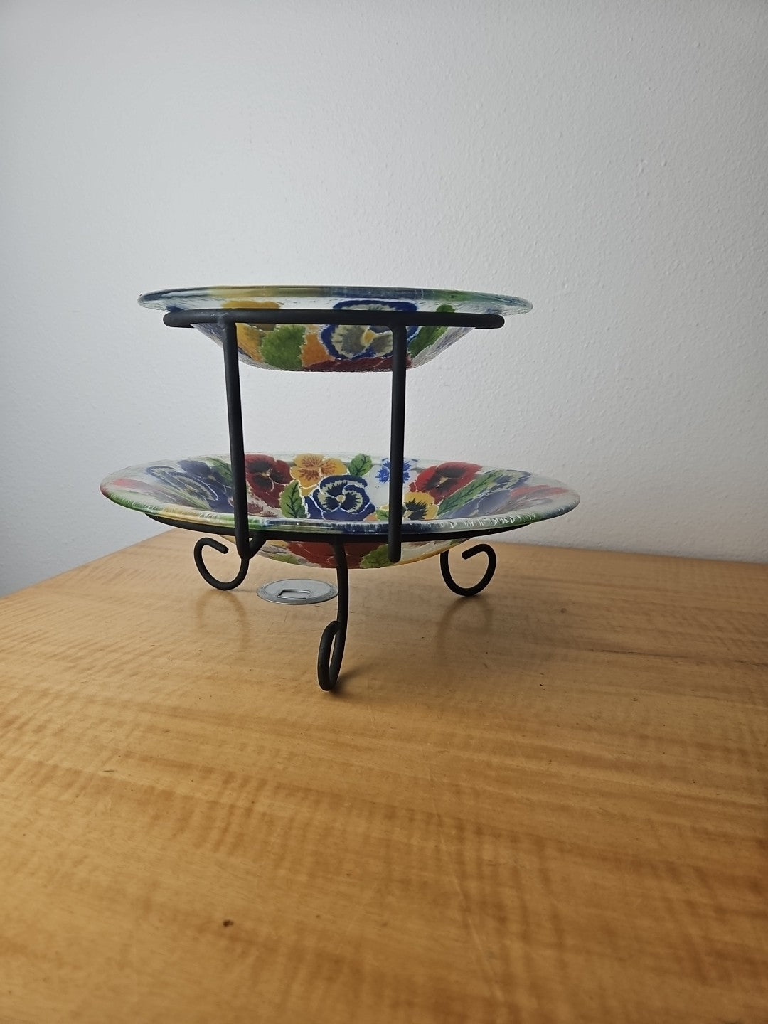 Peggy Karr Glass Pansy Bowl Set with metal holder Art Glass 13 1/4" and 8 3/8"