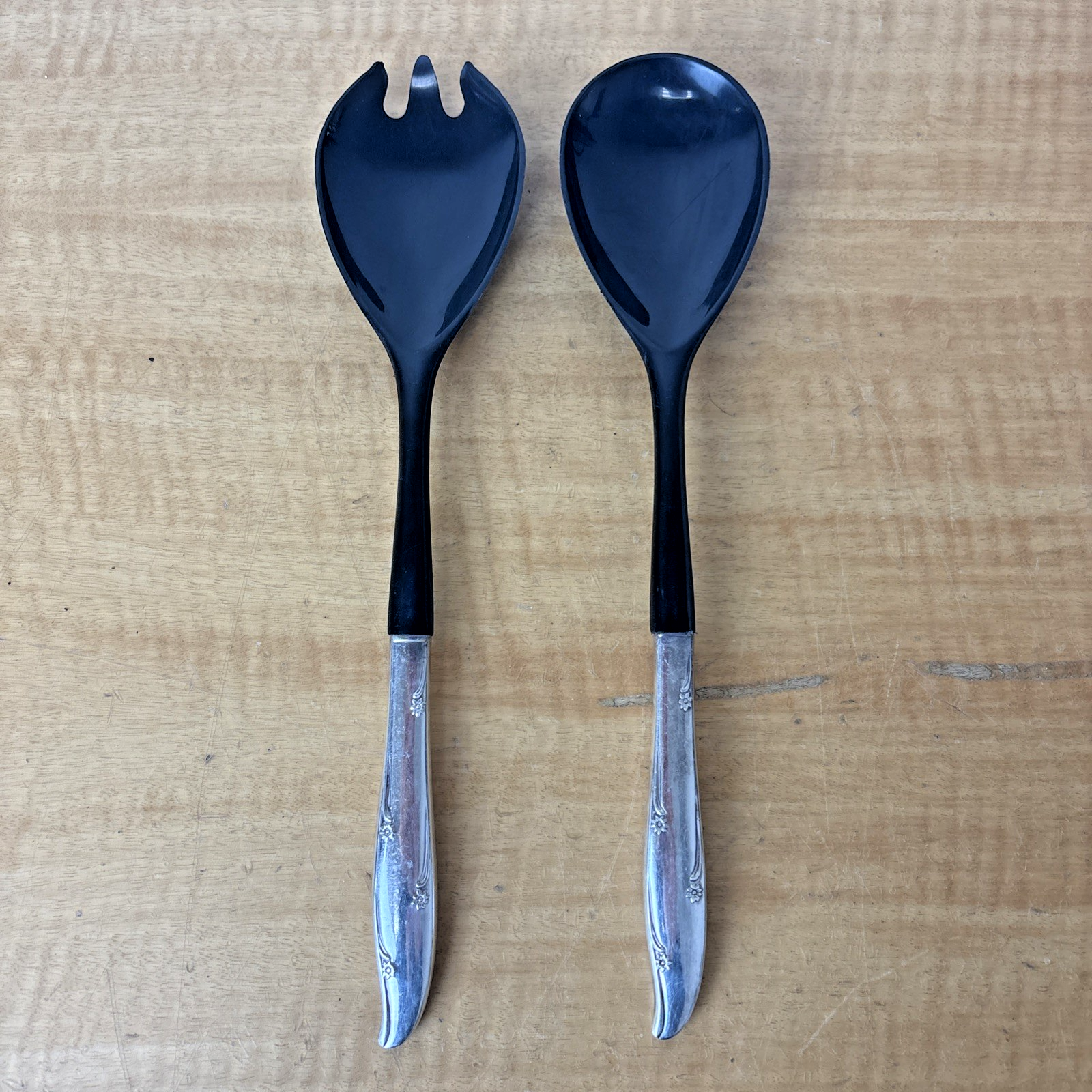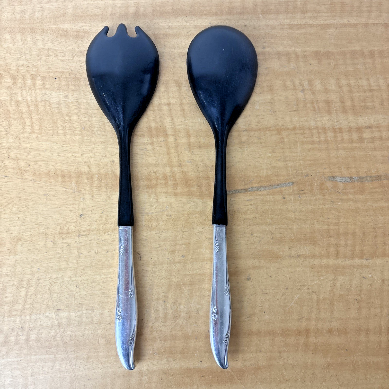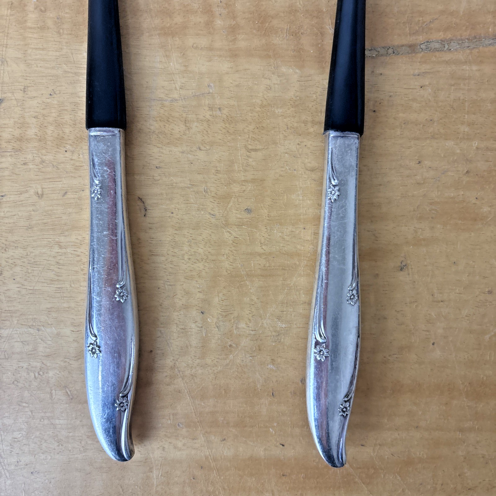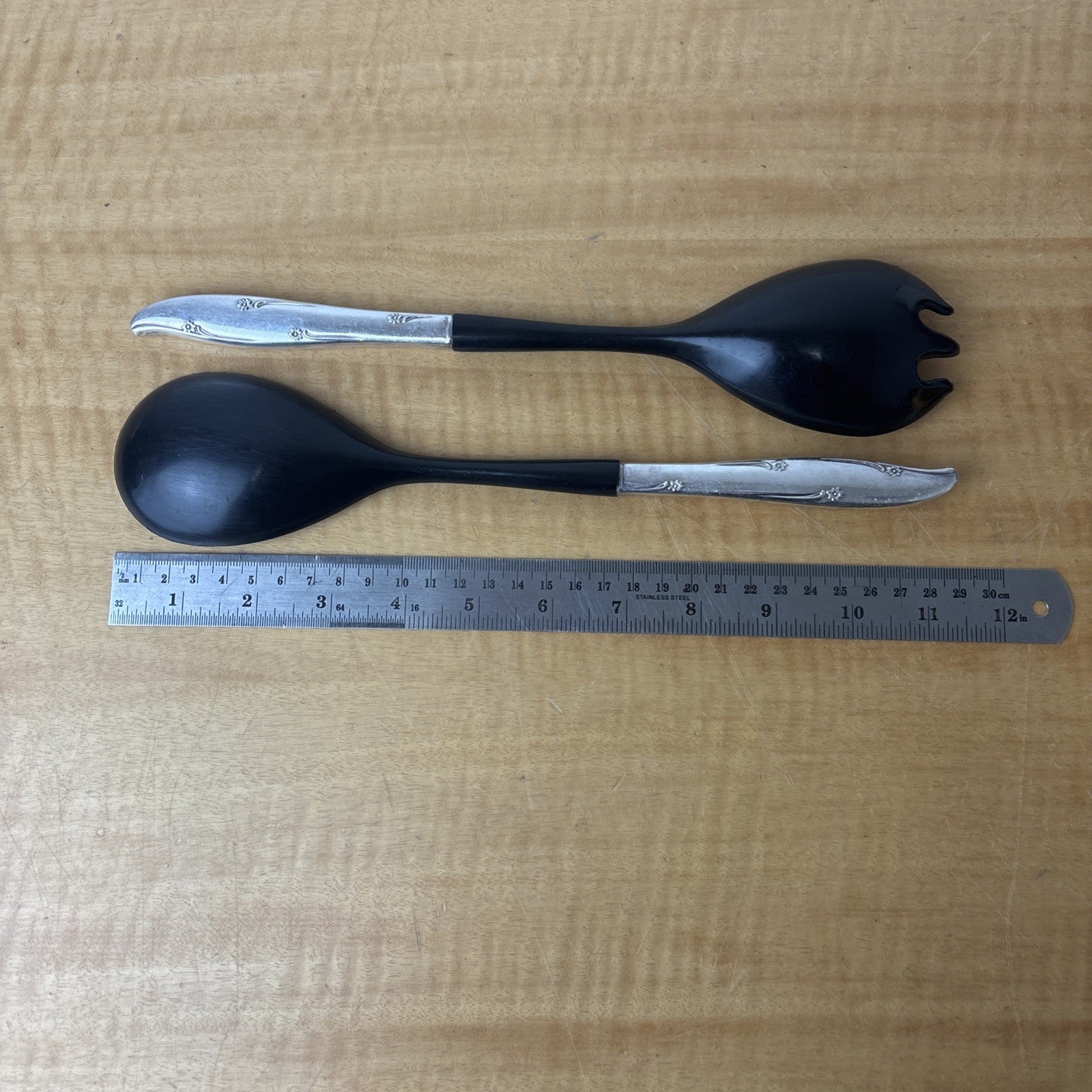 Reverie 1937 Silverplate by Oneida Salad Serving Set Black Plastic & Silver Vtg