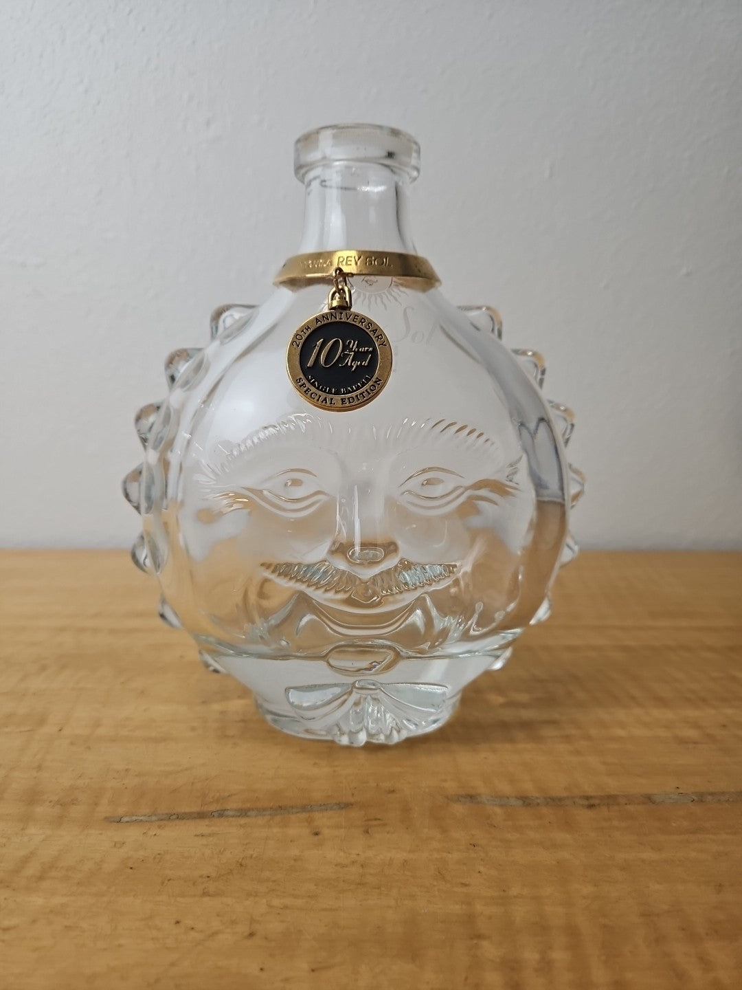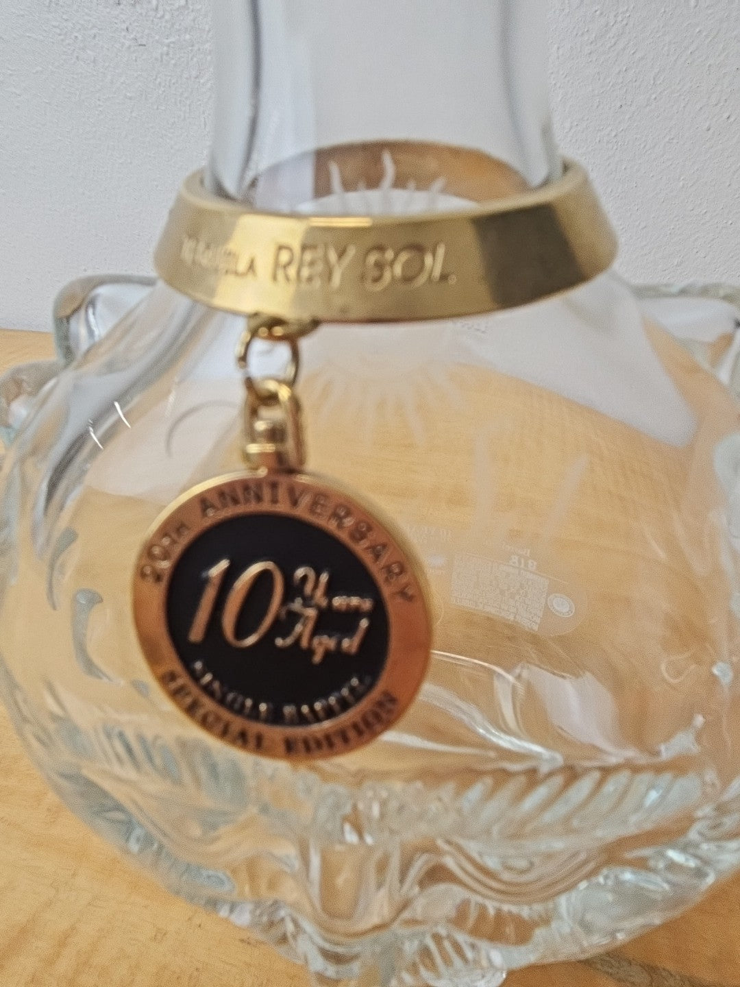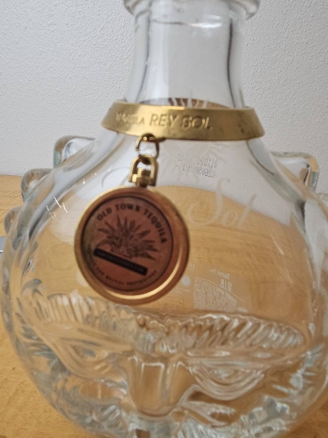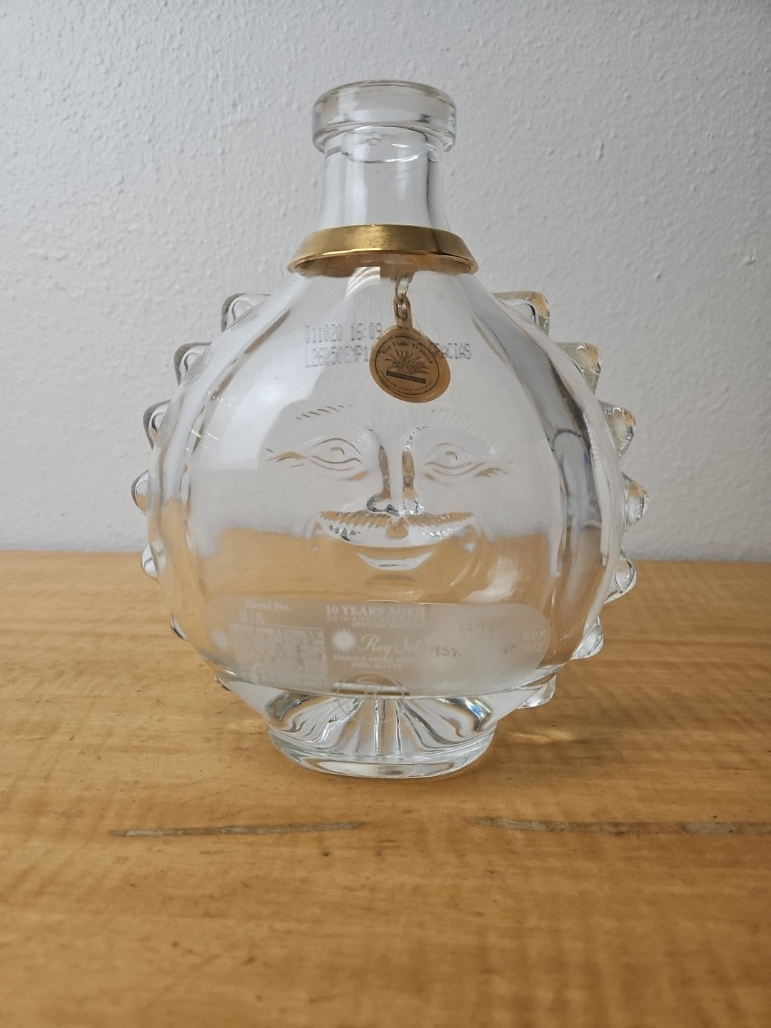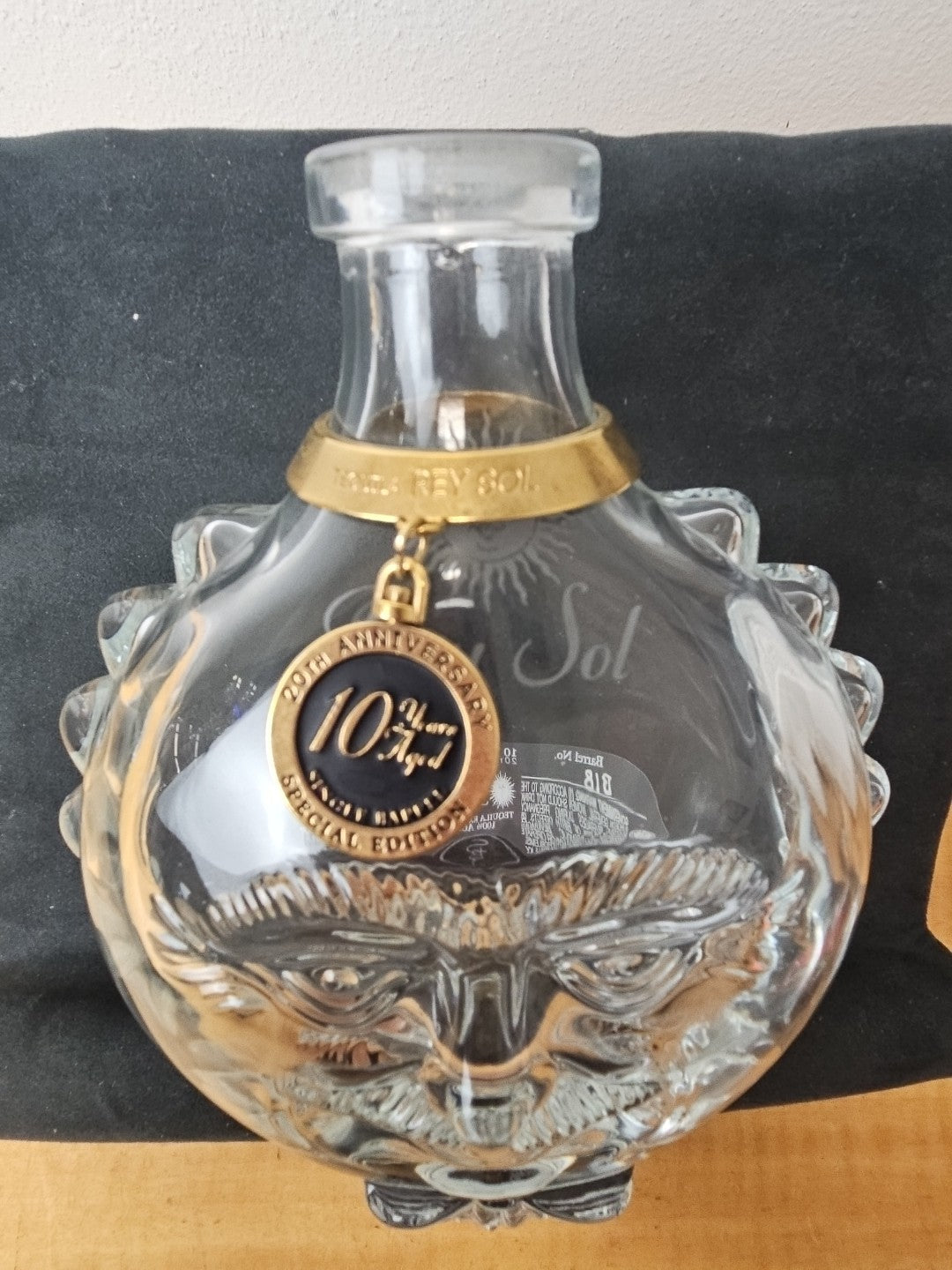 Rey Sol Tequila 20th Anniversary Special Ed Glass Bottle label, medallion