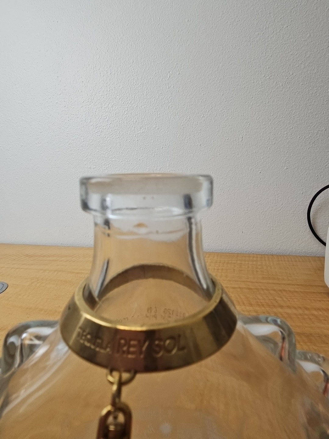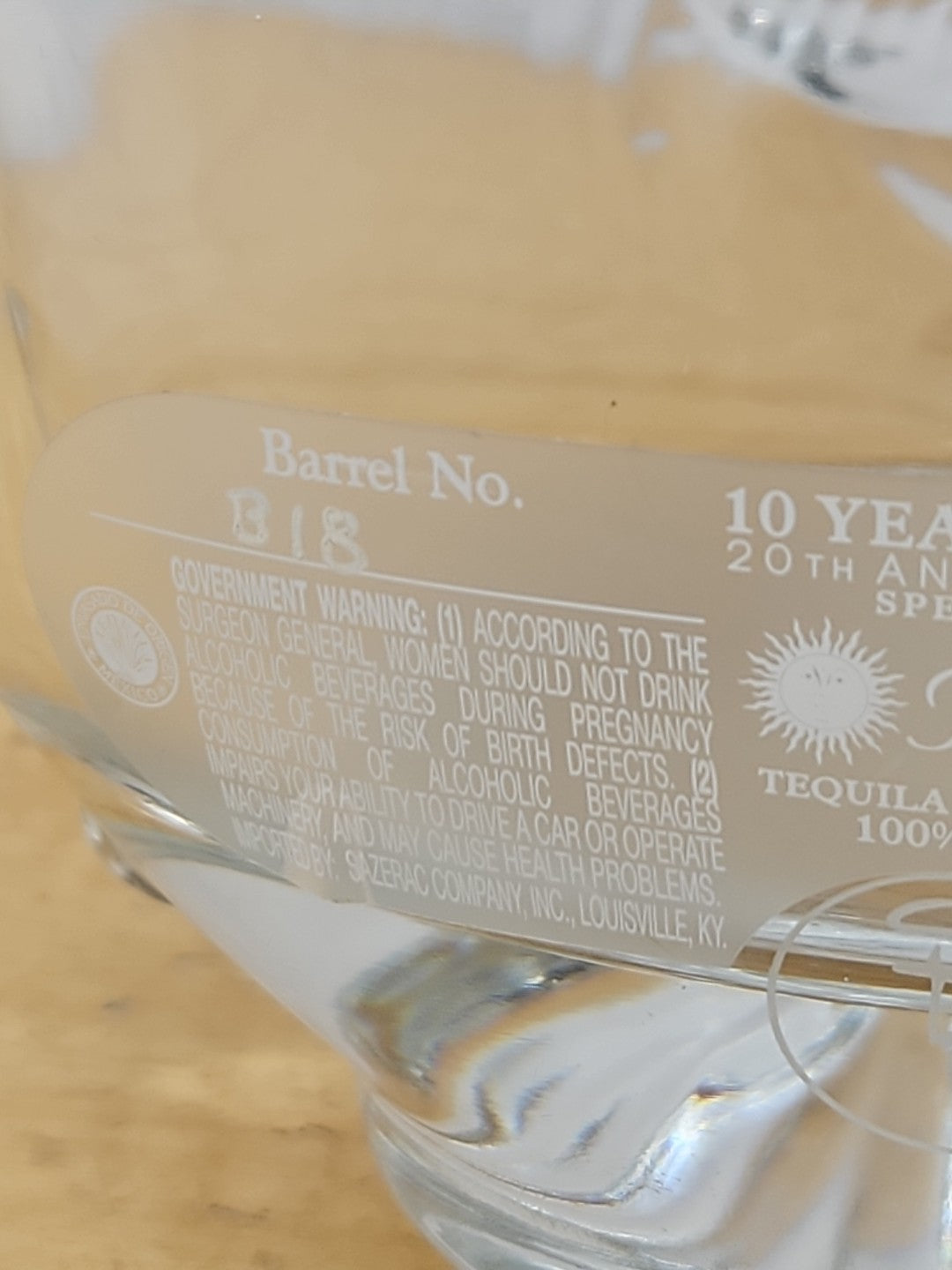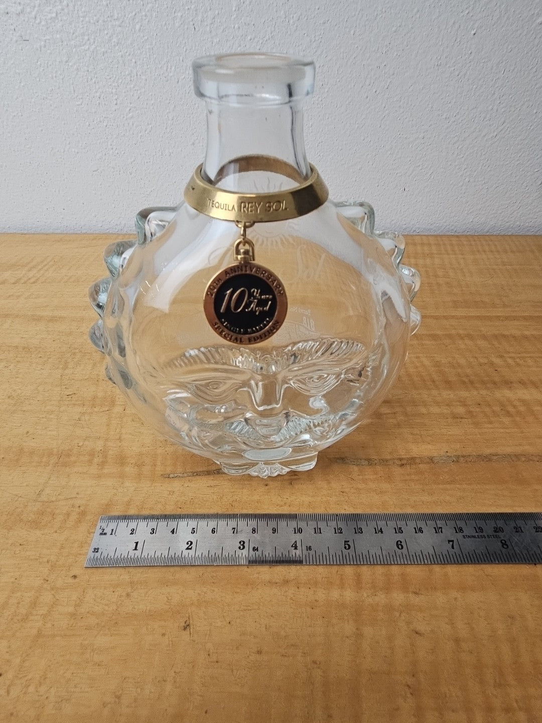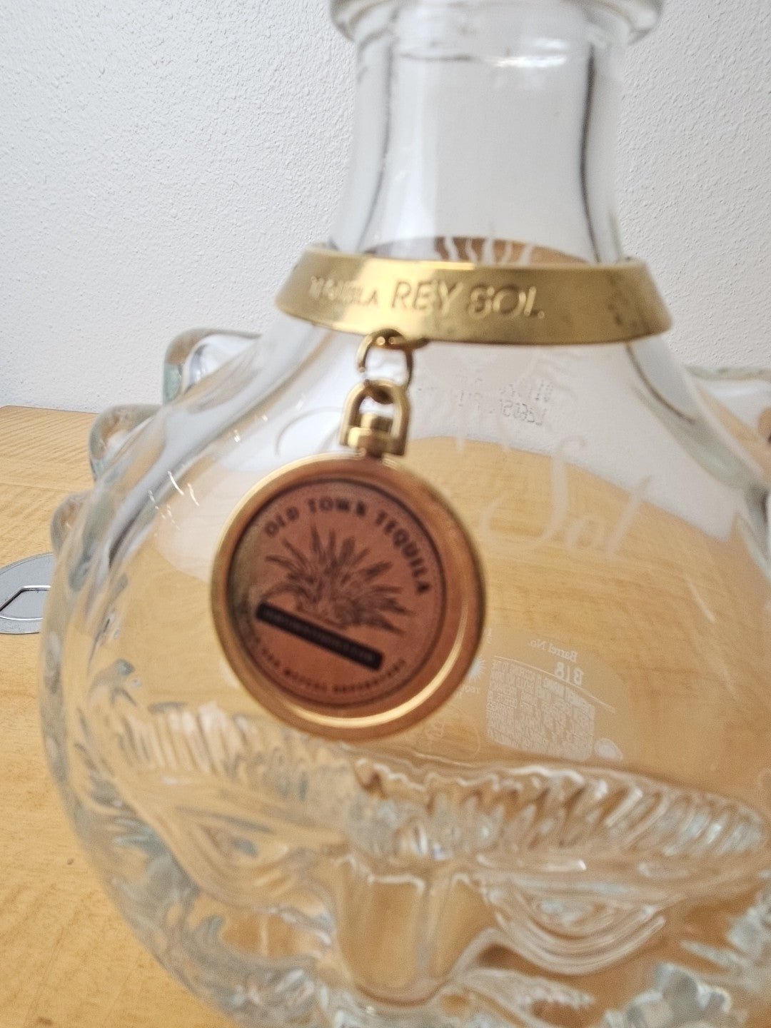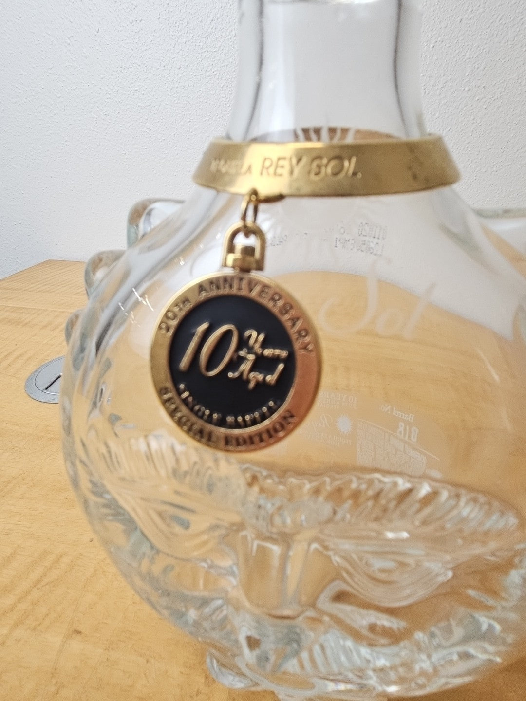 Rey Sol Tequila 20th Anniversary Special Ed Glass Bottle label, medallion