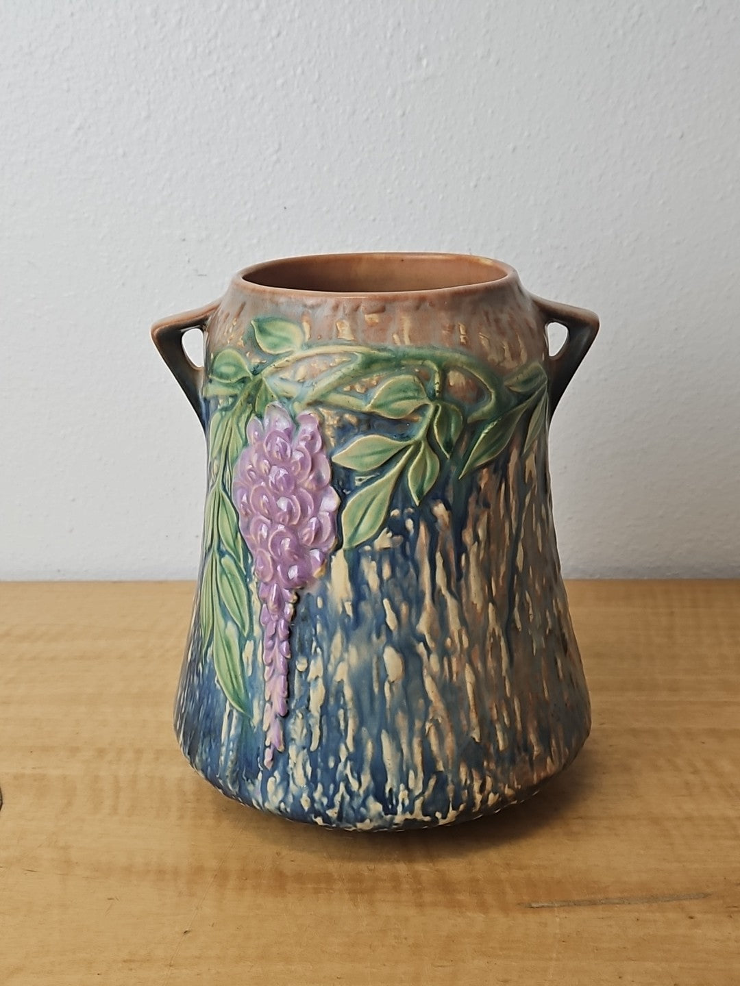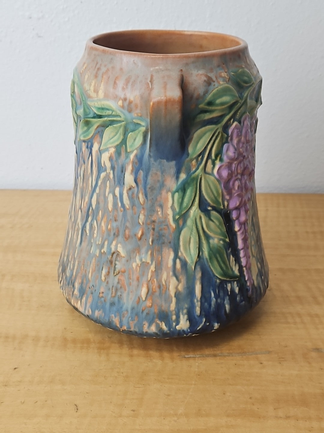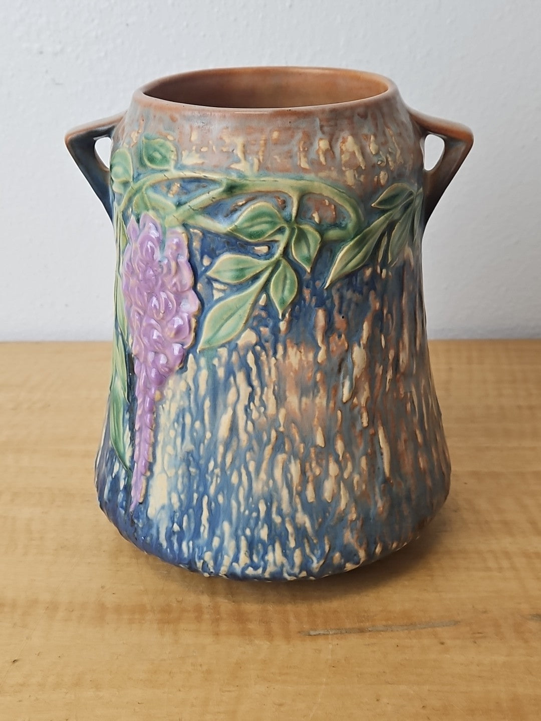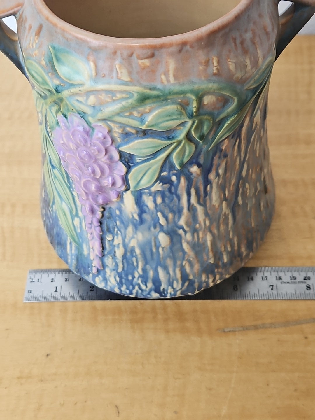 Roseville Pottery Blue Wisteria Vase, 2 handles, 8 1/8" brown, blue, grapes