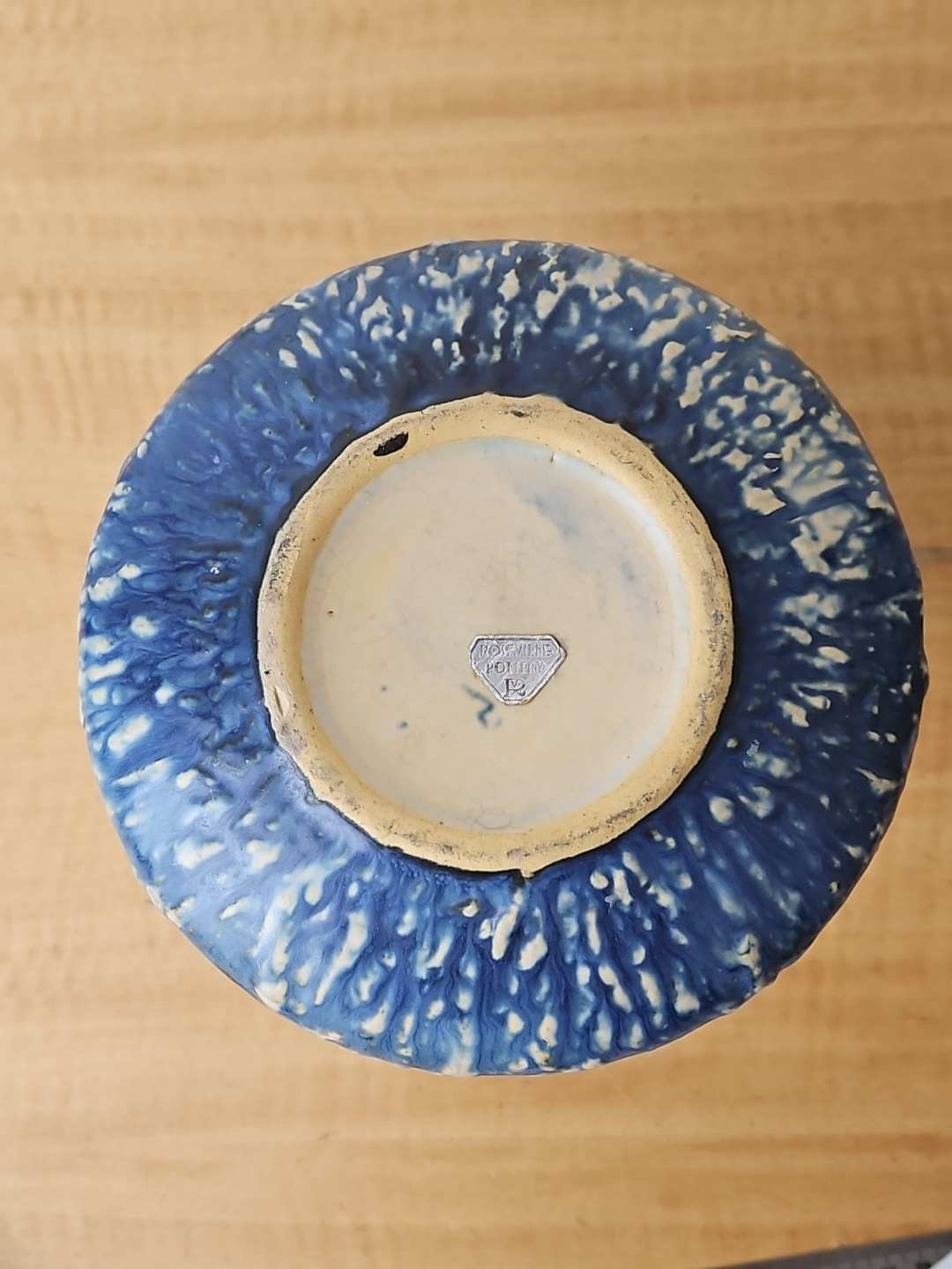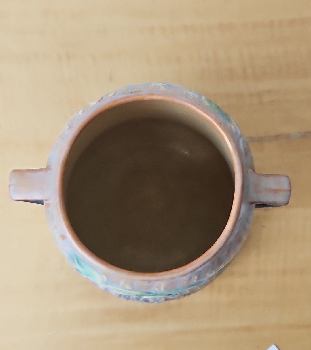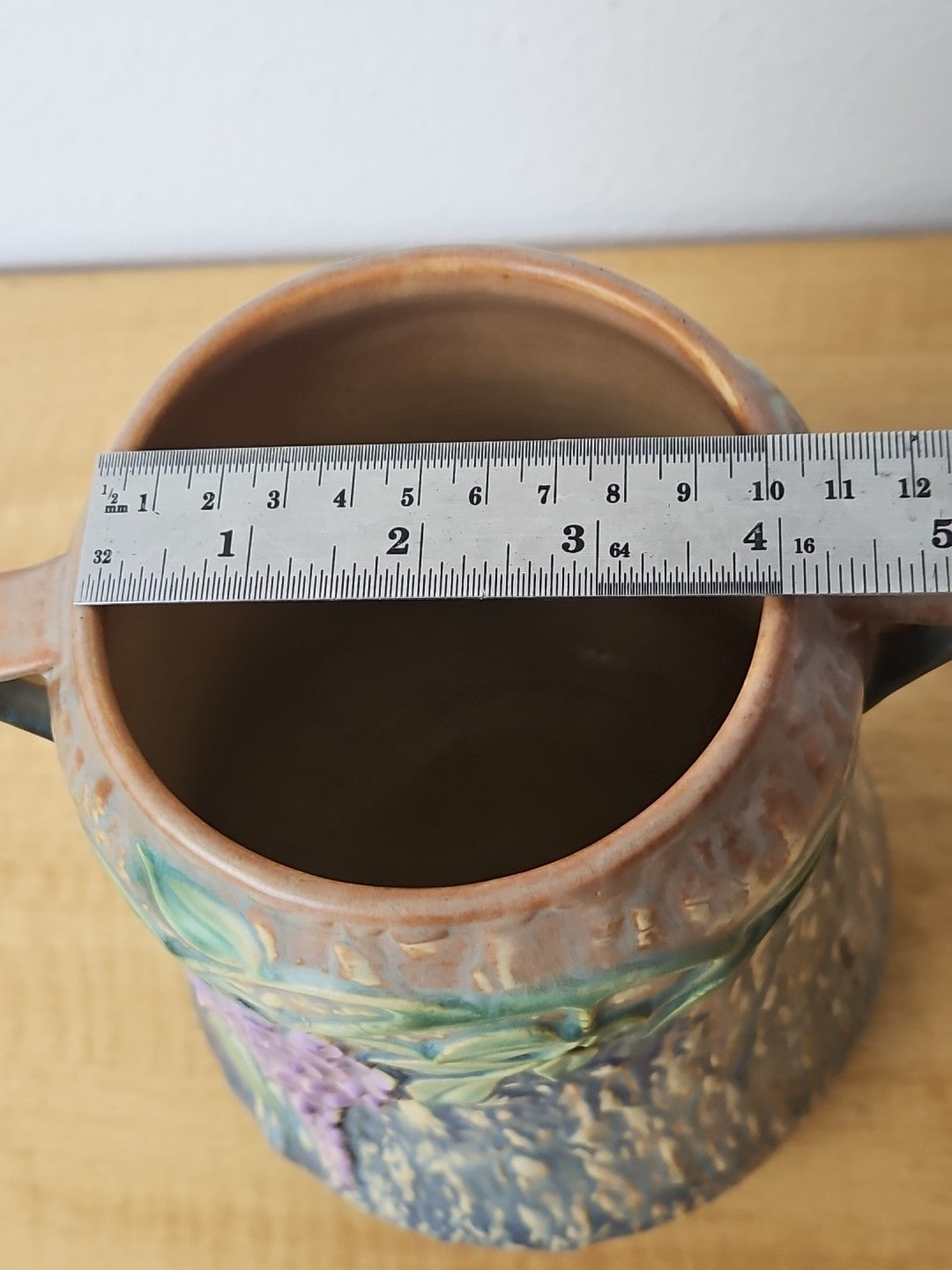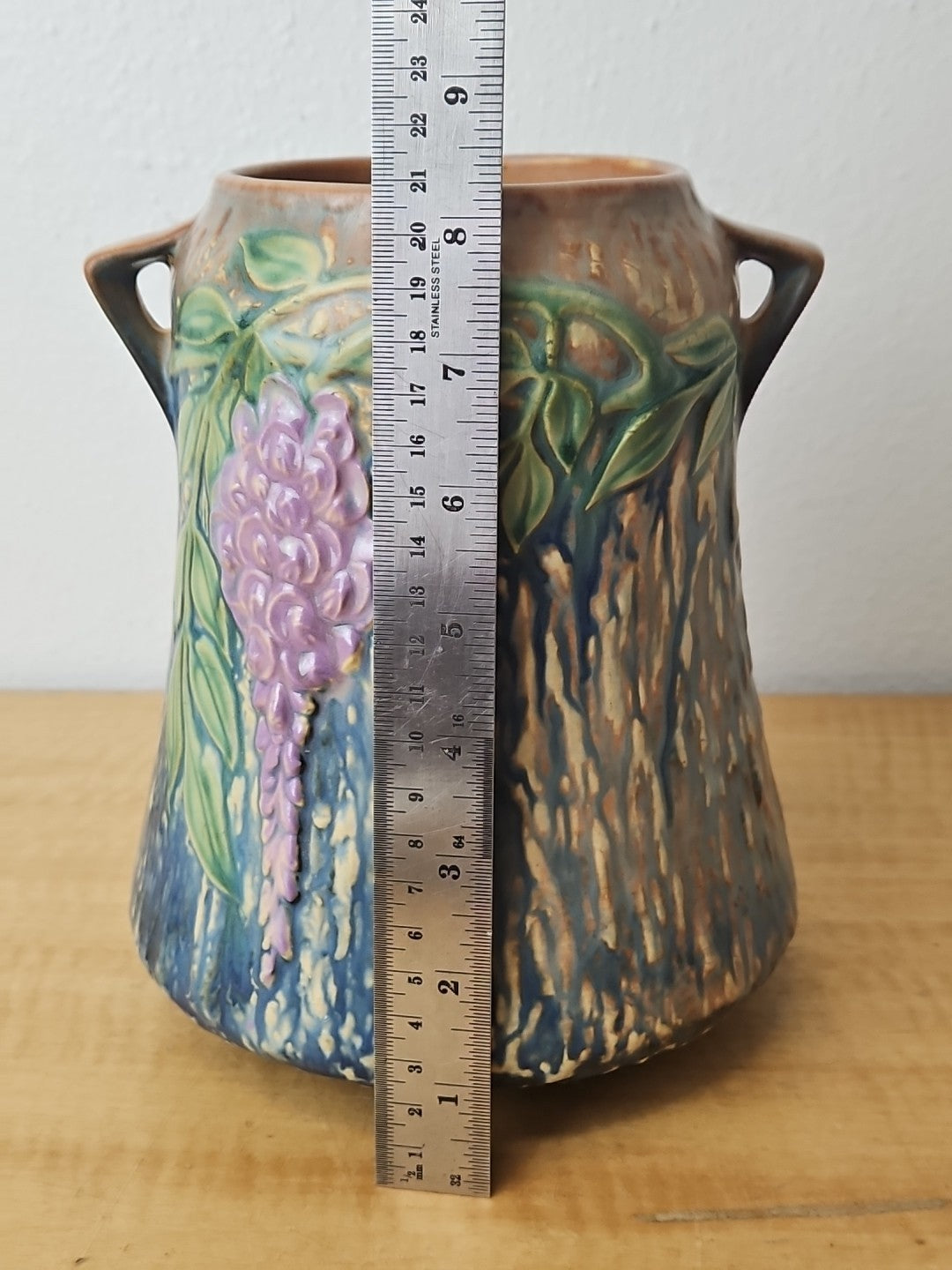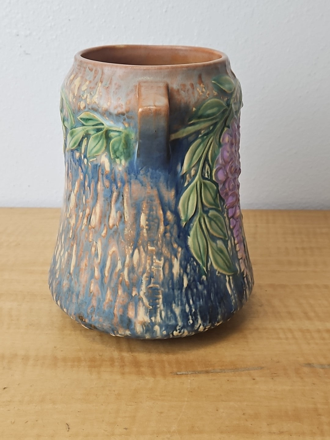 Roseville Pottery Blue Wisteria Vase, 2 handles, 8 1/8" brown, blue, grapes