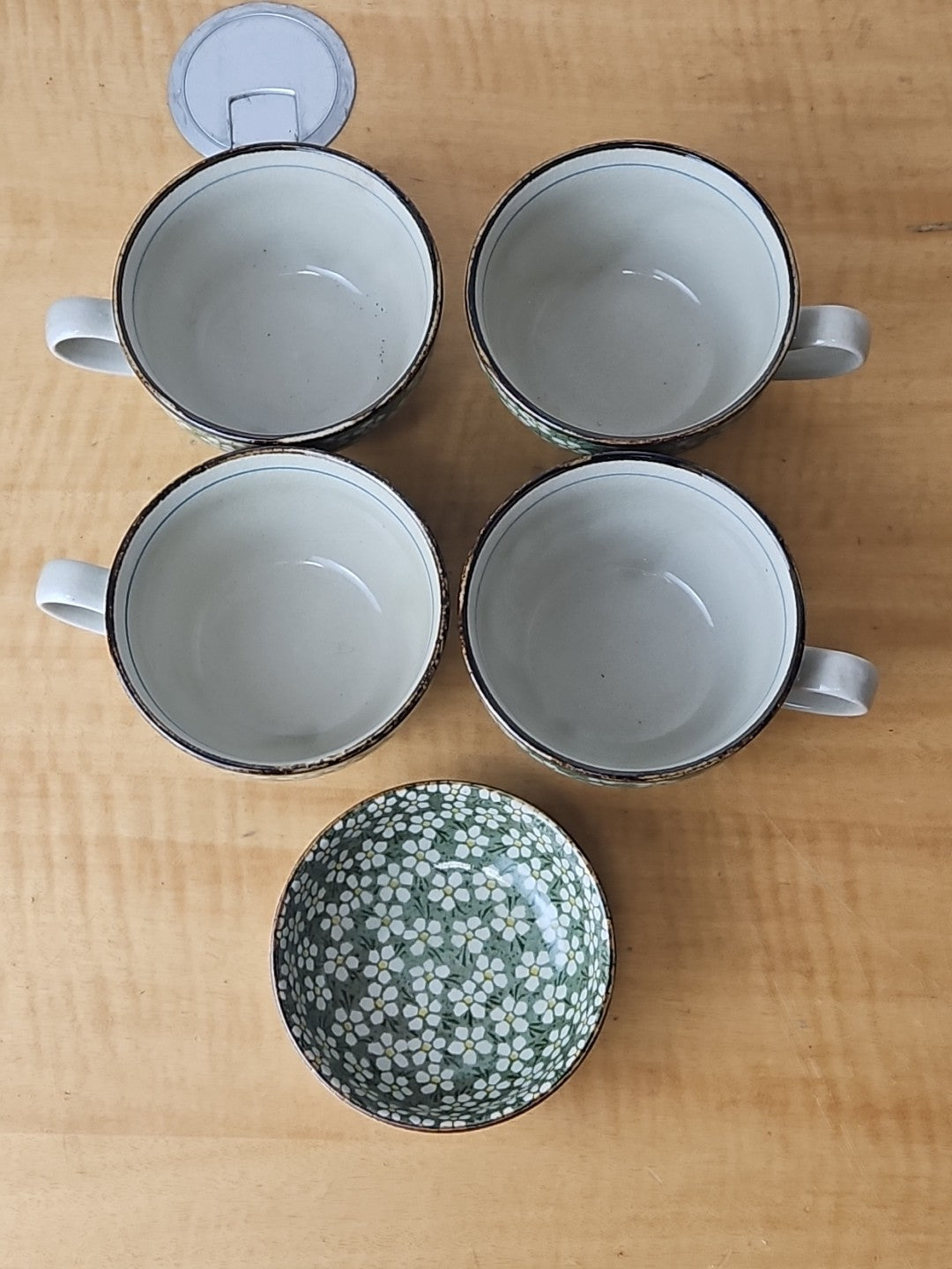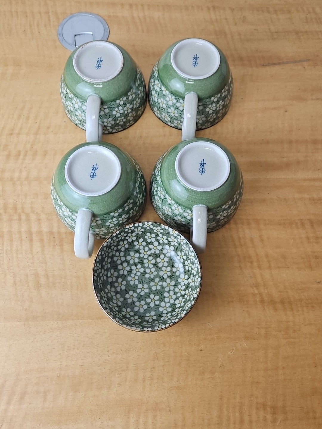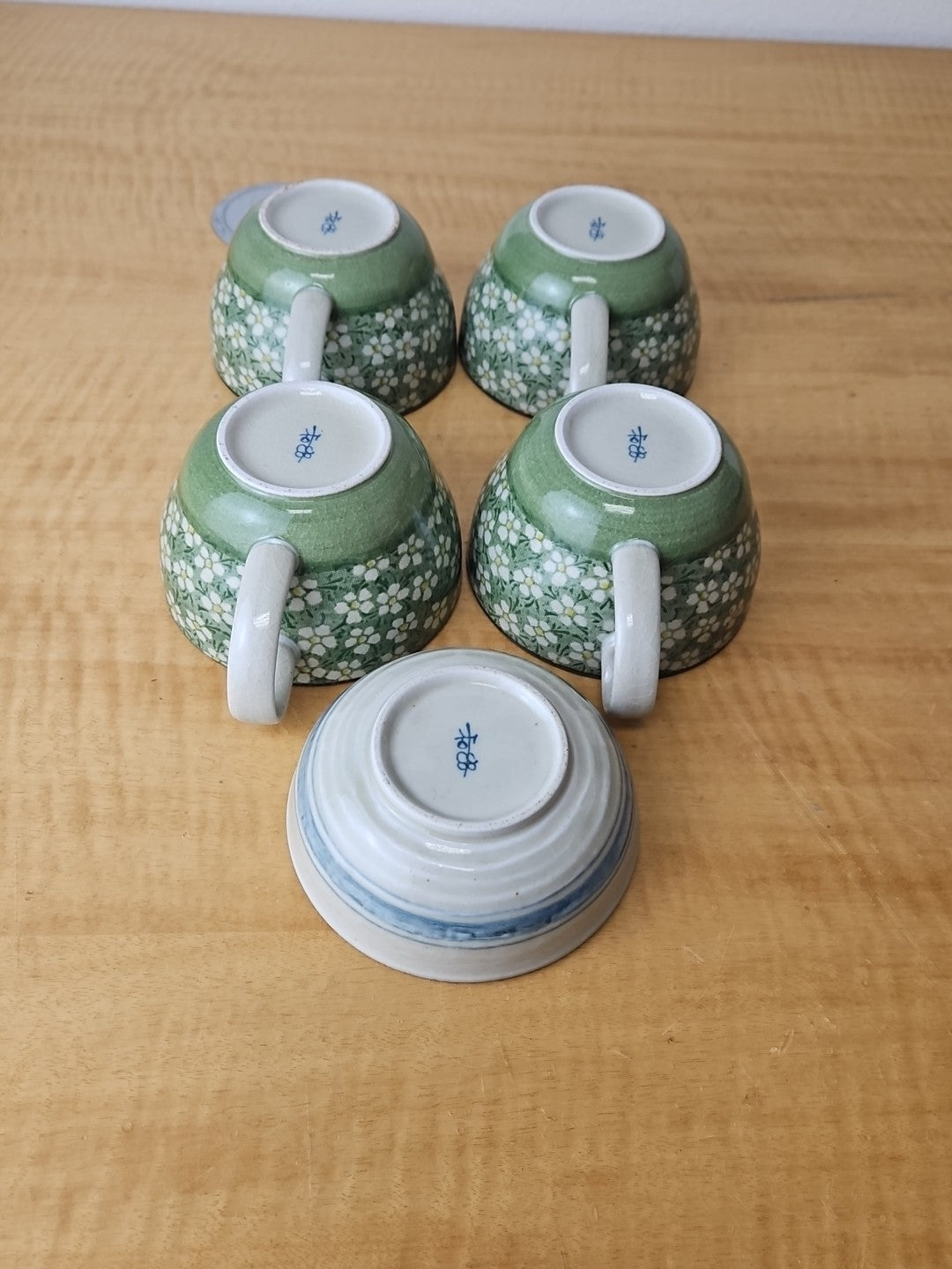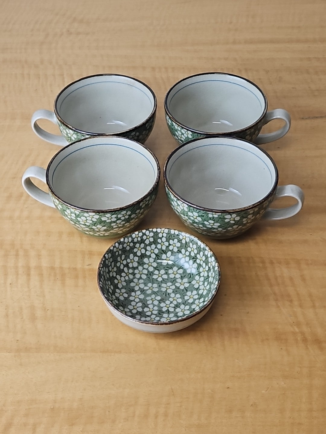 Sakura Japanese Cherry Blossom Tea Cups SET Of 4 with bowl, green, brown rim