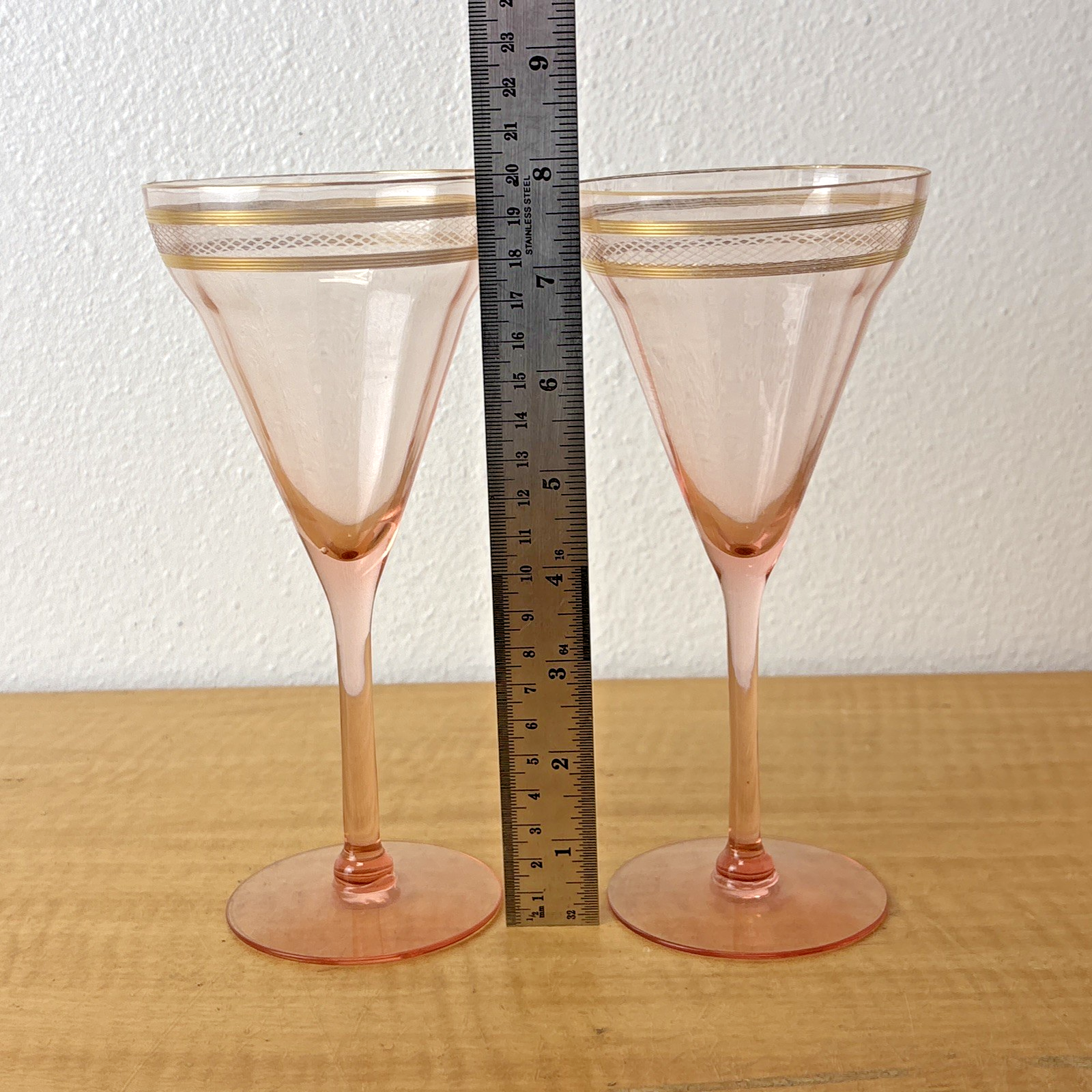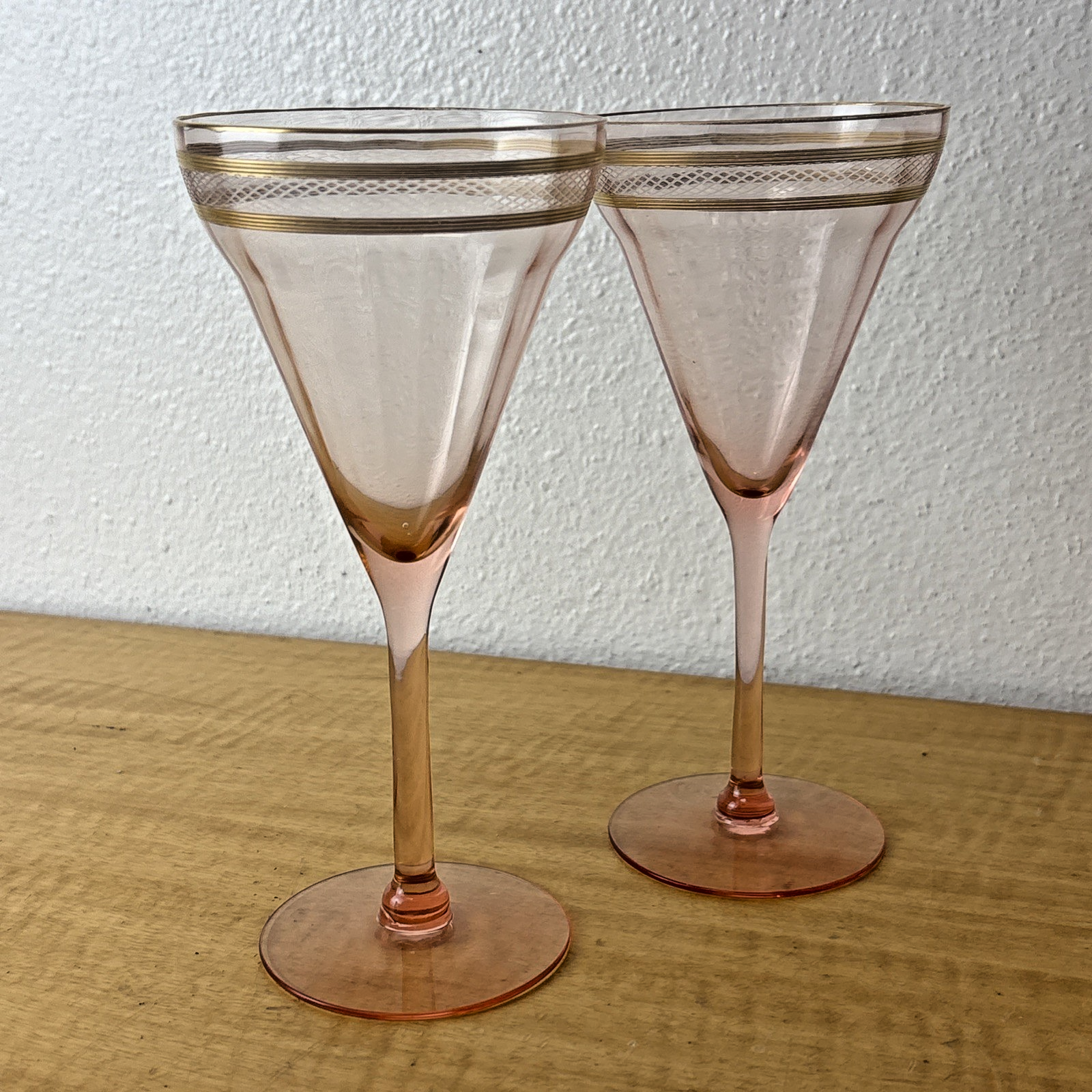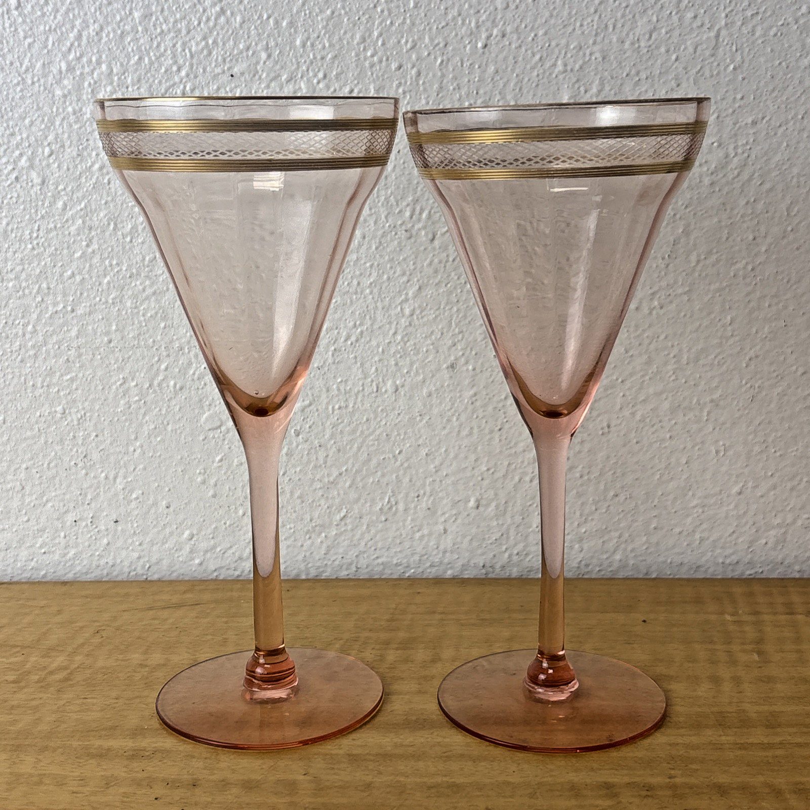 Set of 2 Pink Depression Glass Gold Trim & Etched Glasses