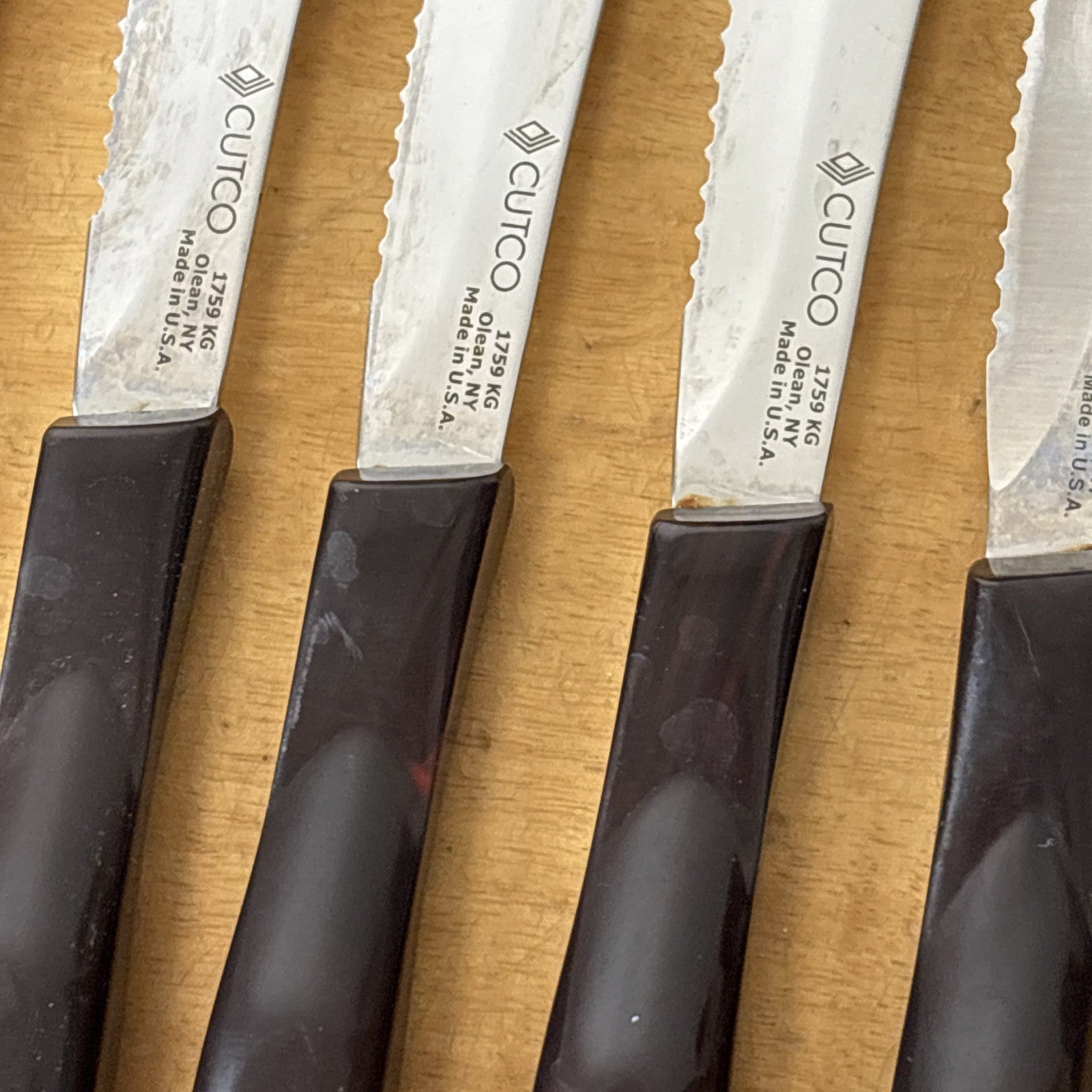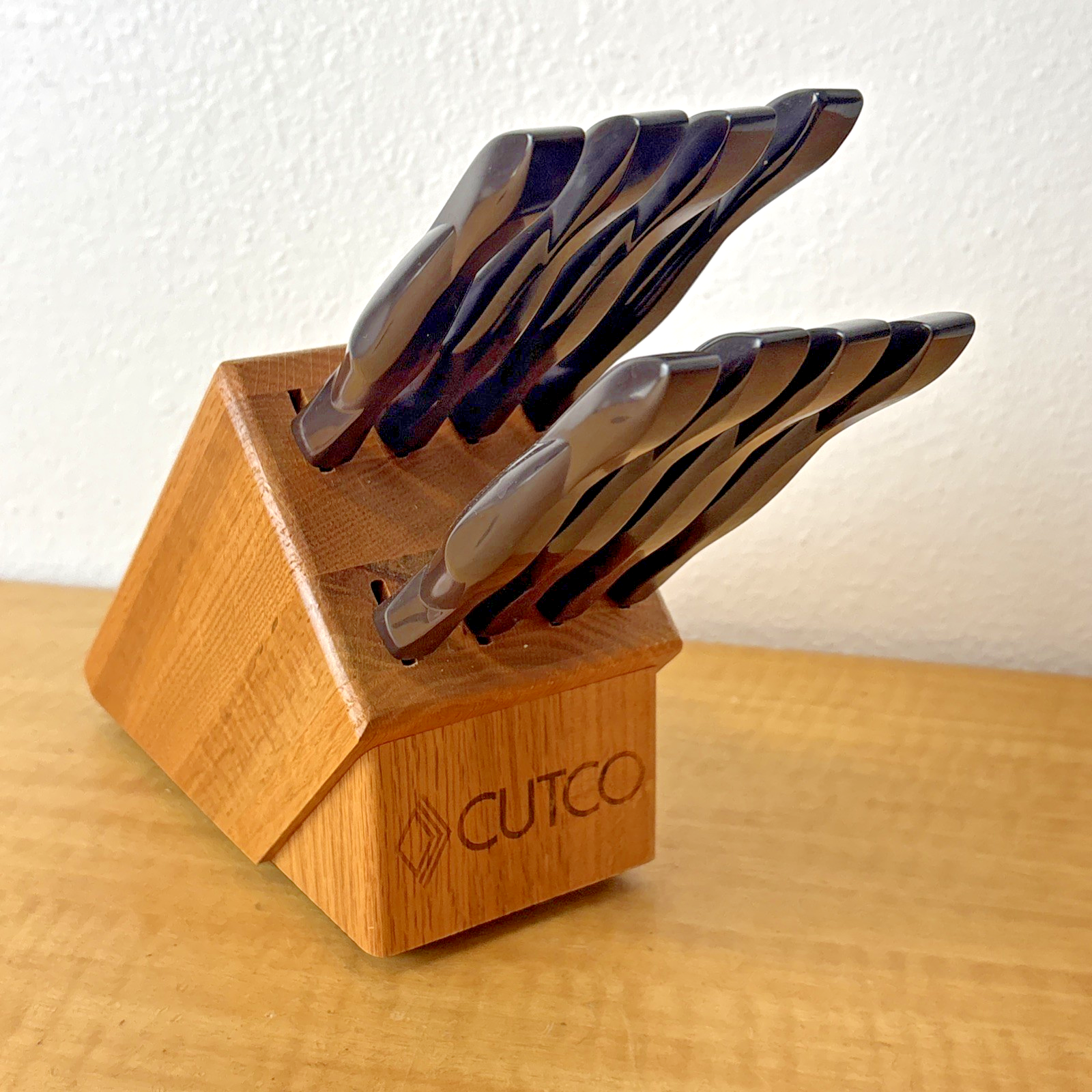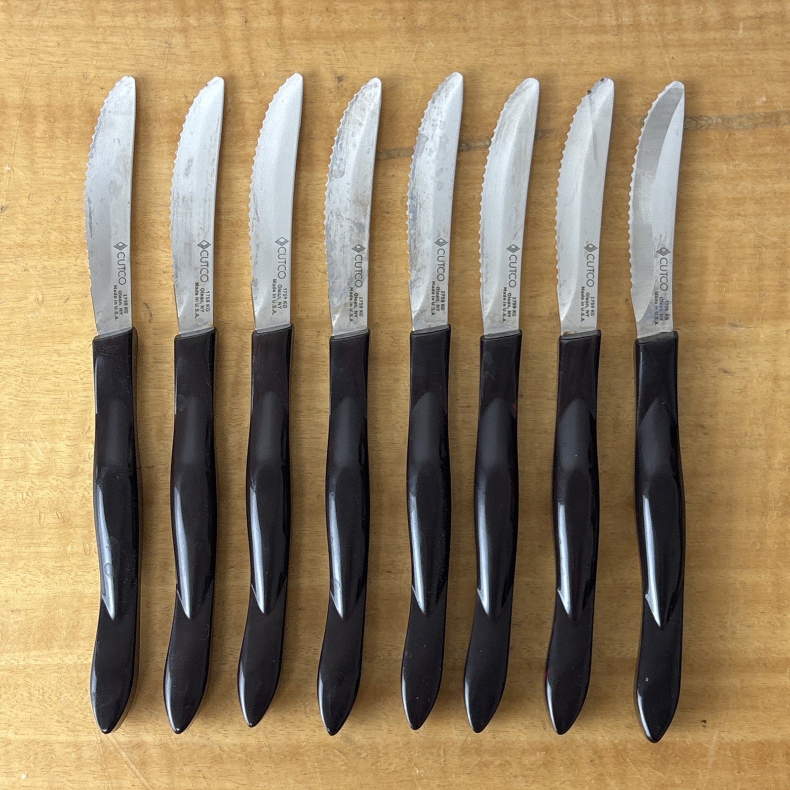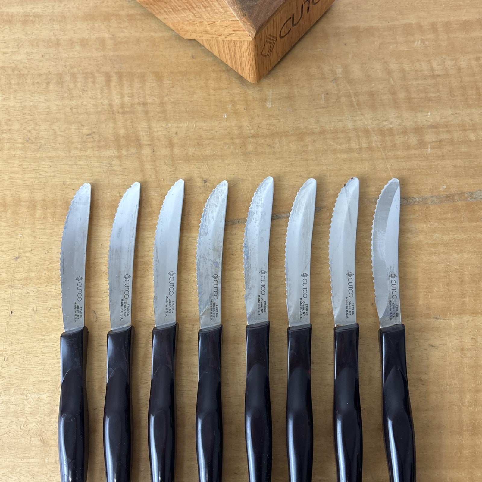 Set of 8 Eight Cutco 1759 KG Serrated Brown Handle Knives w/ Wooden Knife Block