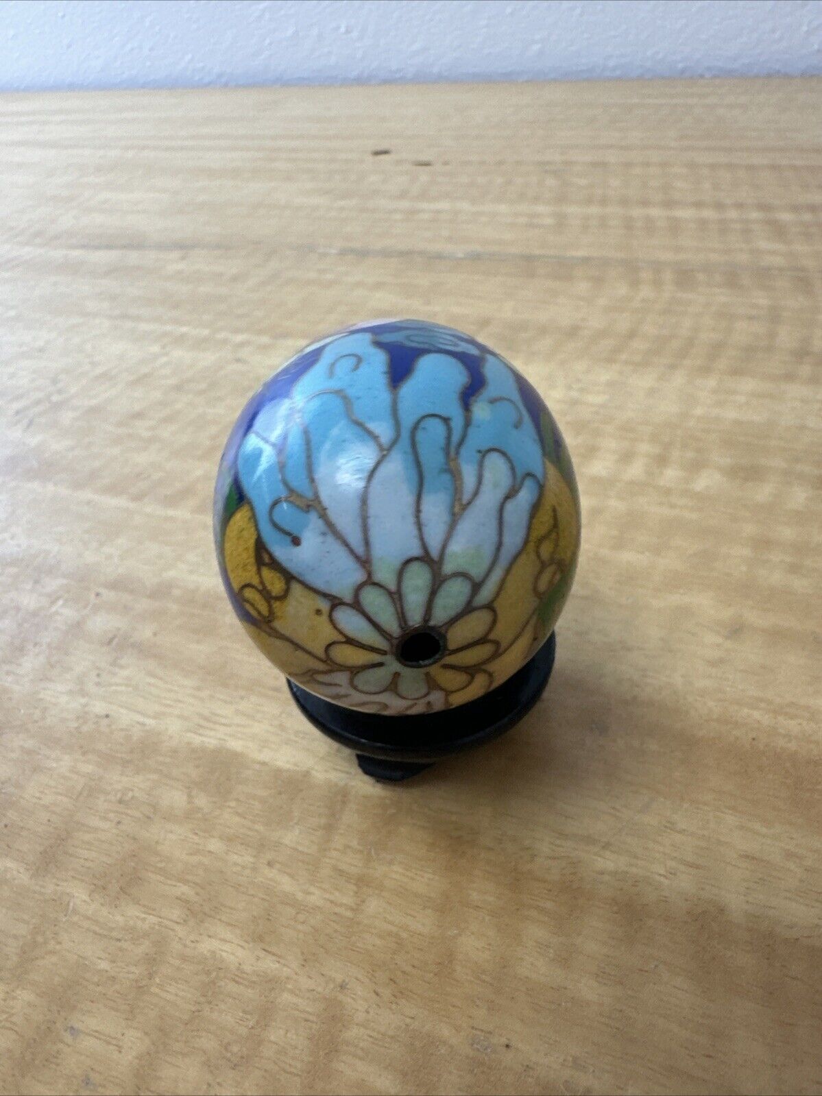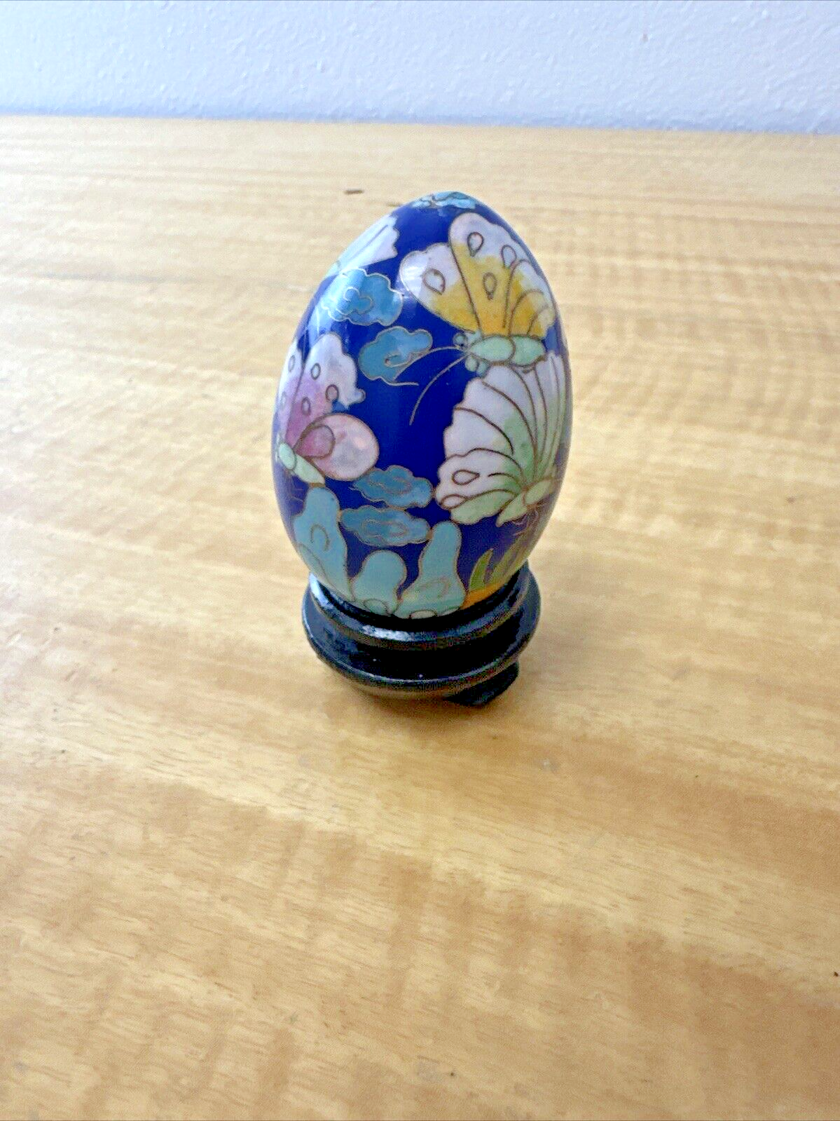 Small Cloisonne Enamel Egg with Wooden Stand, 3”Tall, Butterfly Pattern