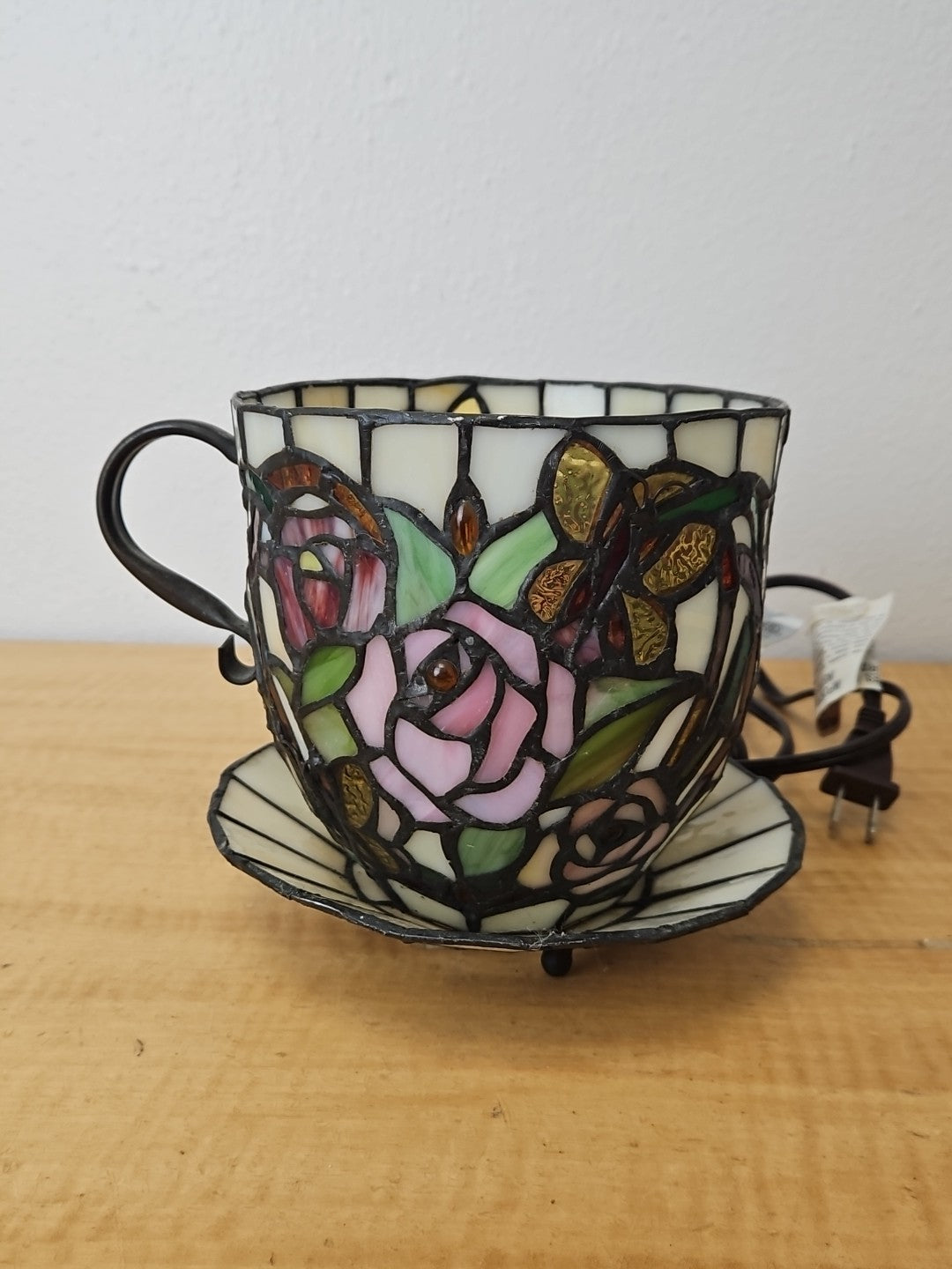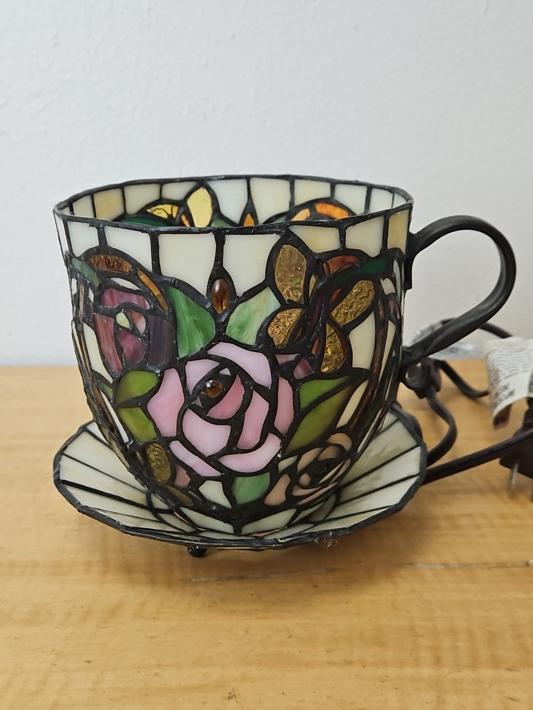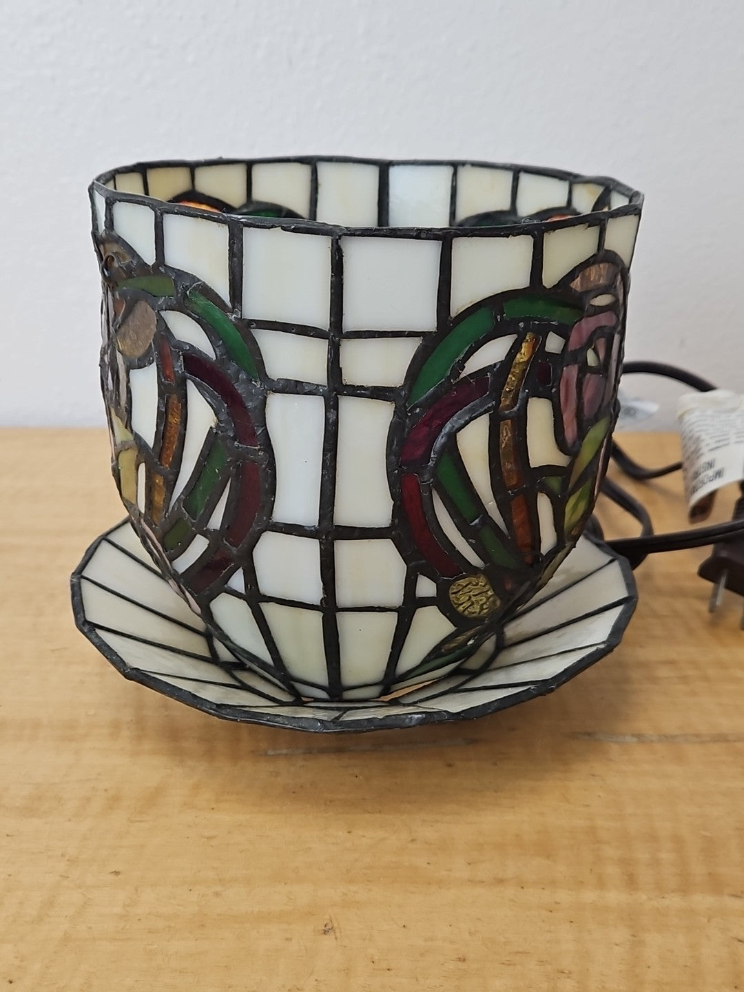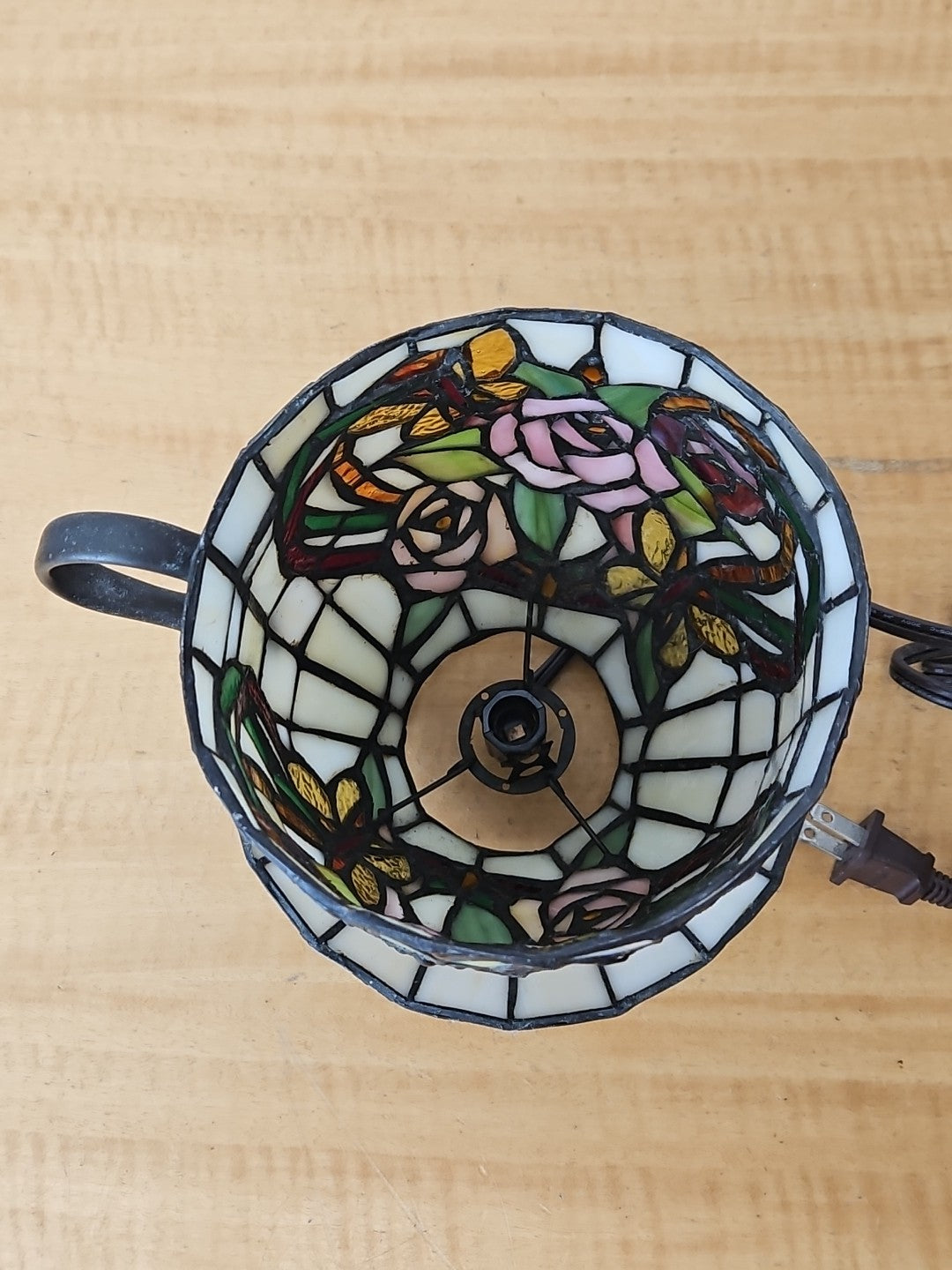 Stained Glass Tiffany Style Lamp TEA CUP 6 3/8" roses butterfly untested
