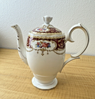 Queen Anne red and gold collectible tea set including matching teapot, cup and saucer, cream and sugar bowls.