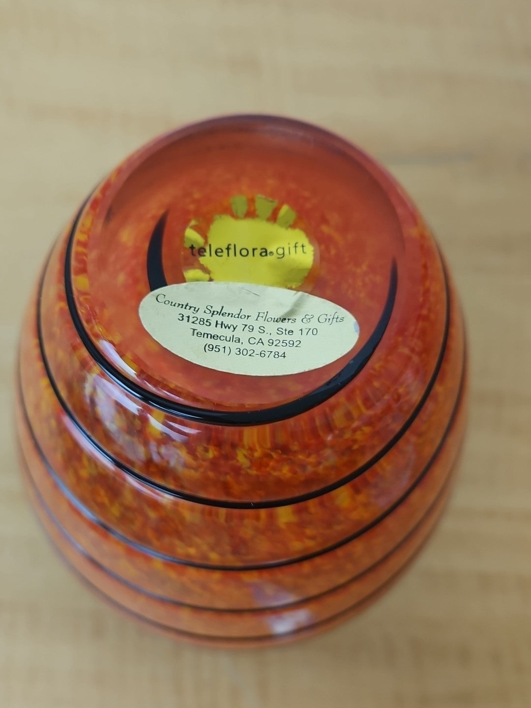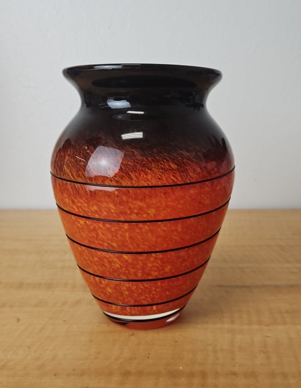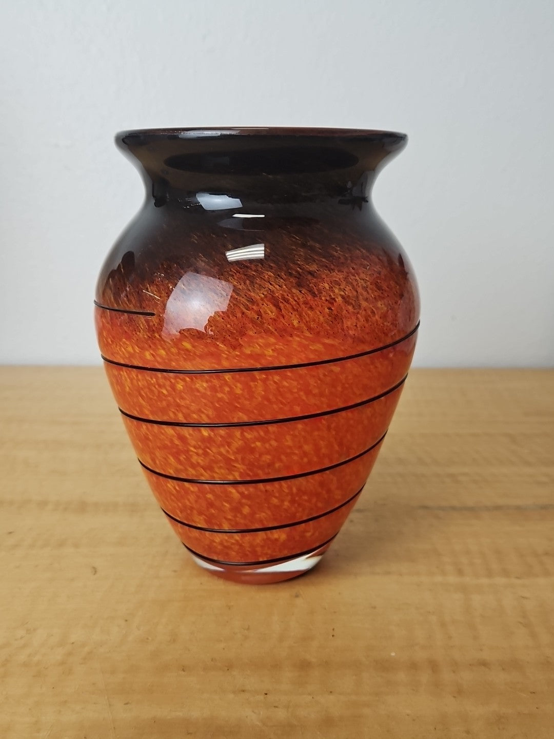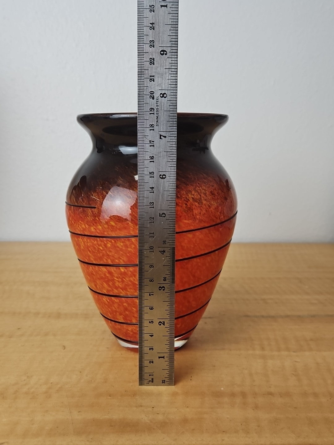 Teleflora Orange and Brown Ombre Hand Blown Glass Vase 7 3/8" speckled with rope