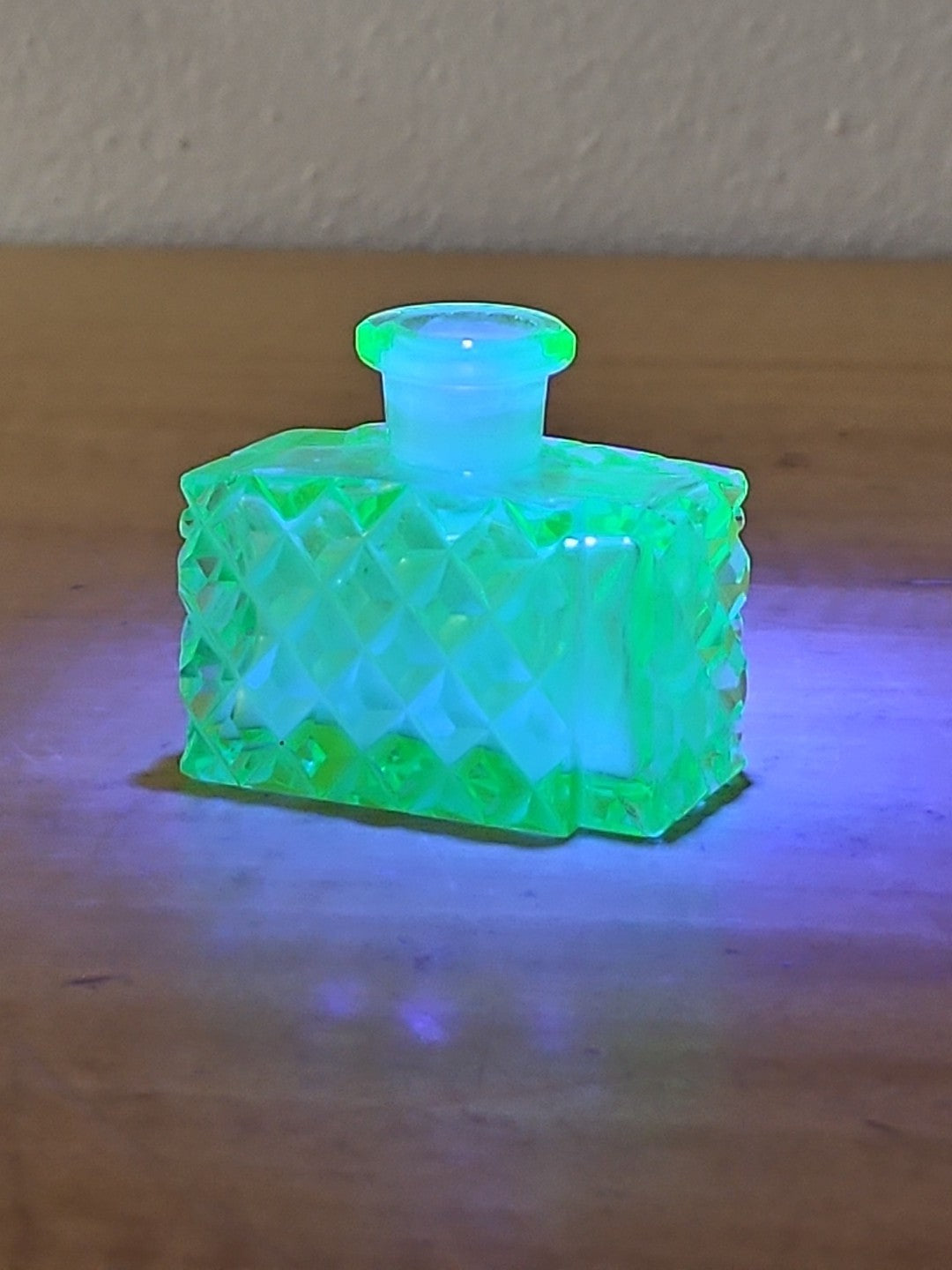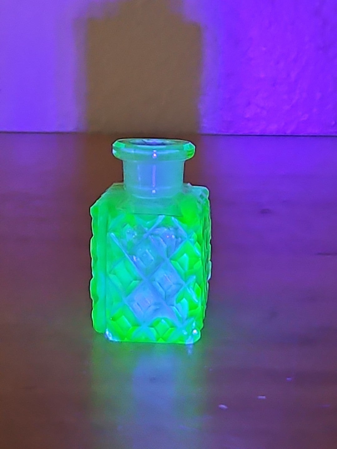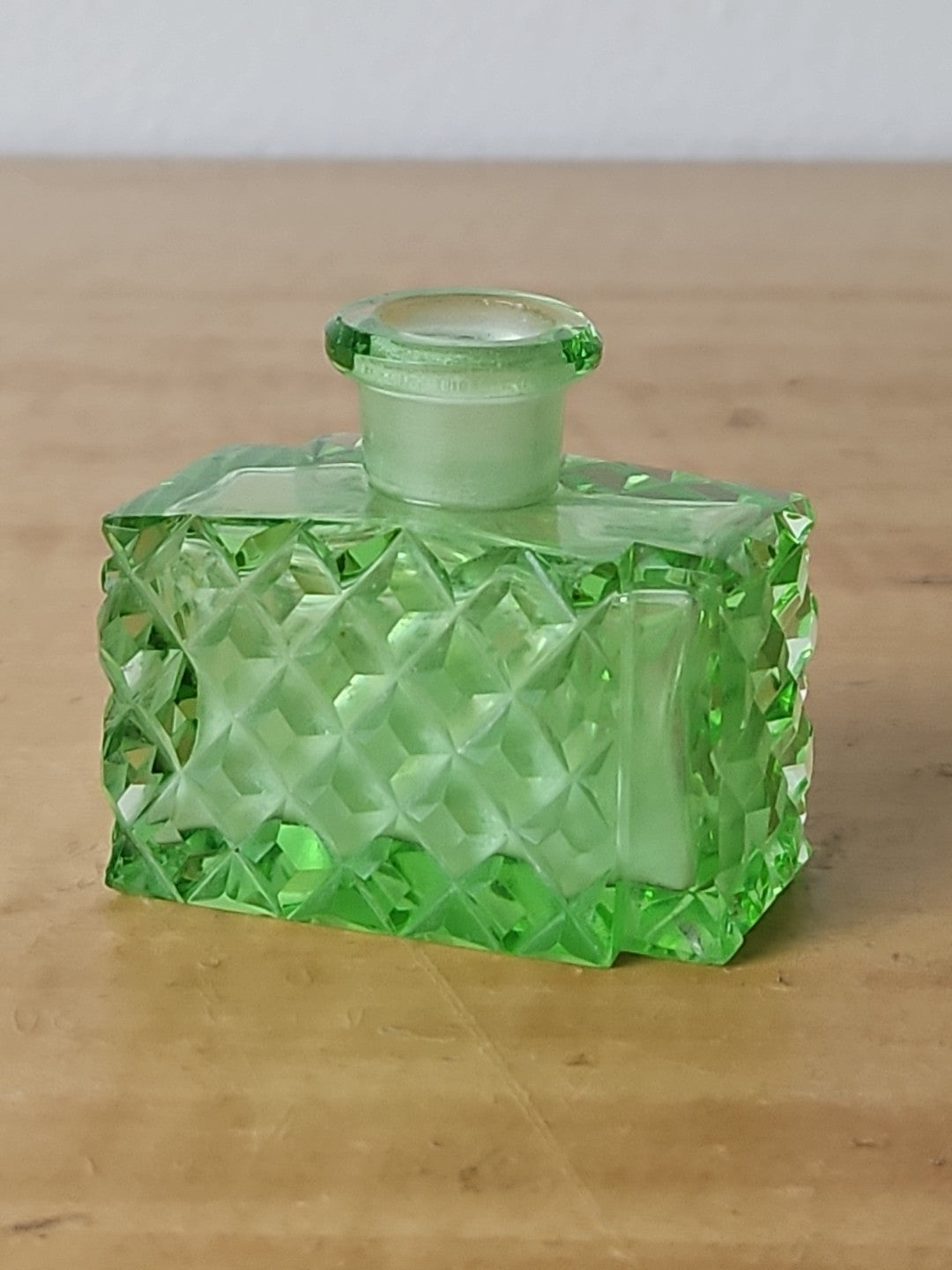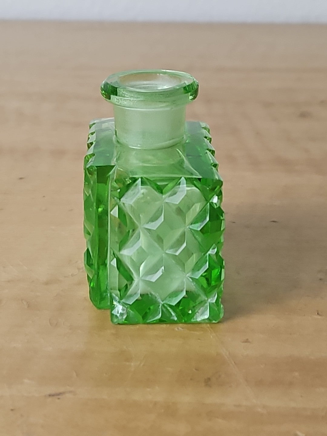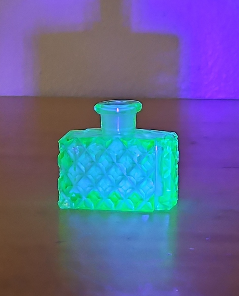 Uranium Vaseline Glass Perfume Bottle Green, Diamond Cut Art Deco 1930's