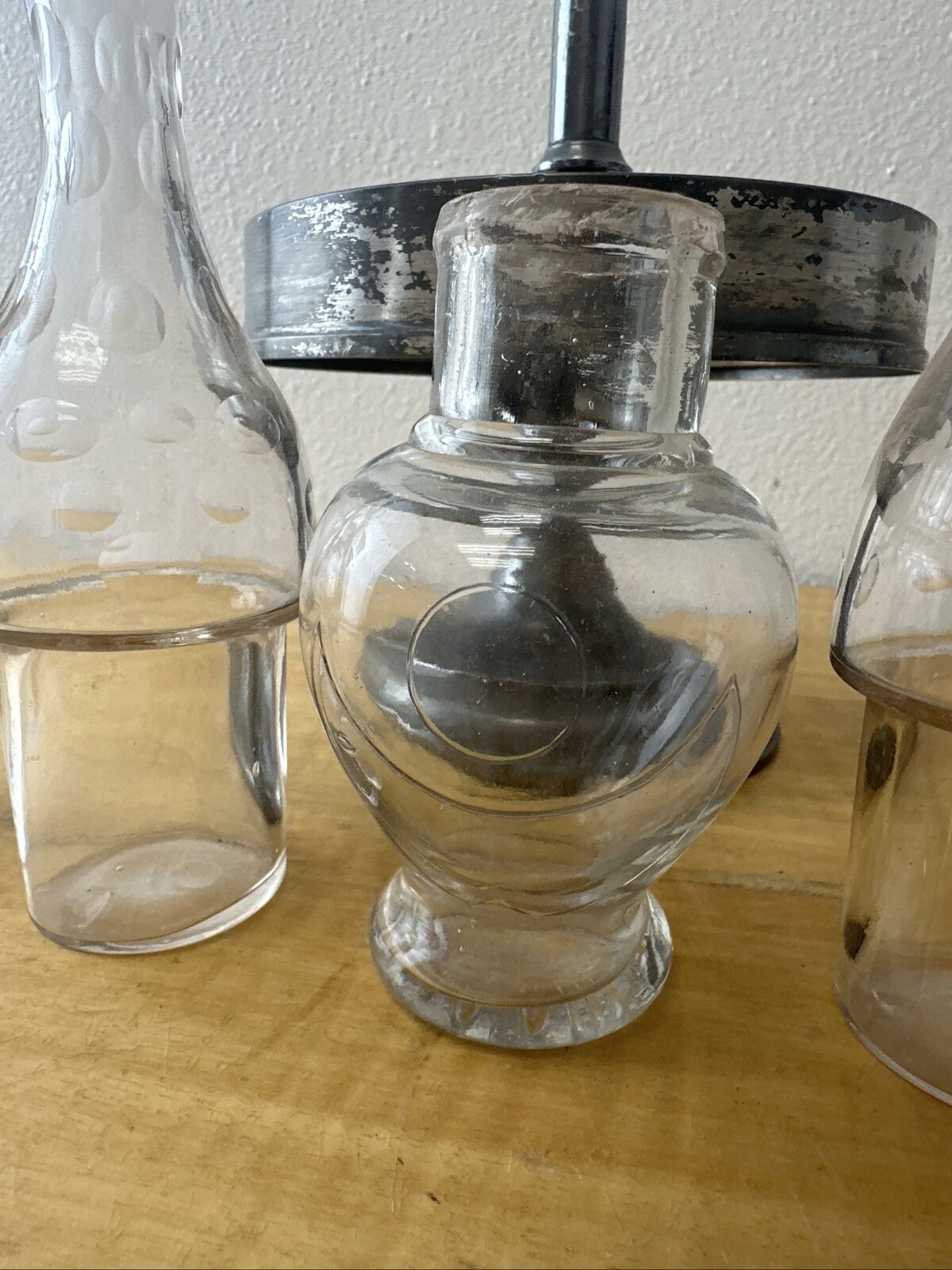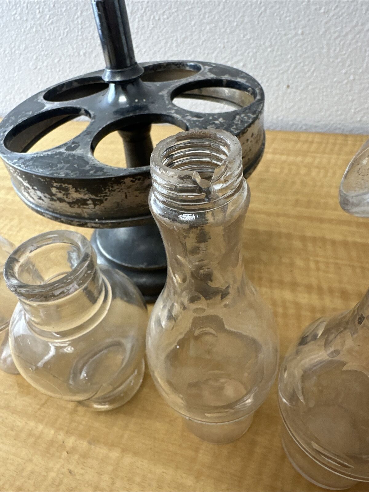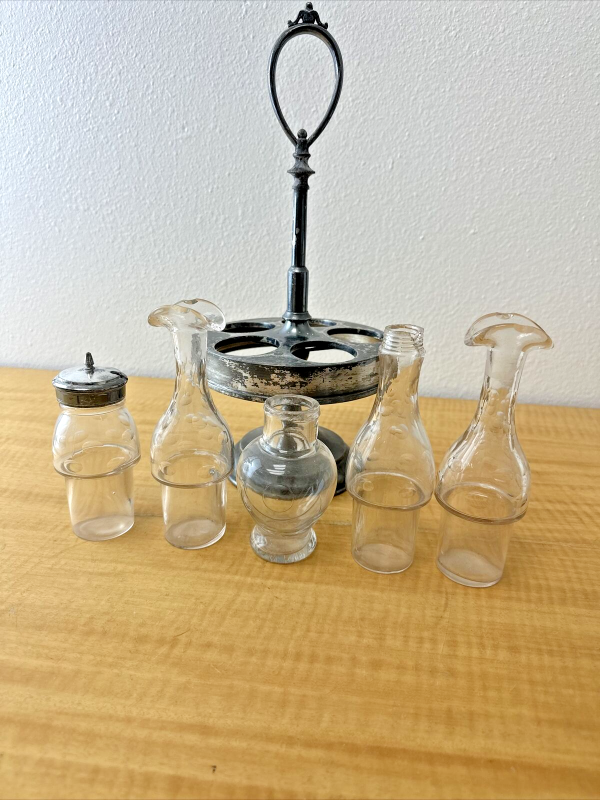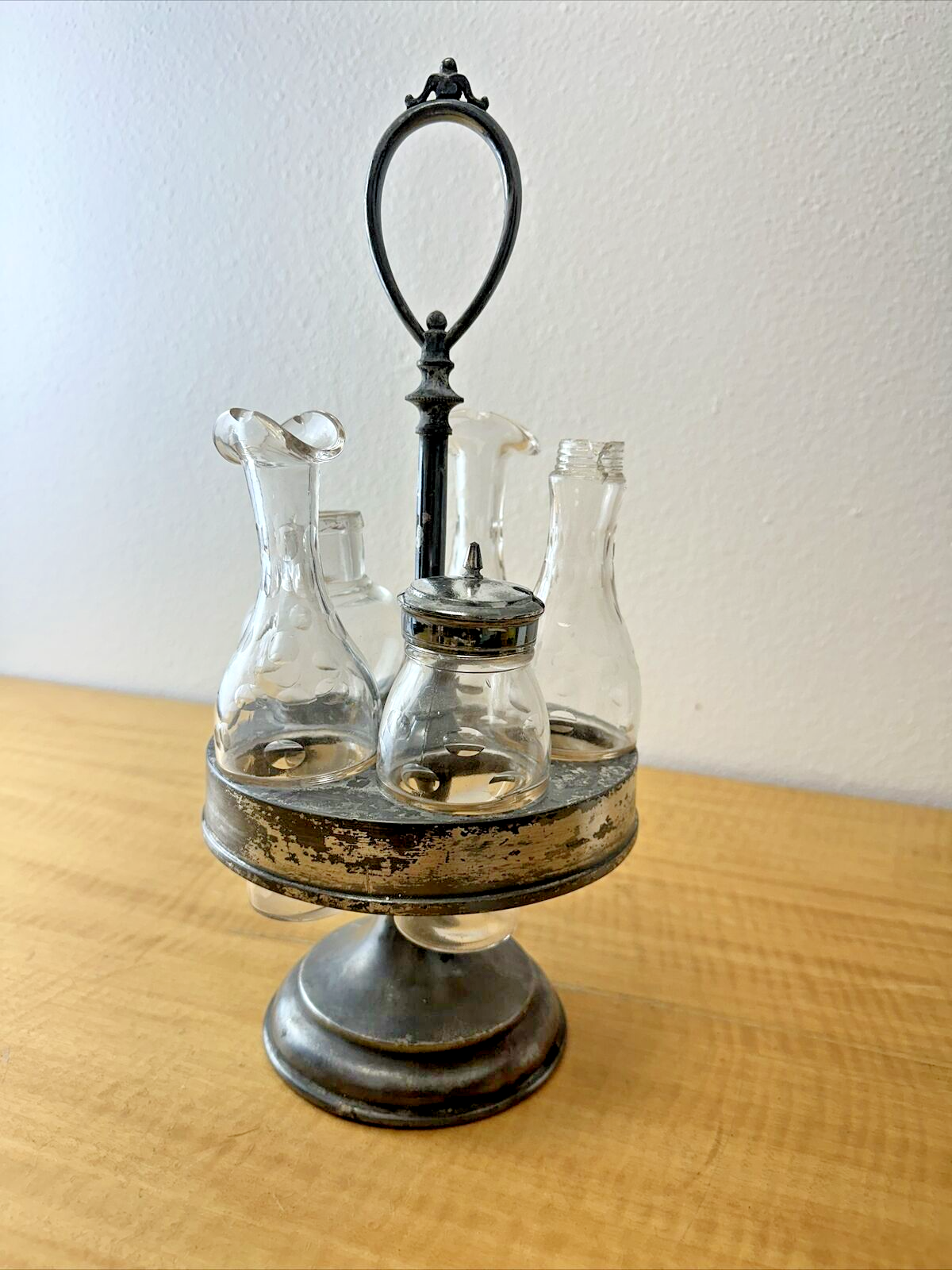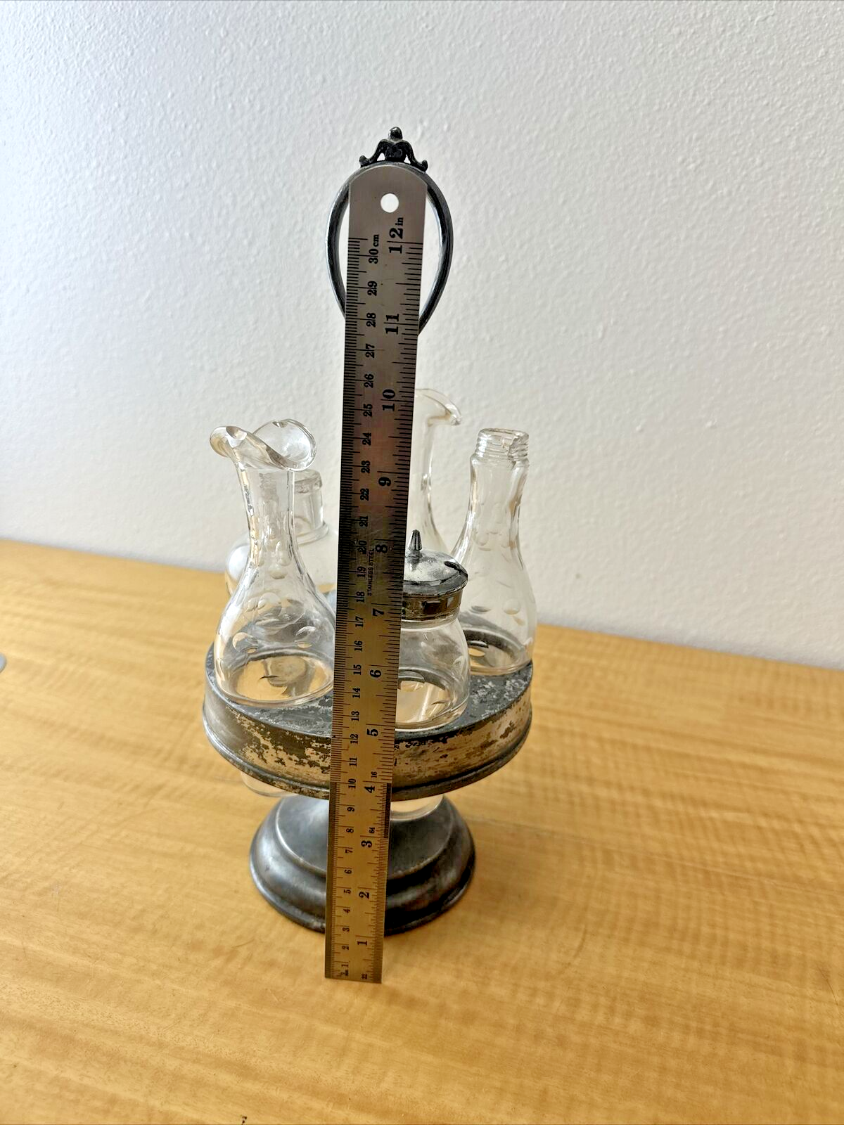VICTORIAN CASTOR CONDIMENT CRUET SET SILVER PLATE STAND w/ (5) ETCHED BOTTLES